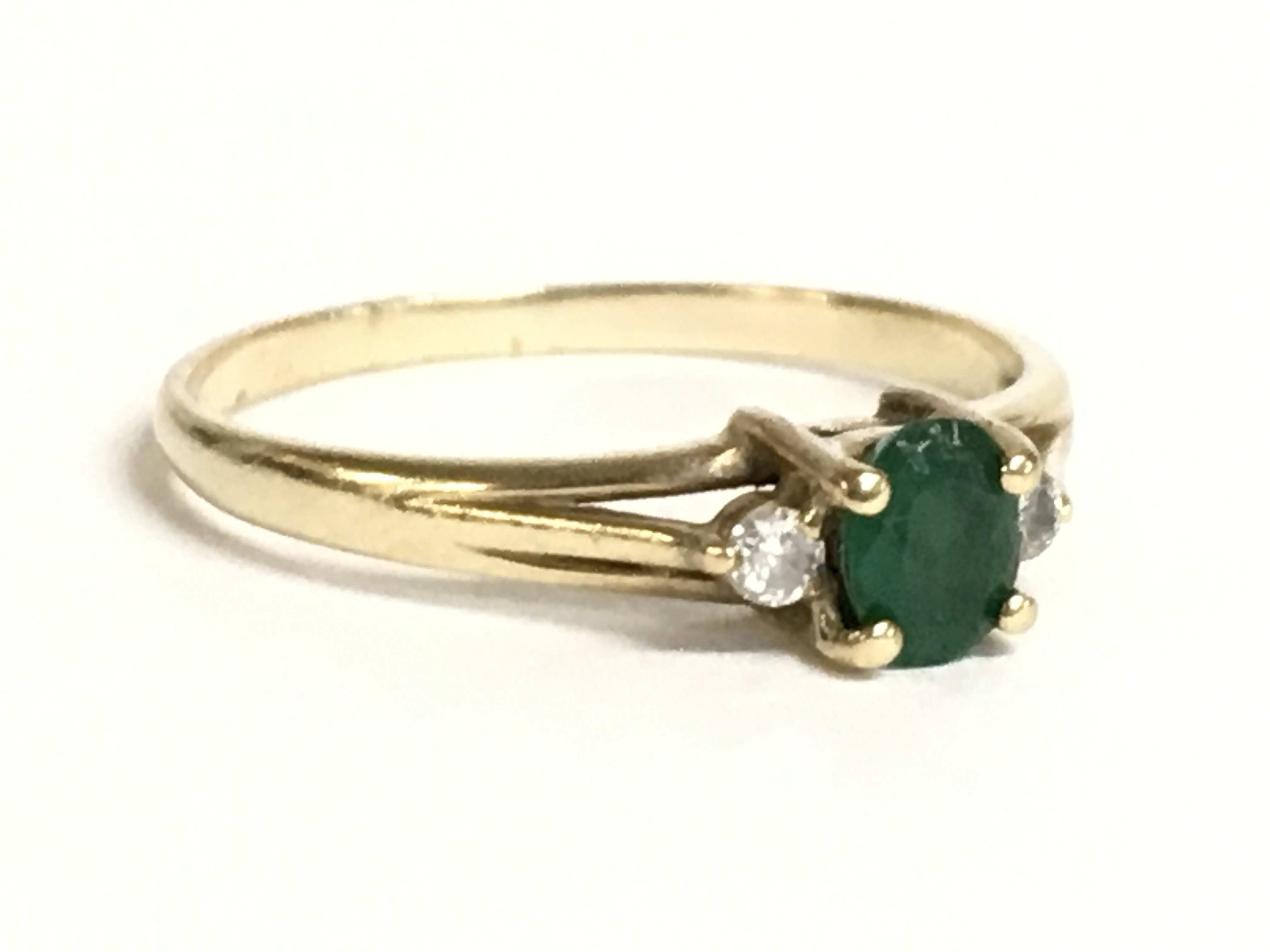 A 9 carat gold ring set with an emerald stone and small diamonds. Size P. 1.6g Postage category A