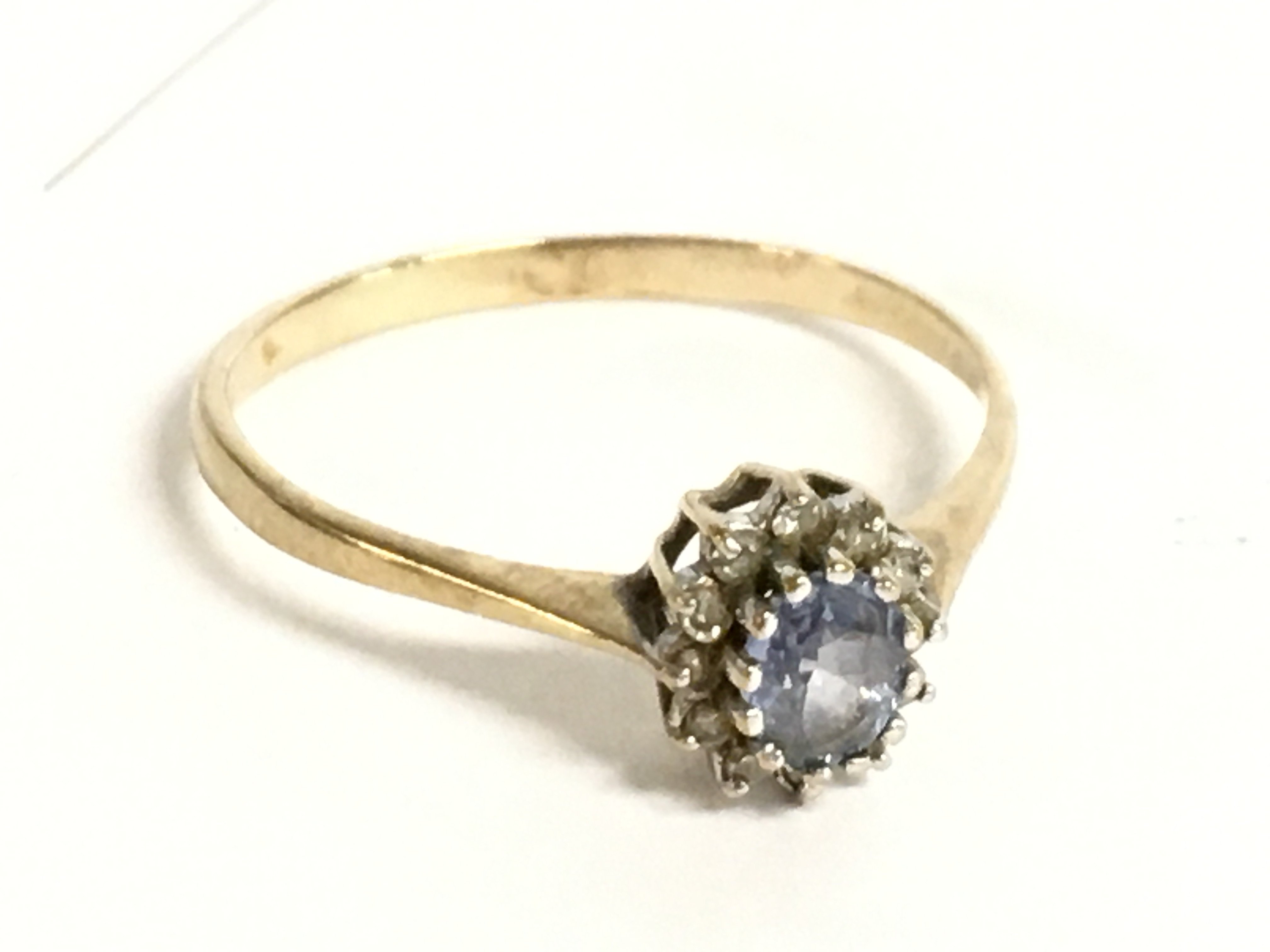 A 9 carat gold ring set with an aquamarine stone and diamond shards. Size R. 1.6g Postage category a