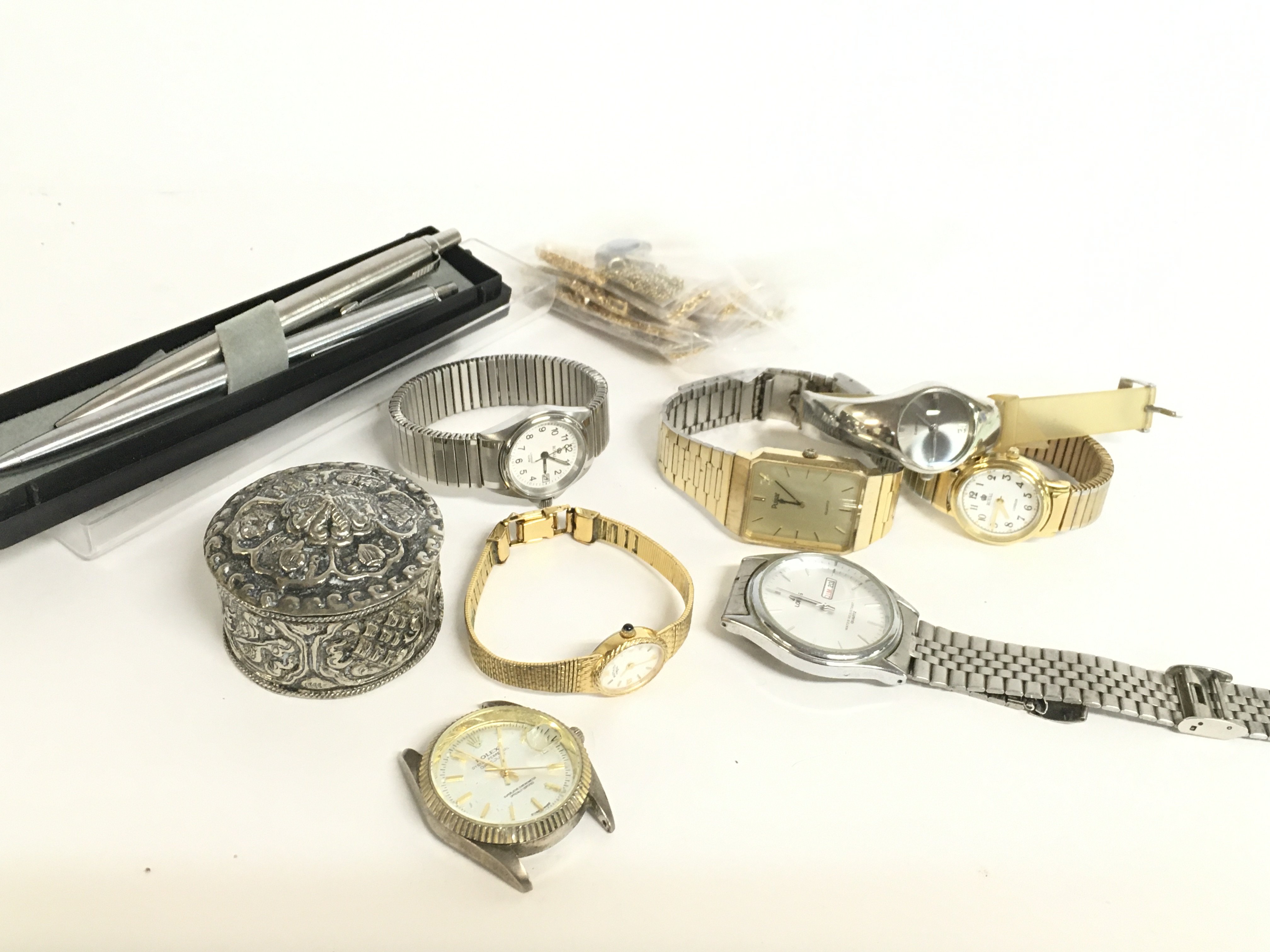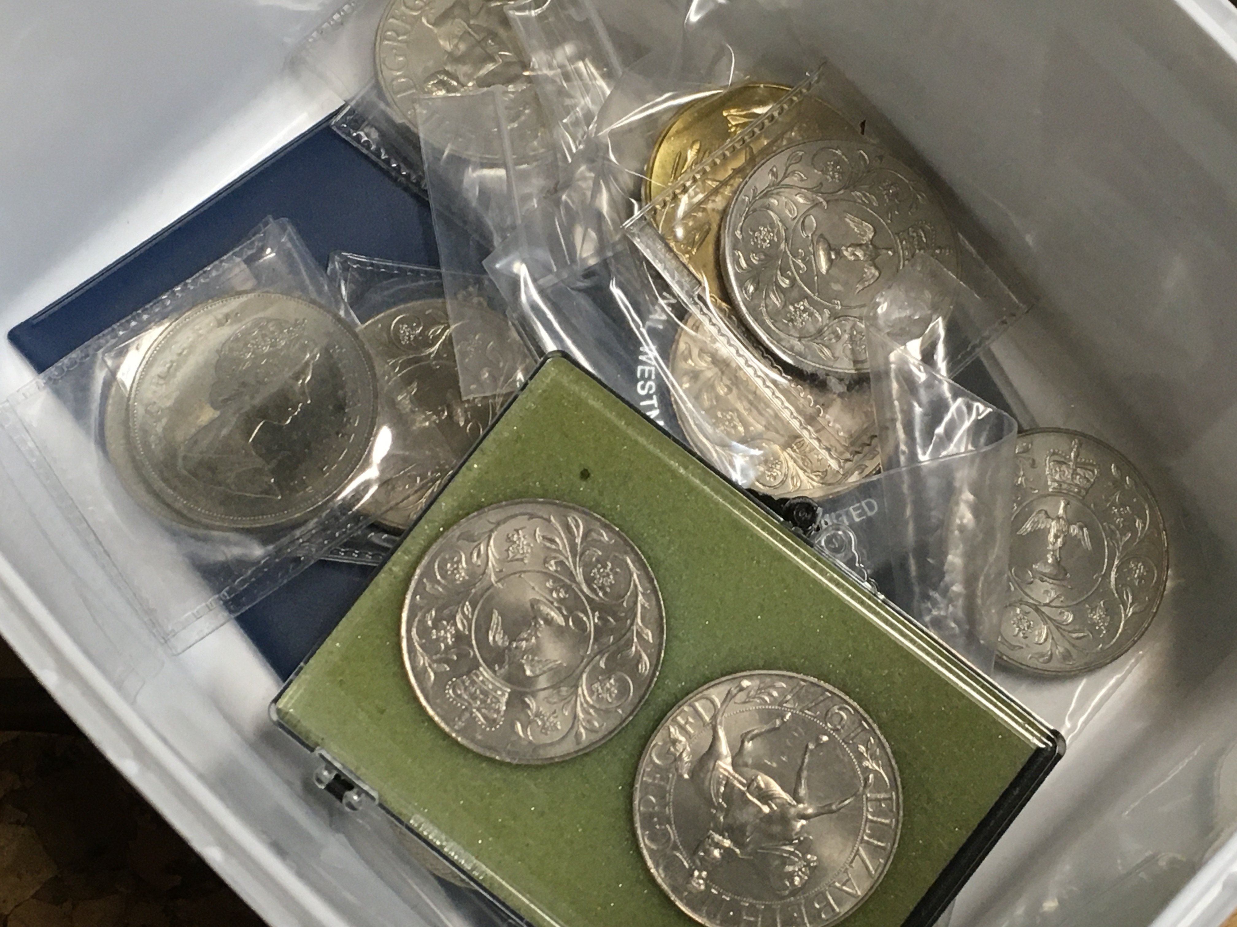 Commemorative crowns, watches, costume jewellery. This lot cannot be posted