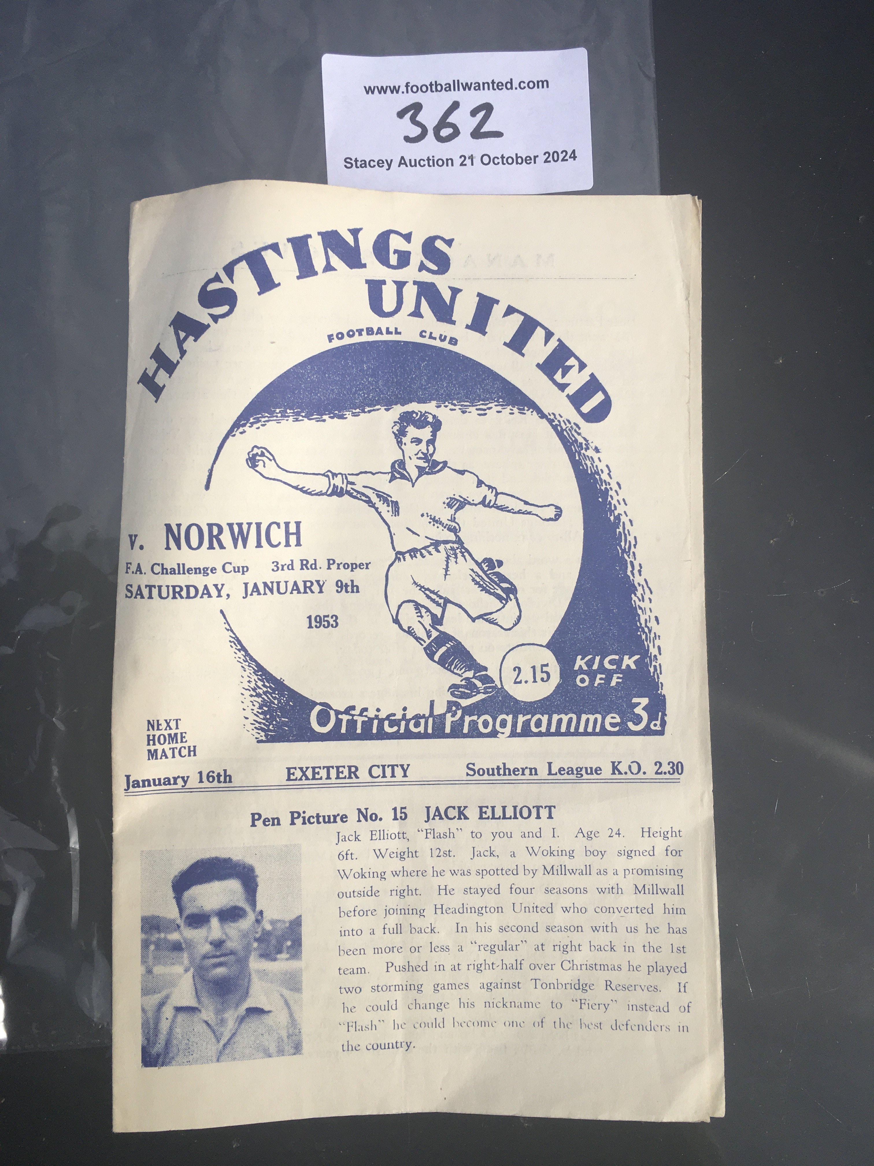 52/53 Hastings Utd v Norwich City FA Cup Football Programme: Excellent condition 3rd round match with no team changes.