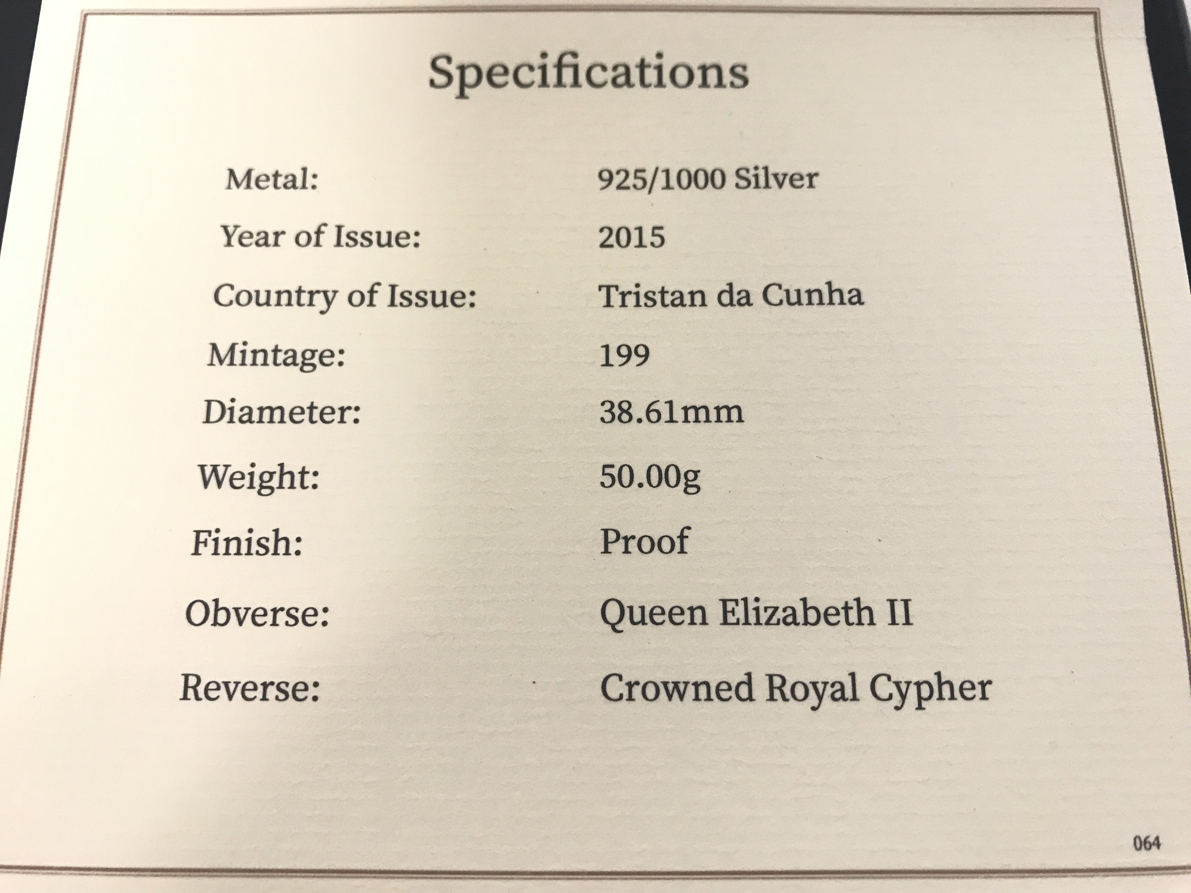 A cased 2015 Tristan Da Cunha £5 silver Piedfort coin. Shipping category A.