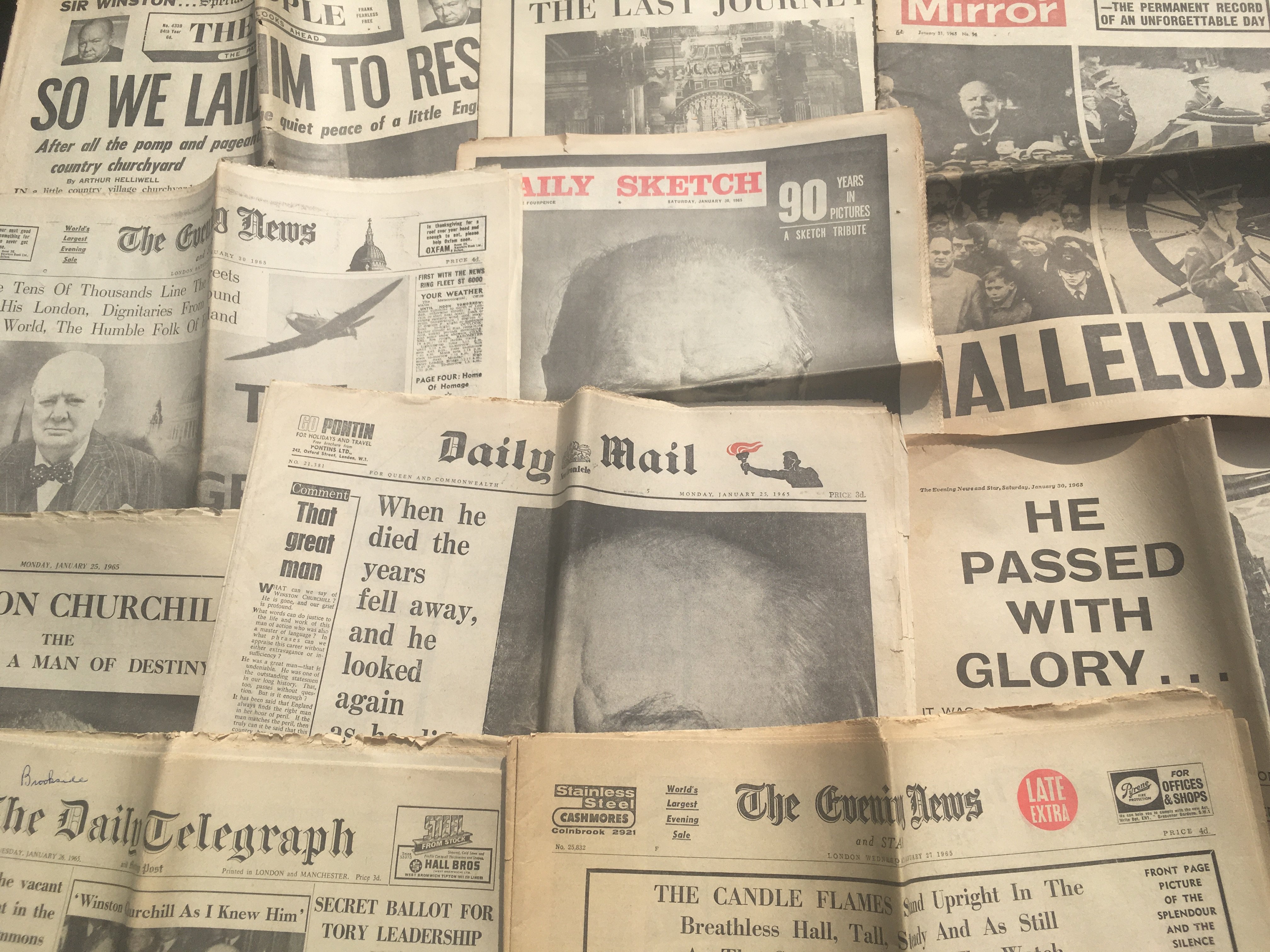 Winston Churchills Funeral Newspaper Collection: Original 1965 newspapers from the Telegraph, Mail, Evening News, Daily Sketch, Sunday Mirror and more. (10)