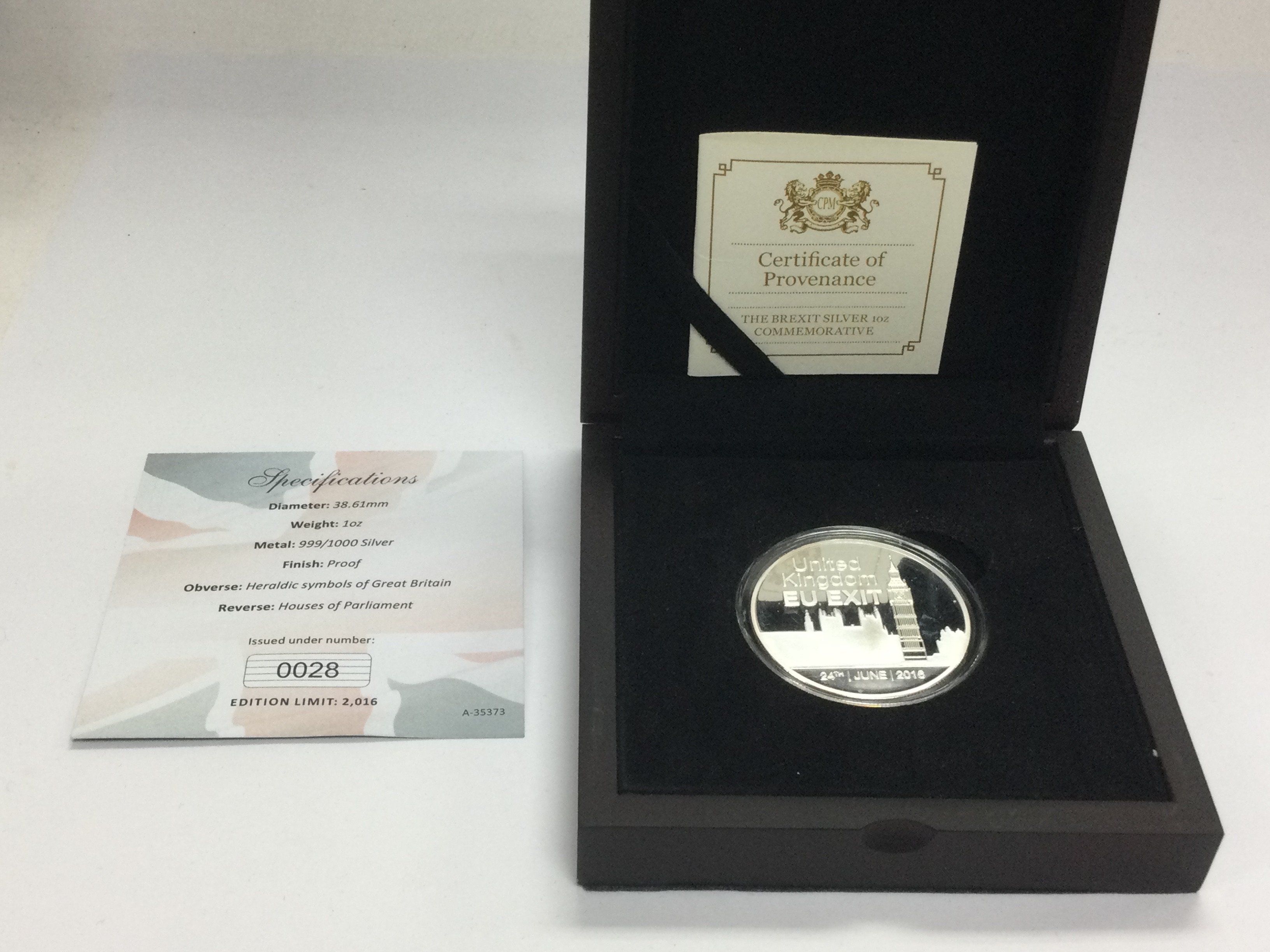 A cased limited edition Brexit transition 1oz silver proof coin, low number 028/2020. Shipping category A.