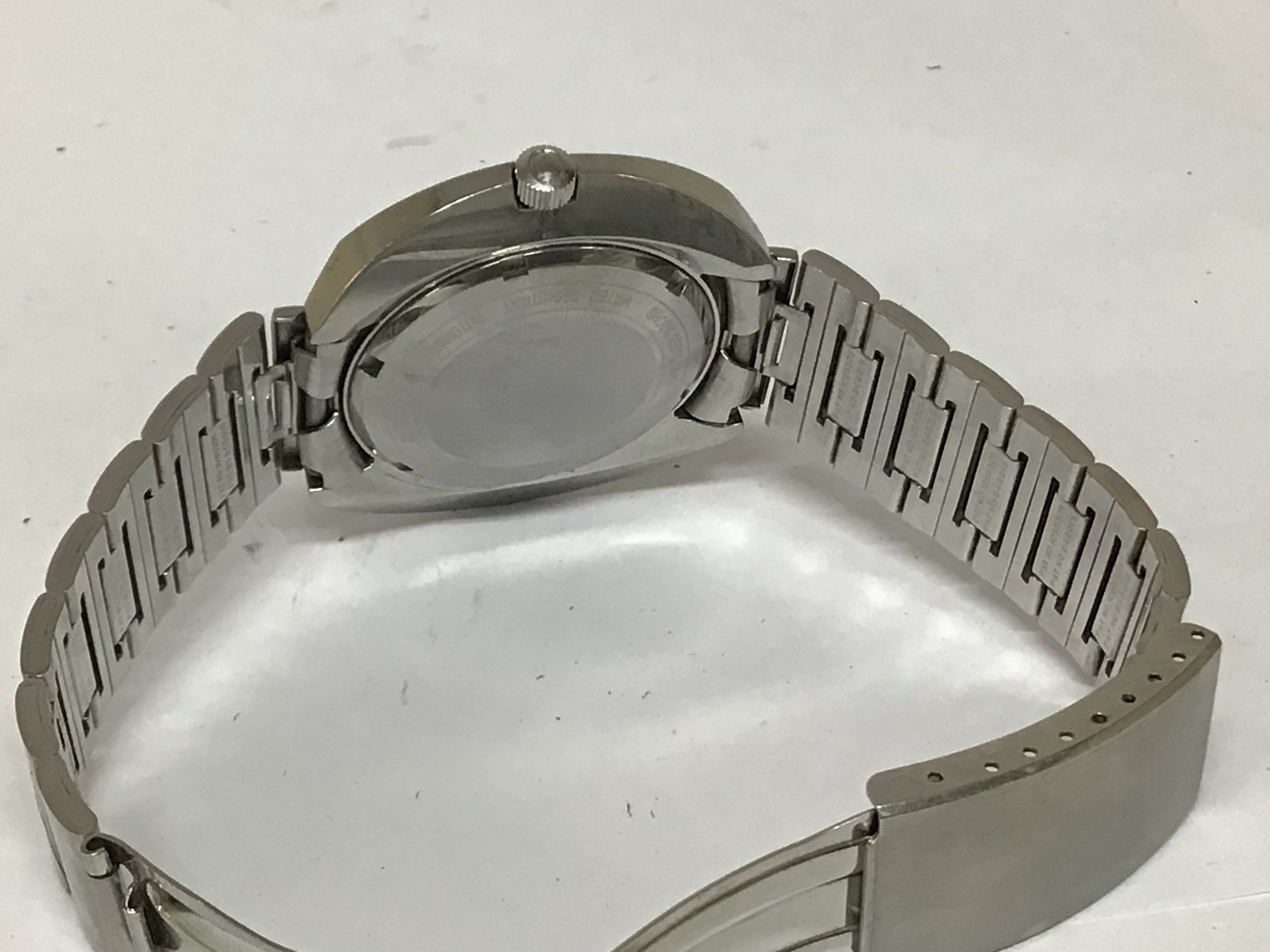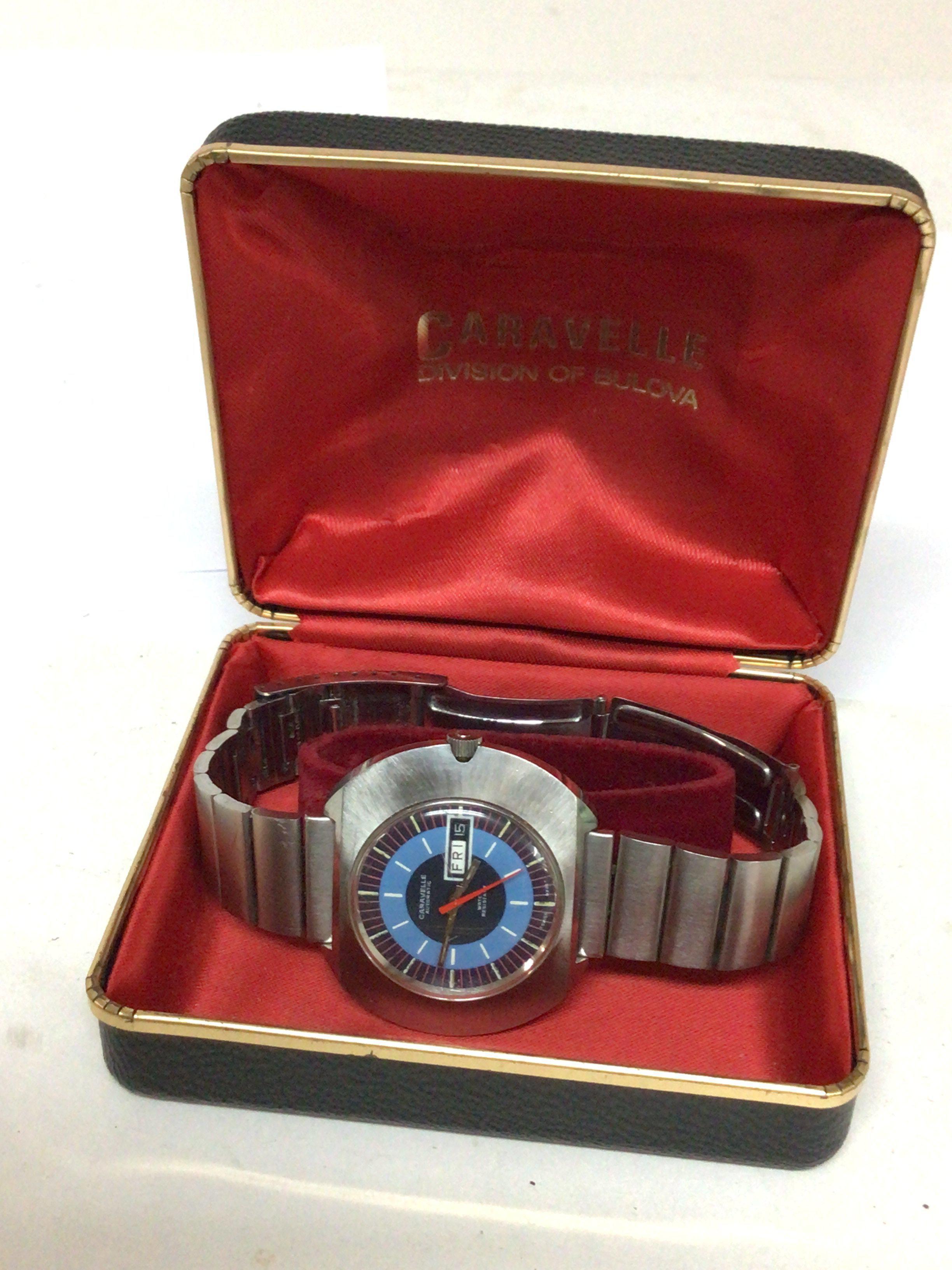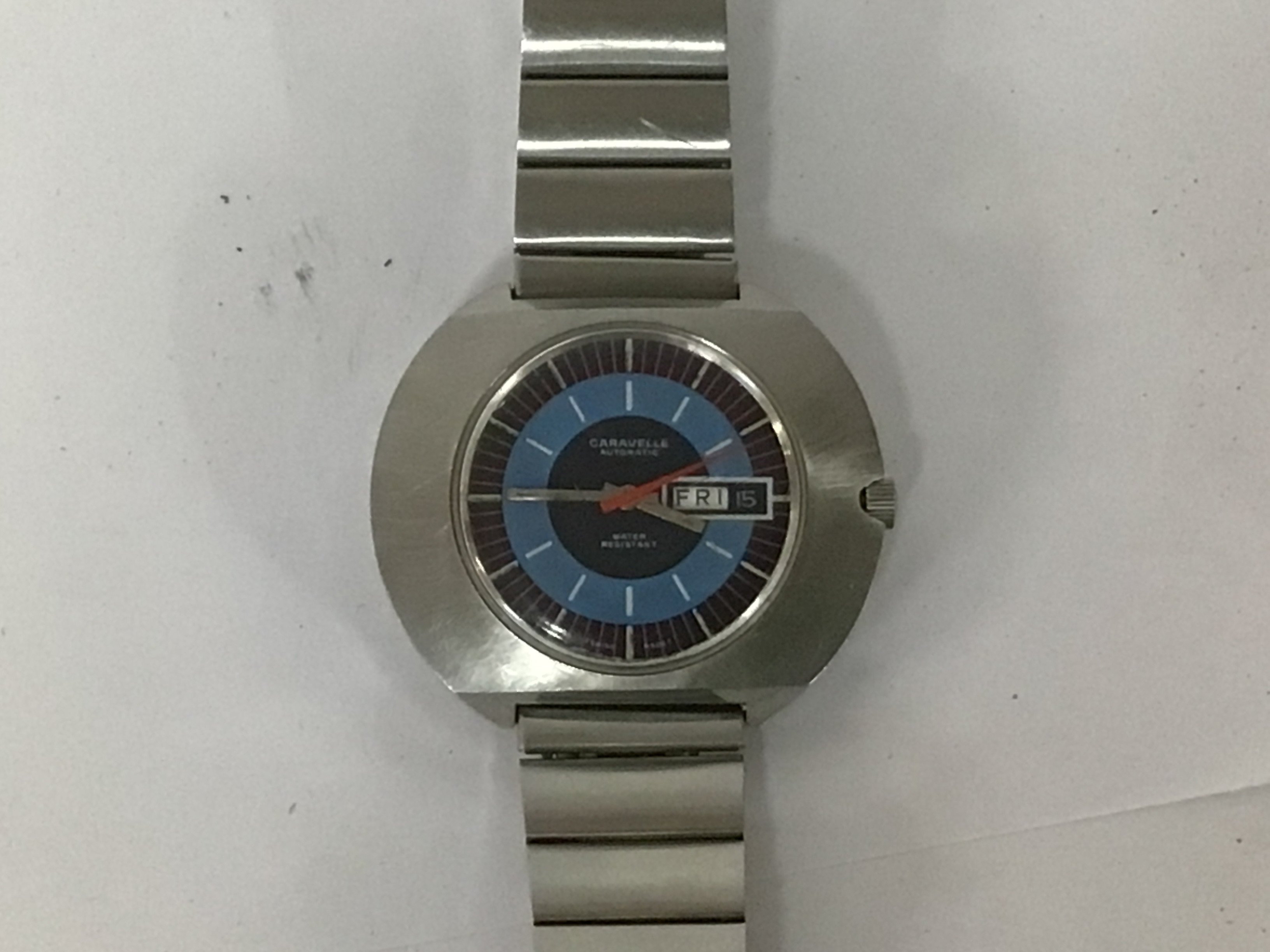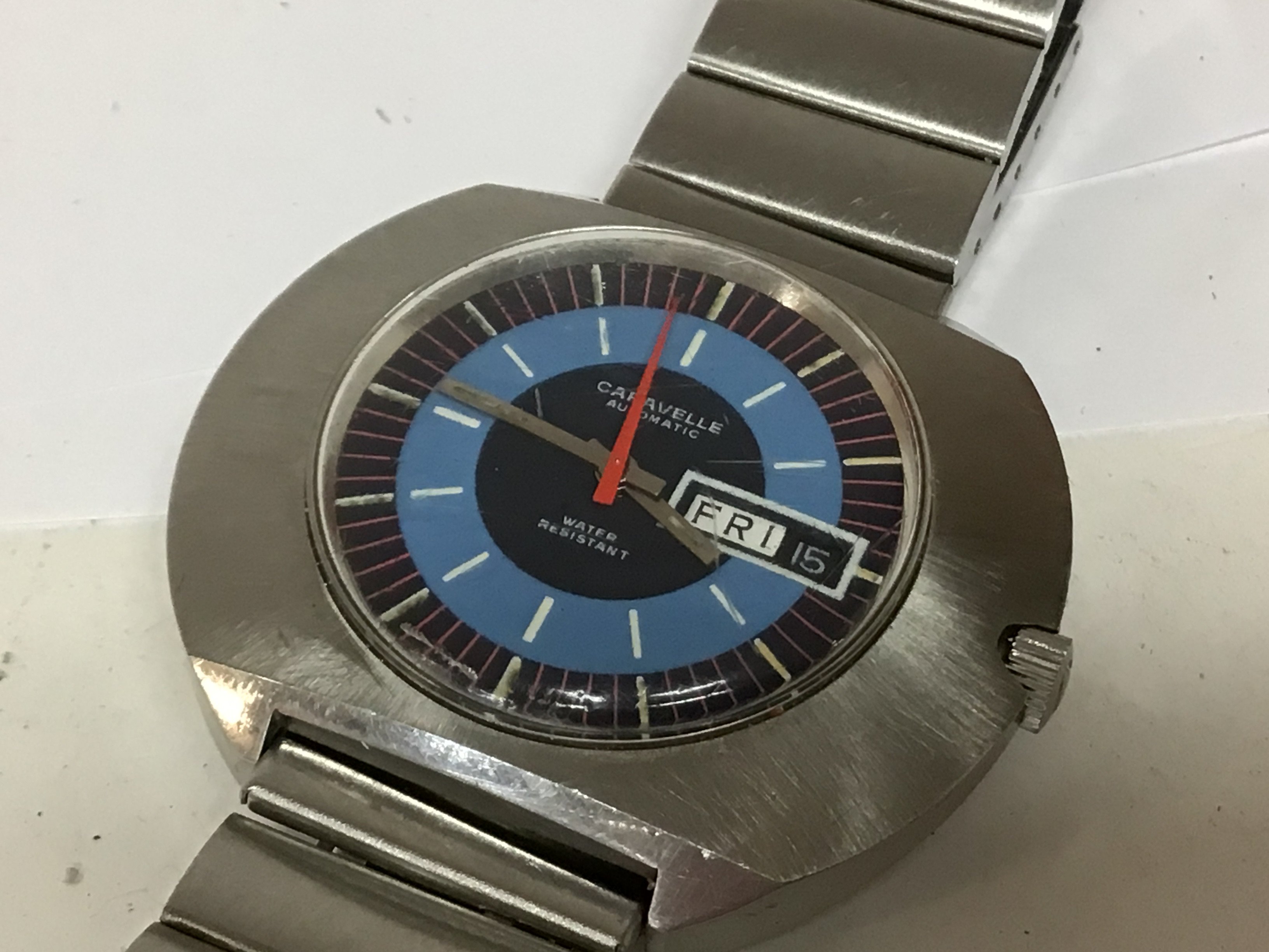 A Gents Caravelle Division of Buolva watch Automatic wind with a shaped steel wide edge modern design case the dial with a blue band red markers and day date aperture seen working with box few minor scratches.