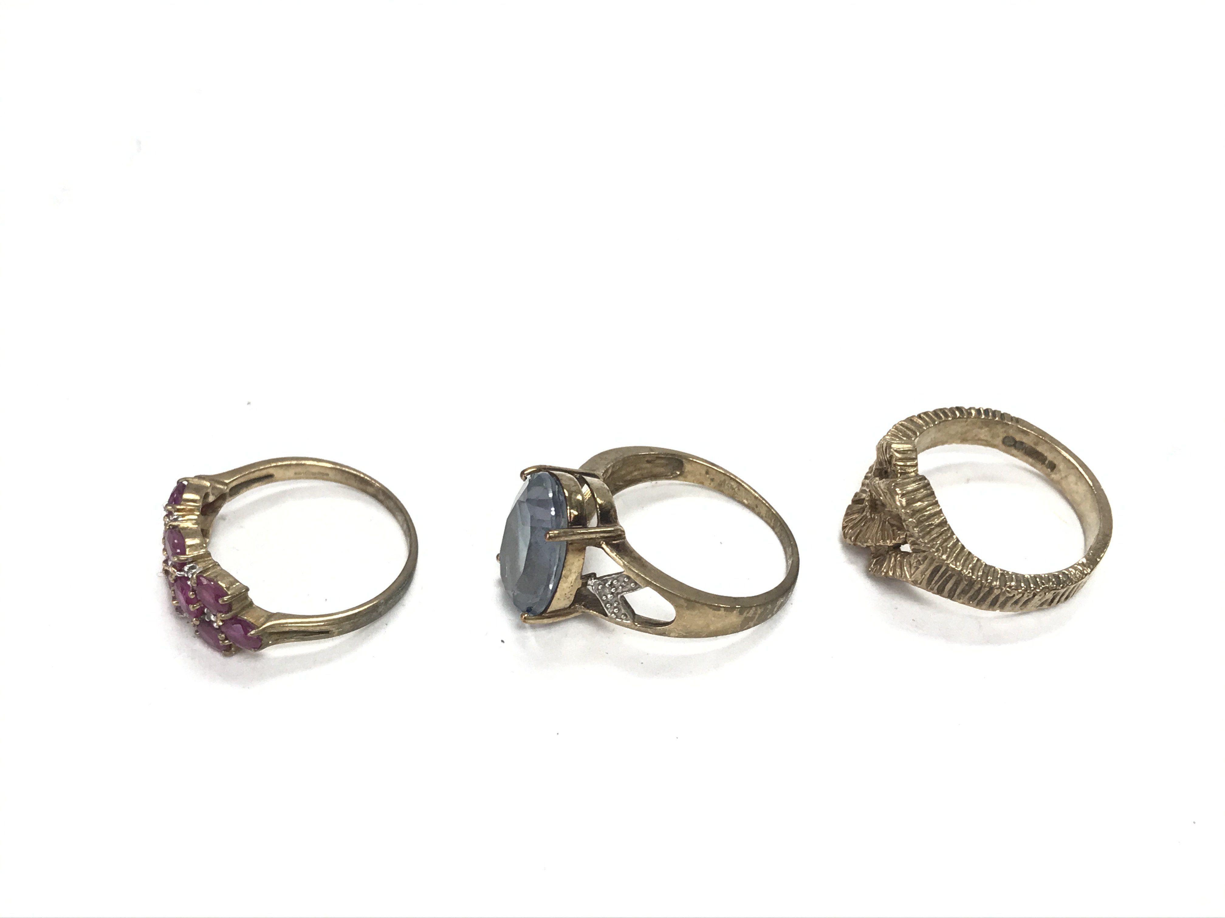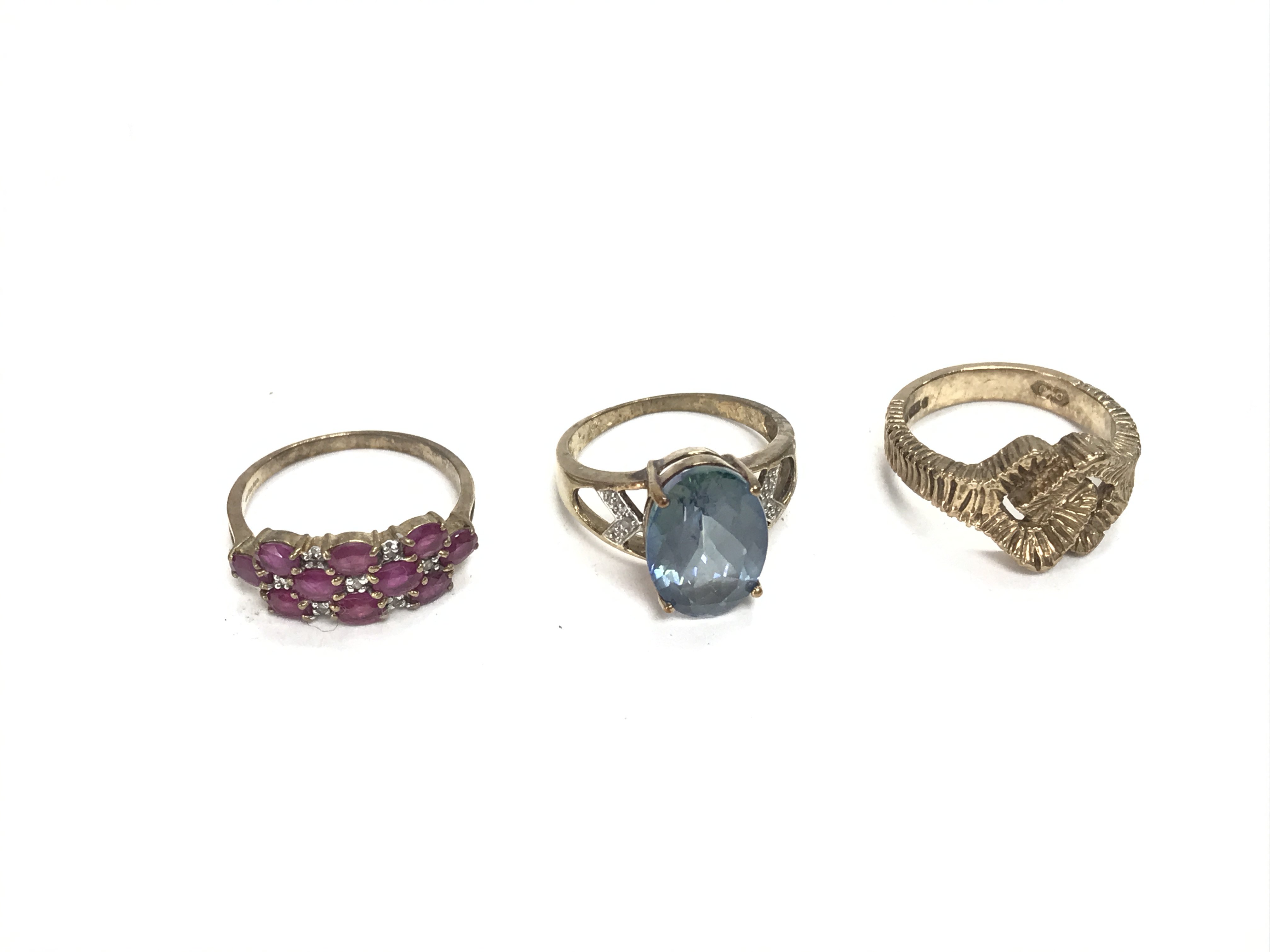 Three 9ct gold rings including a Ruby one size P a topaz size P and one other size O.11.69g