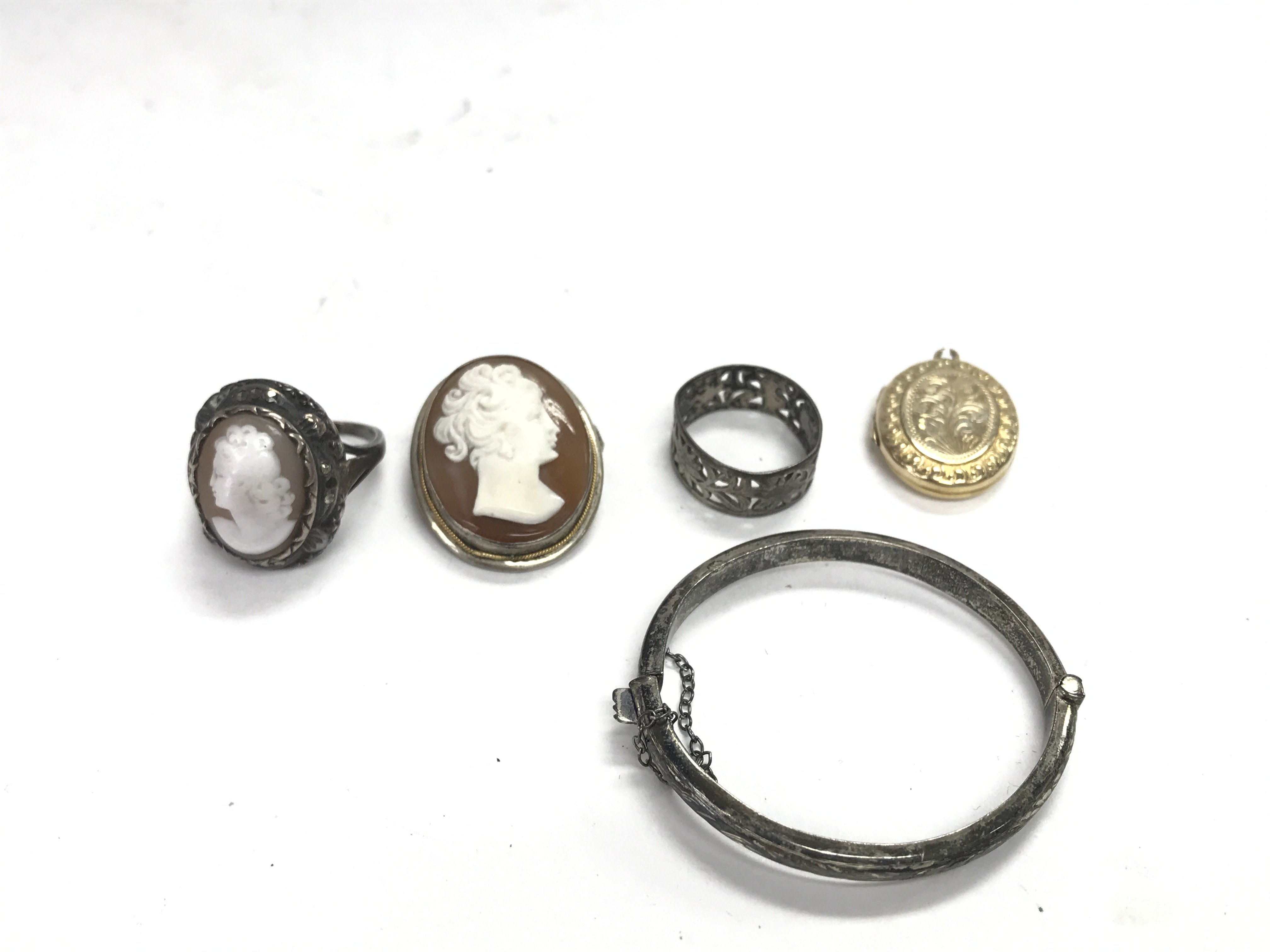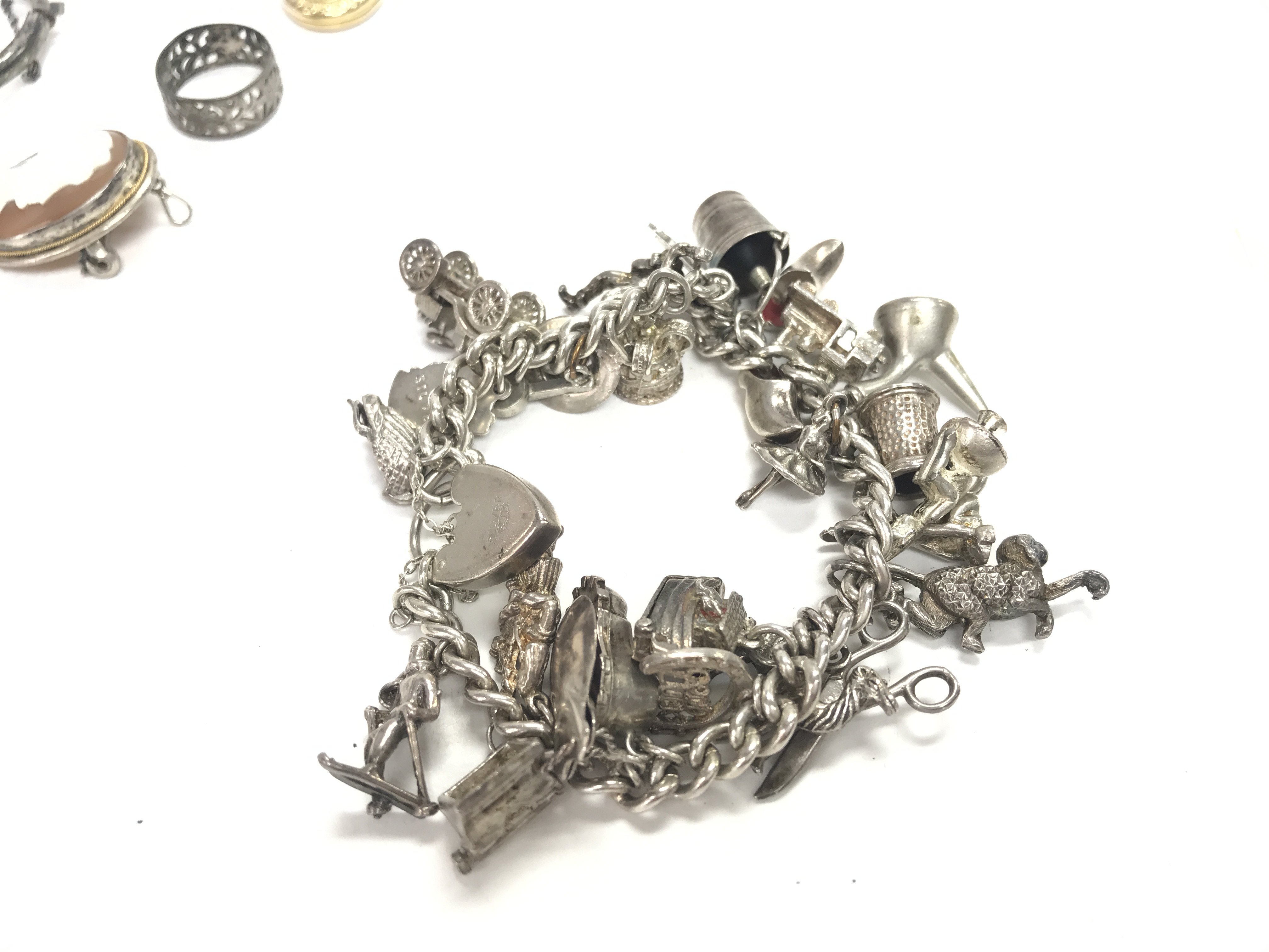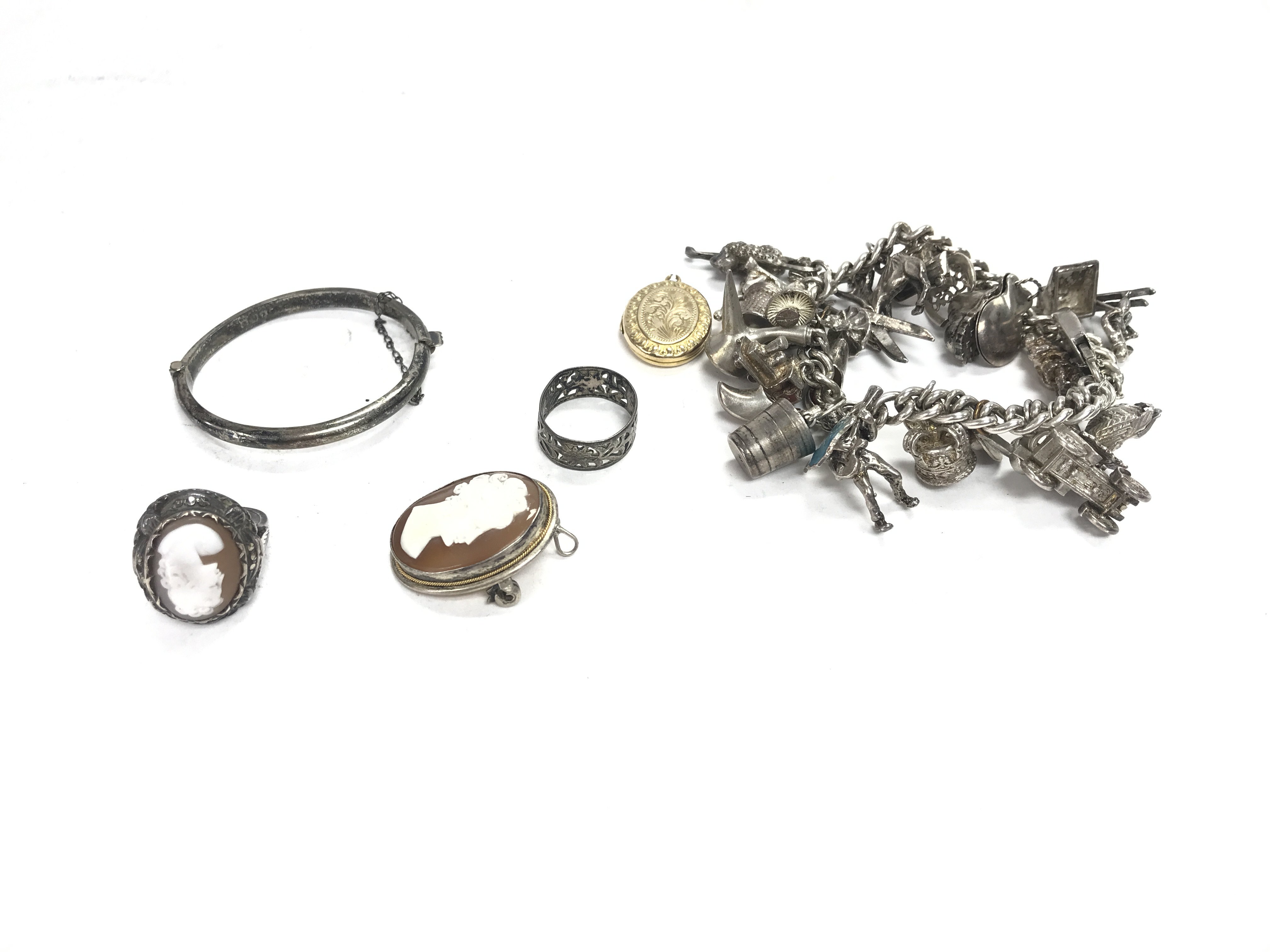 A collection of silver items including a silver charm bracelet cameo ring and broach etc Postage B