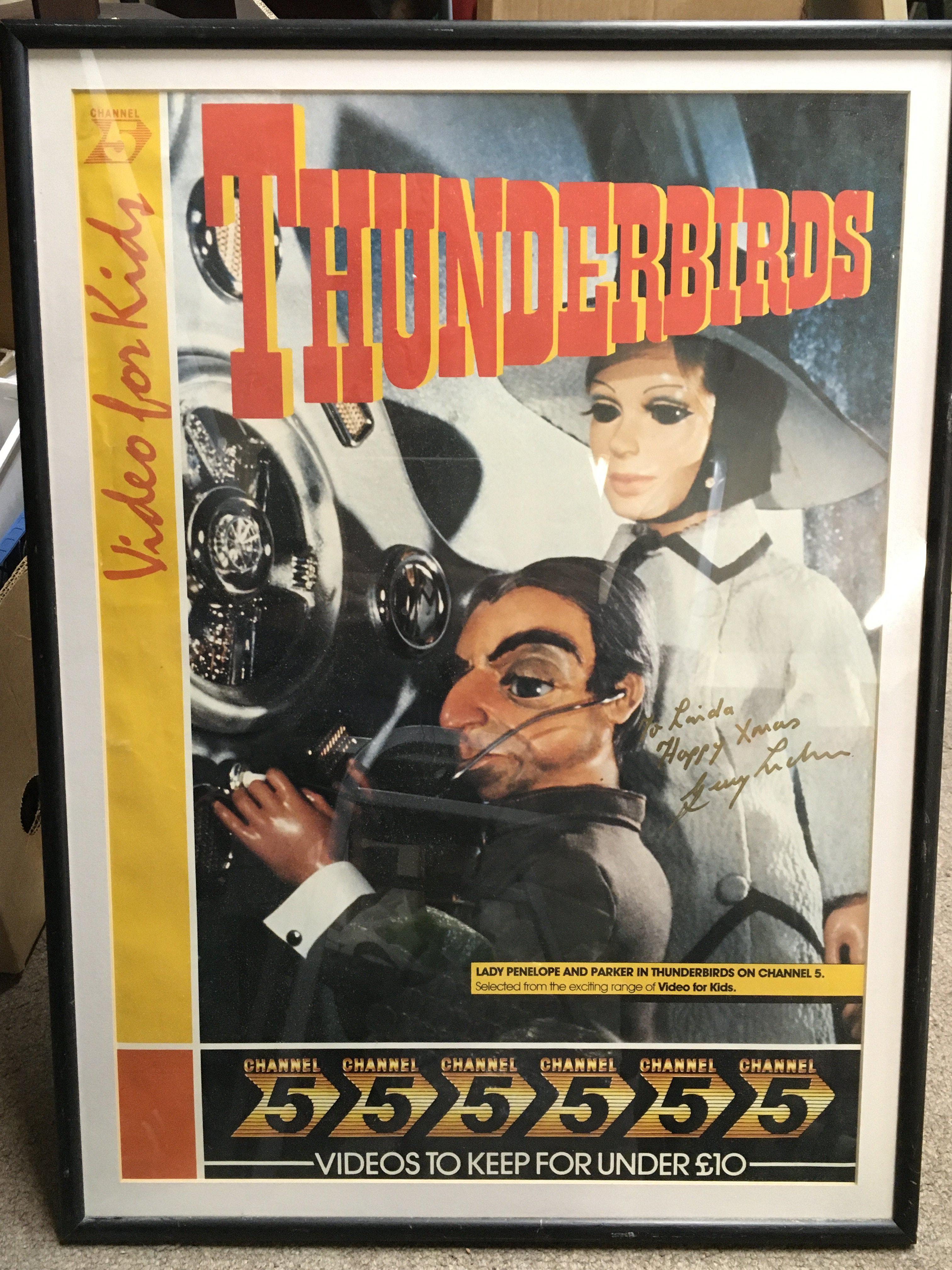 A vintage Thunderbirds Channel 5 videos poster signed by producer Gerry Anderson. Frame size 48x65cm
