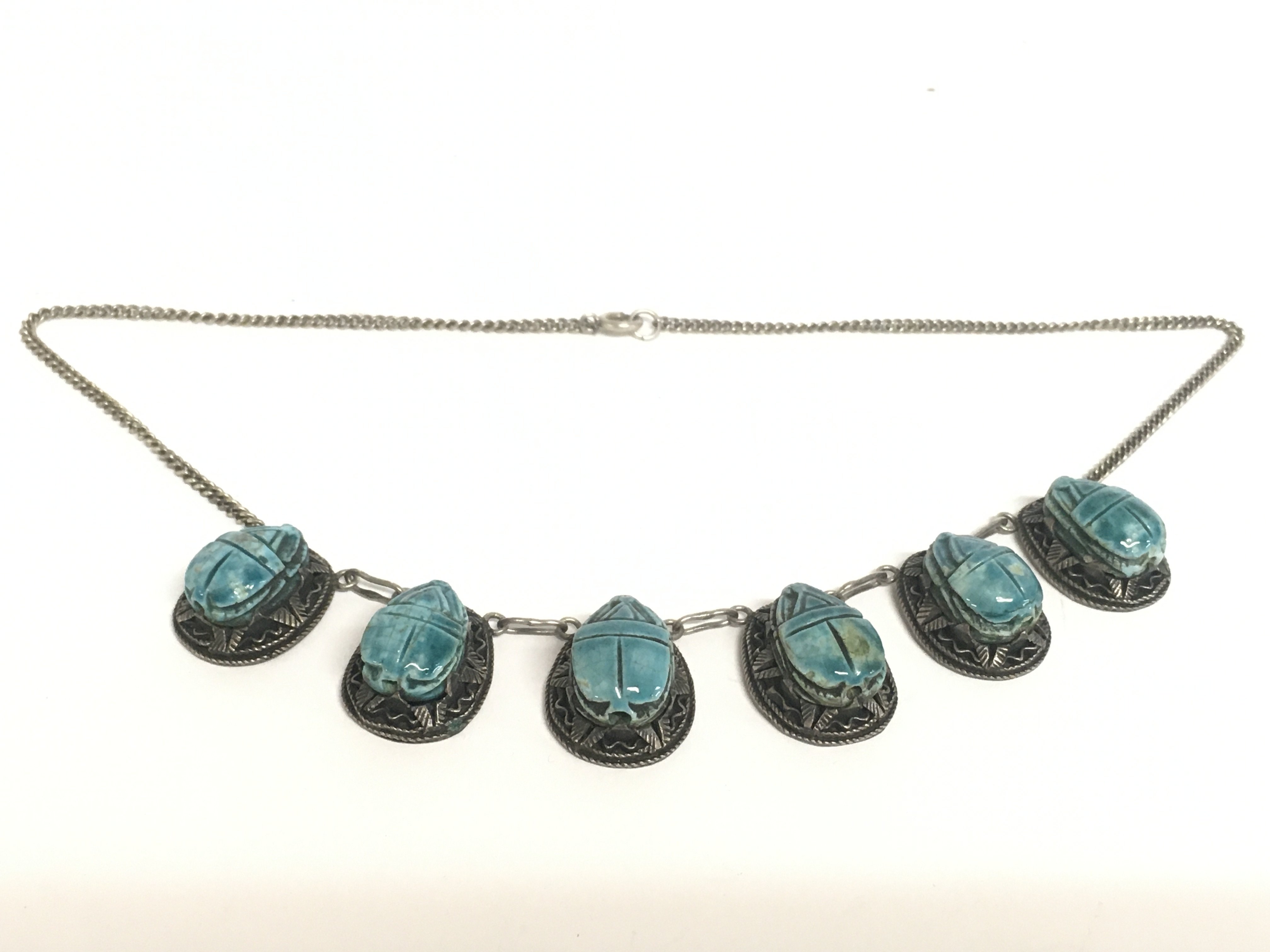 Egyptian style silver faience scarab necklace. Postage category A- NO RESERVE