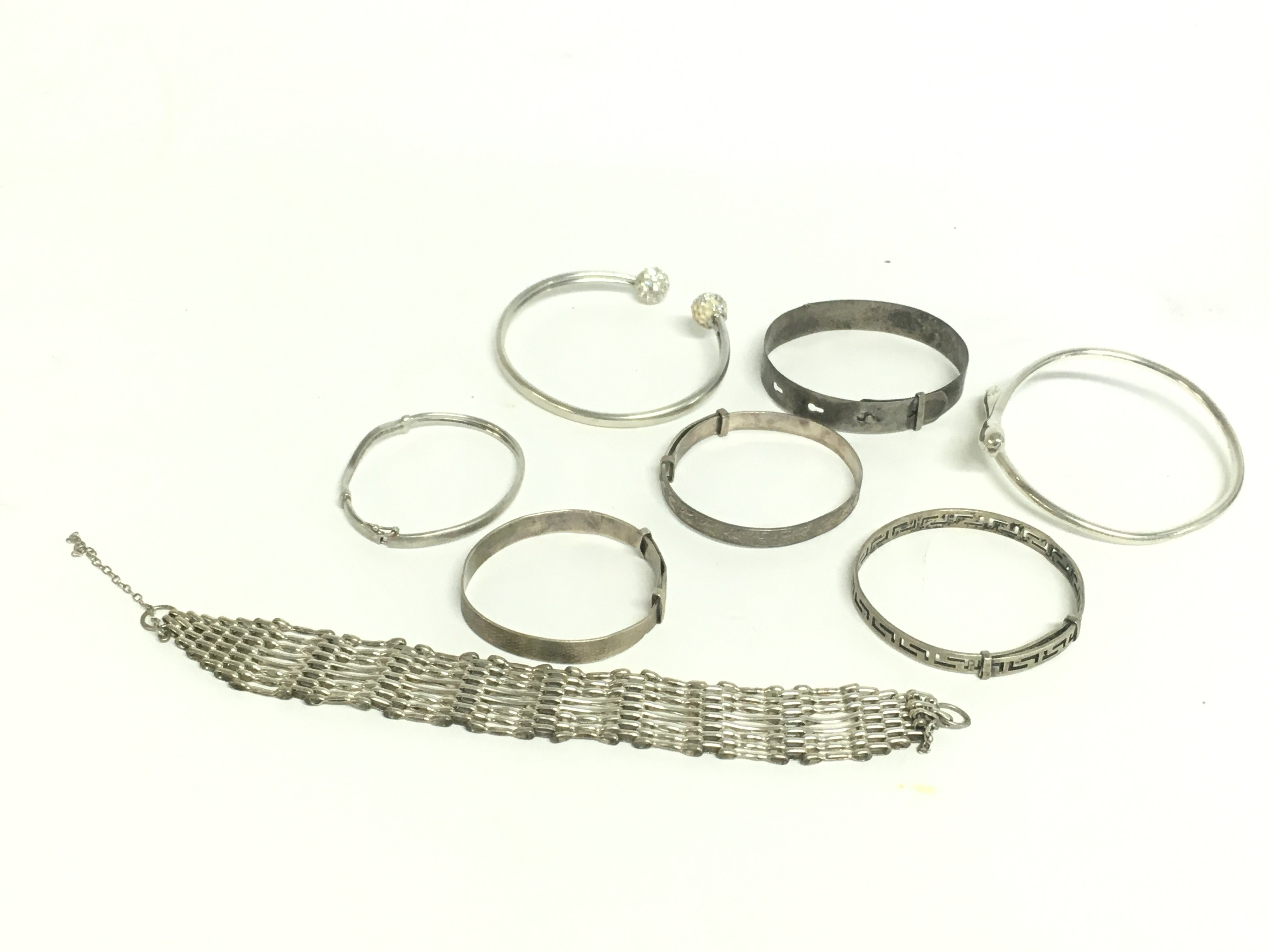 A collection of silver bangles and a gate bracelet, 75g in total. Postage category A- NO RESERVE