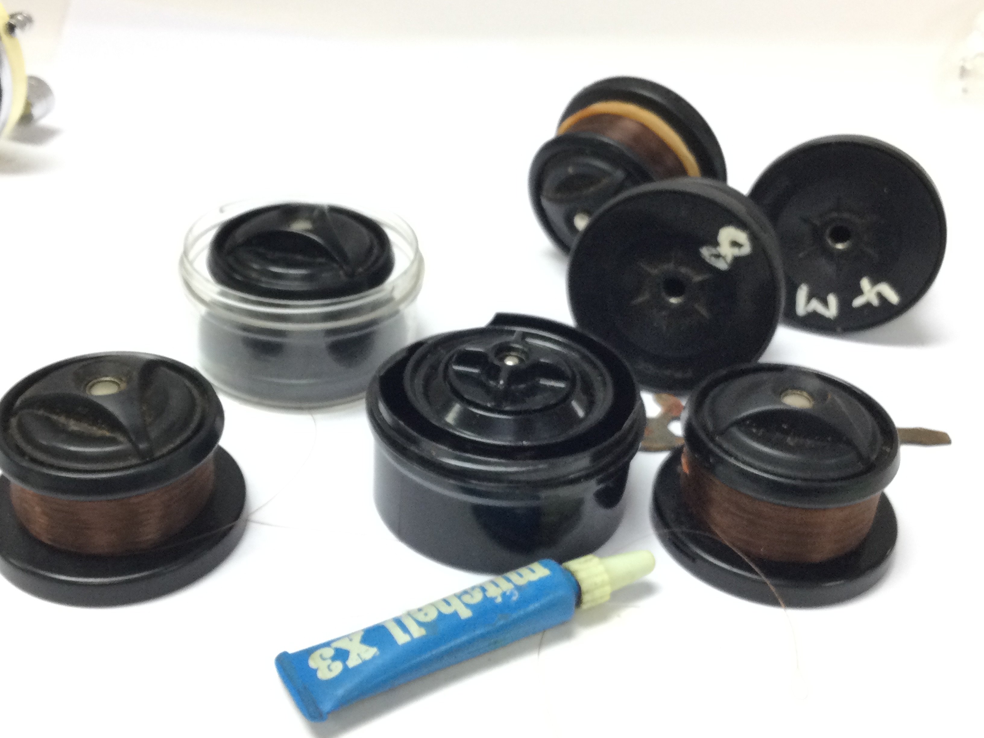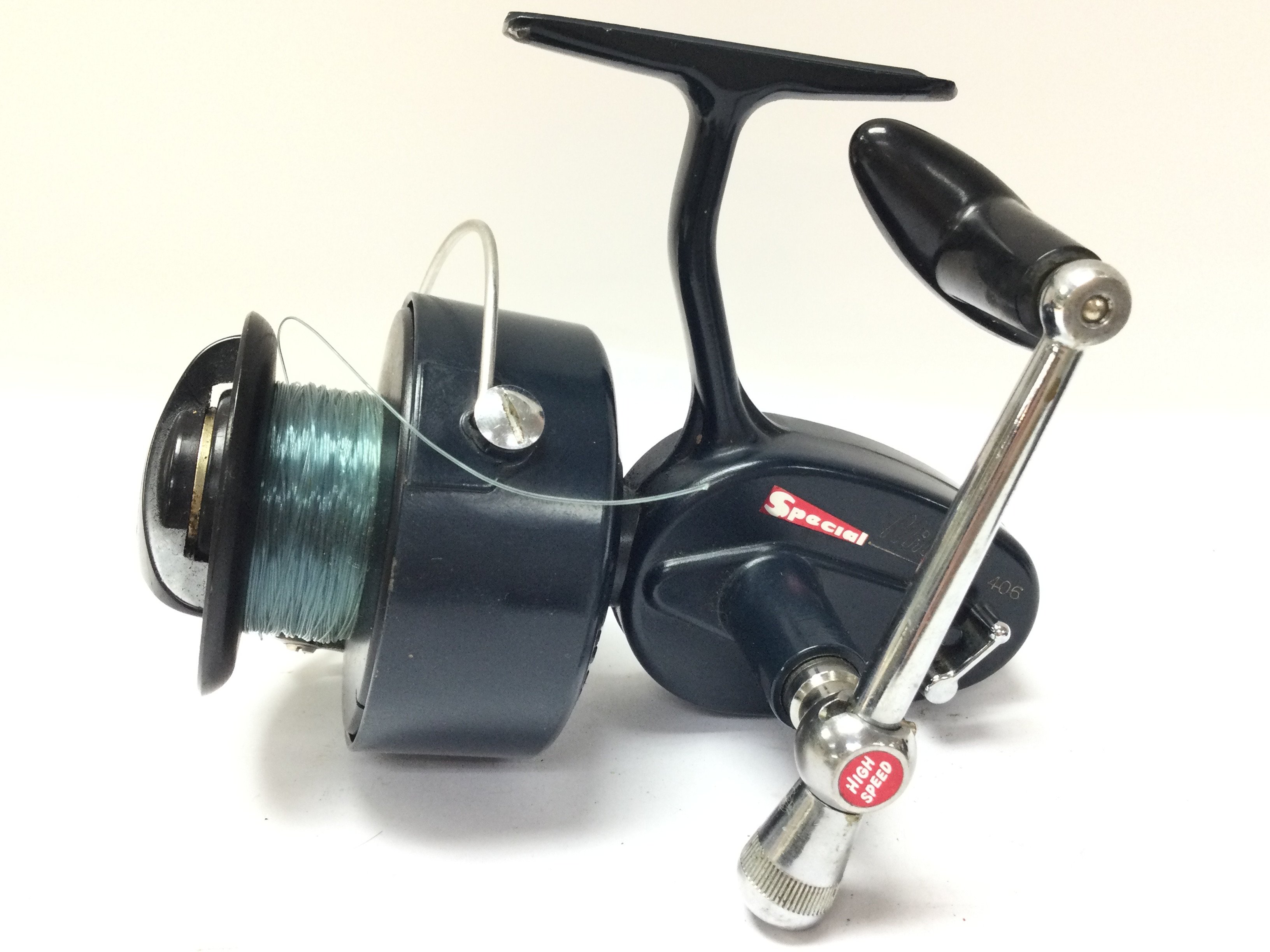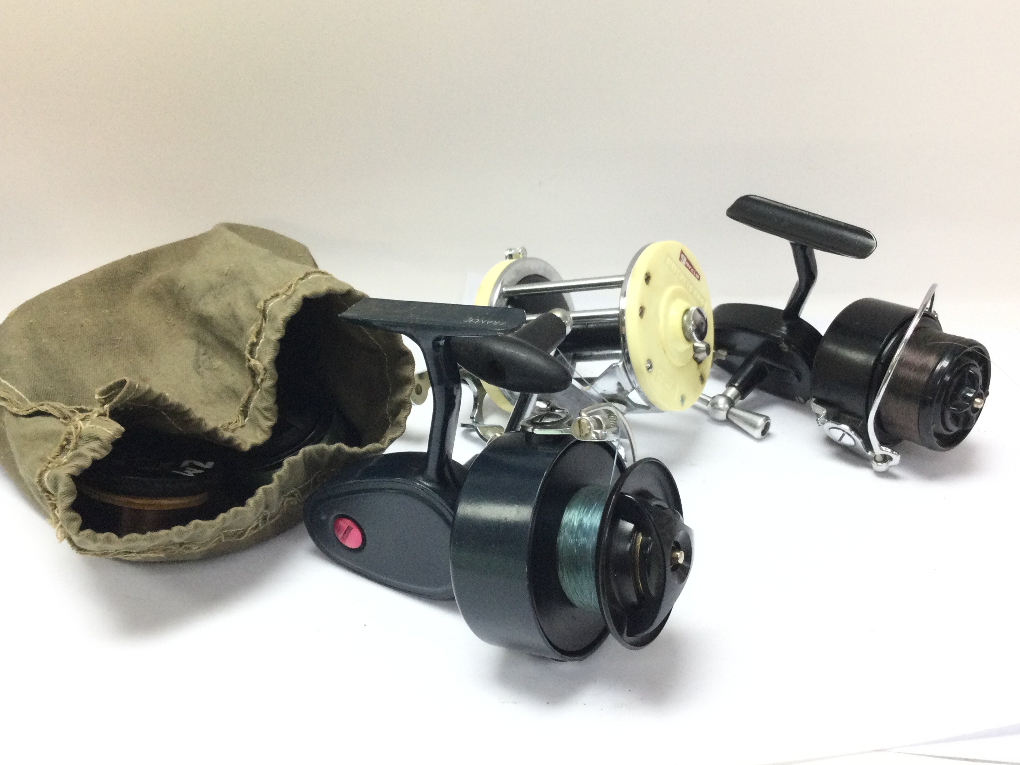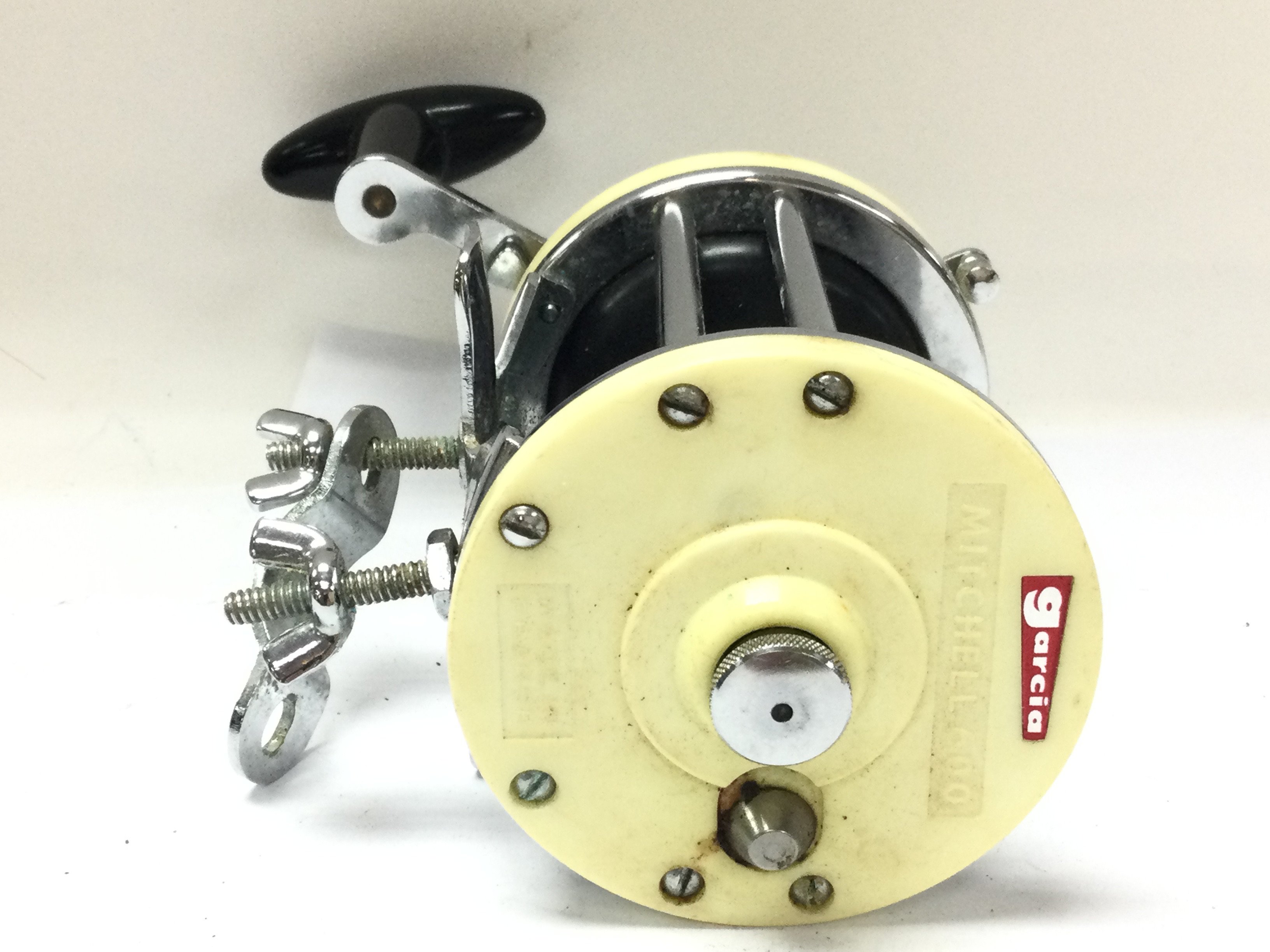 A collection of vintage Garcia fishing reels including a Mitchell 301, 600 & 406. Also including spools with fishing line.