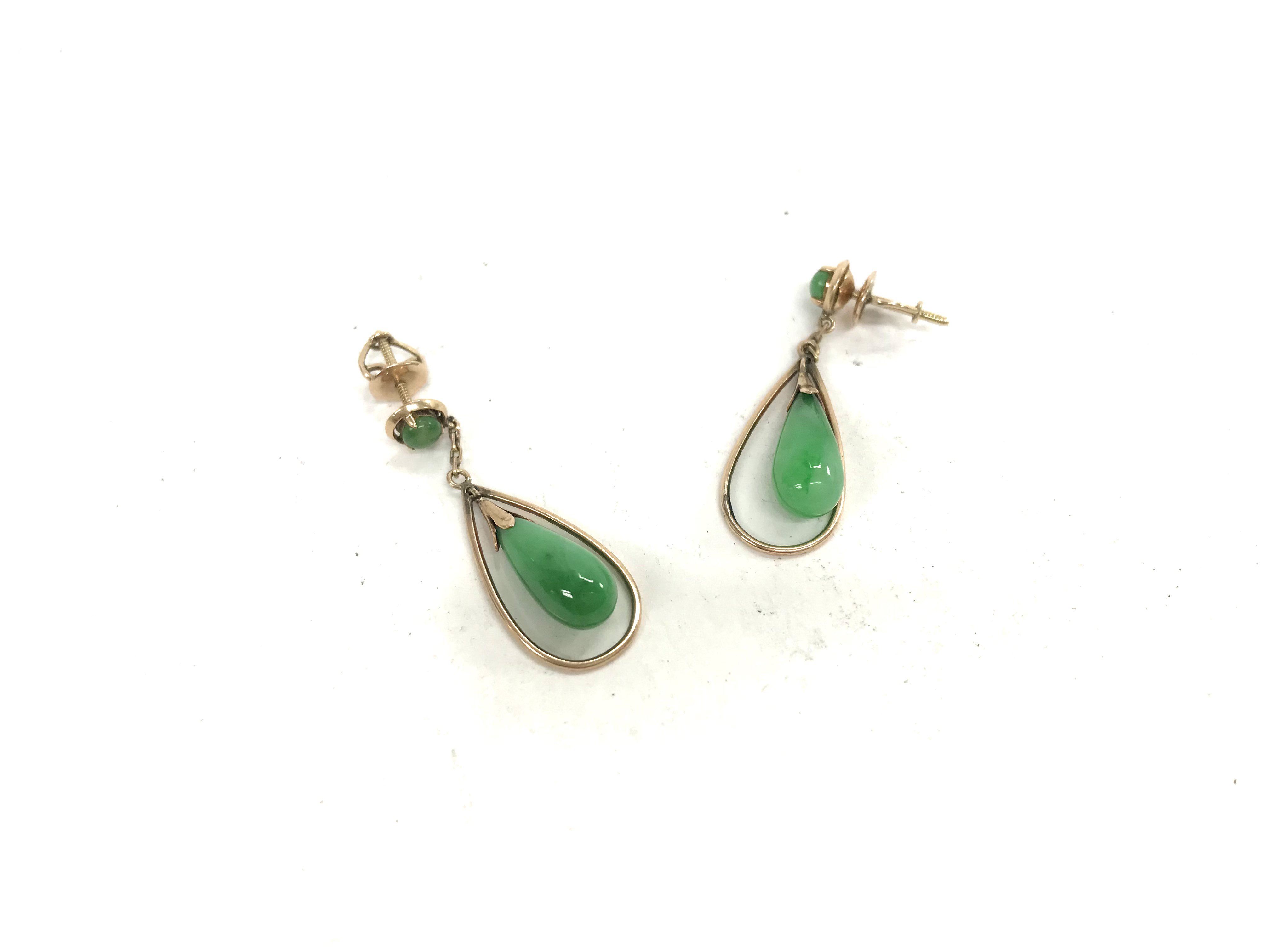 A 14ct gold pair of jade earrings. Approx weight 4.17 grams.