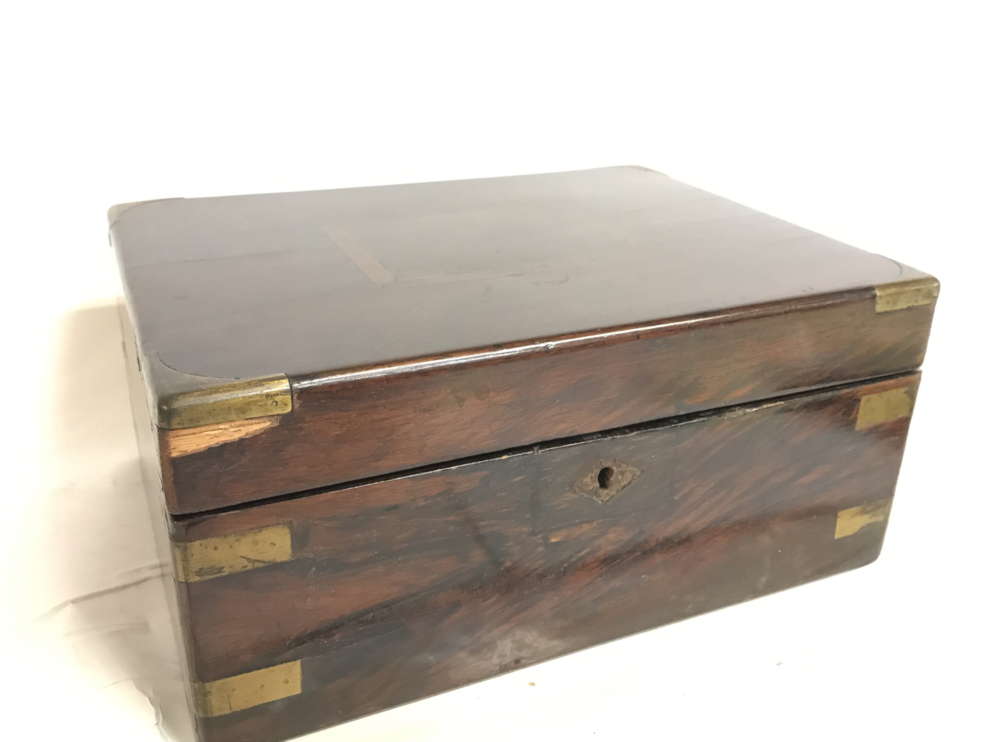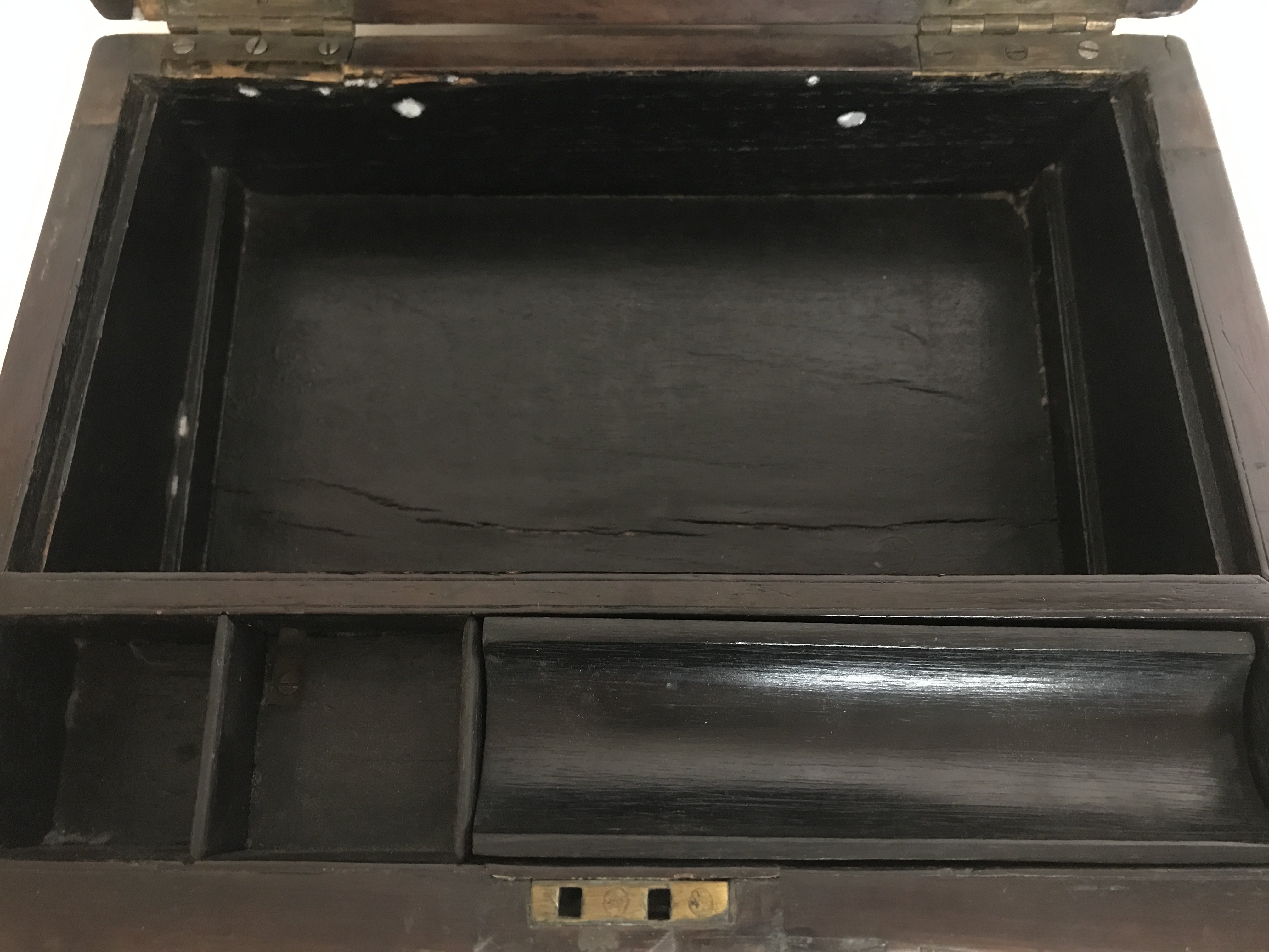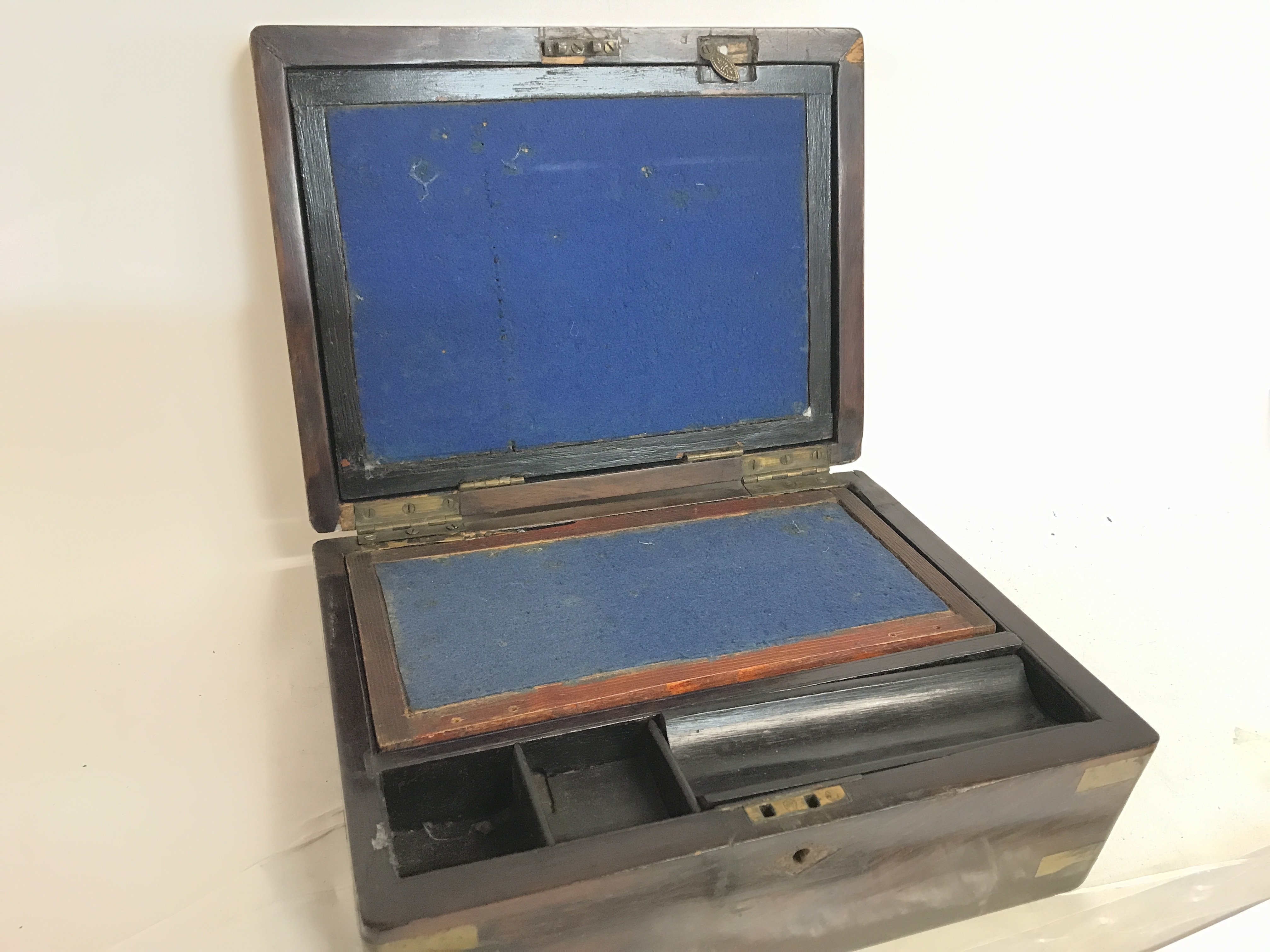 A mahogany writing box, with inlaid design. Dimensions 23x30x14cm. NO RESERVE
