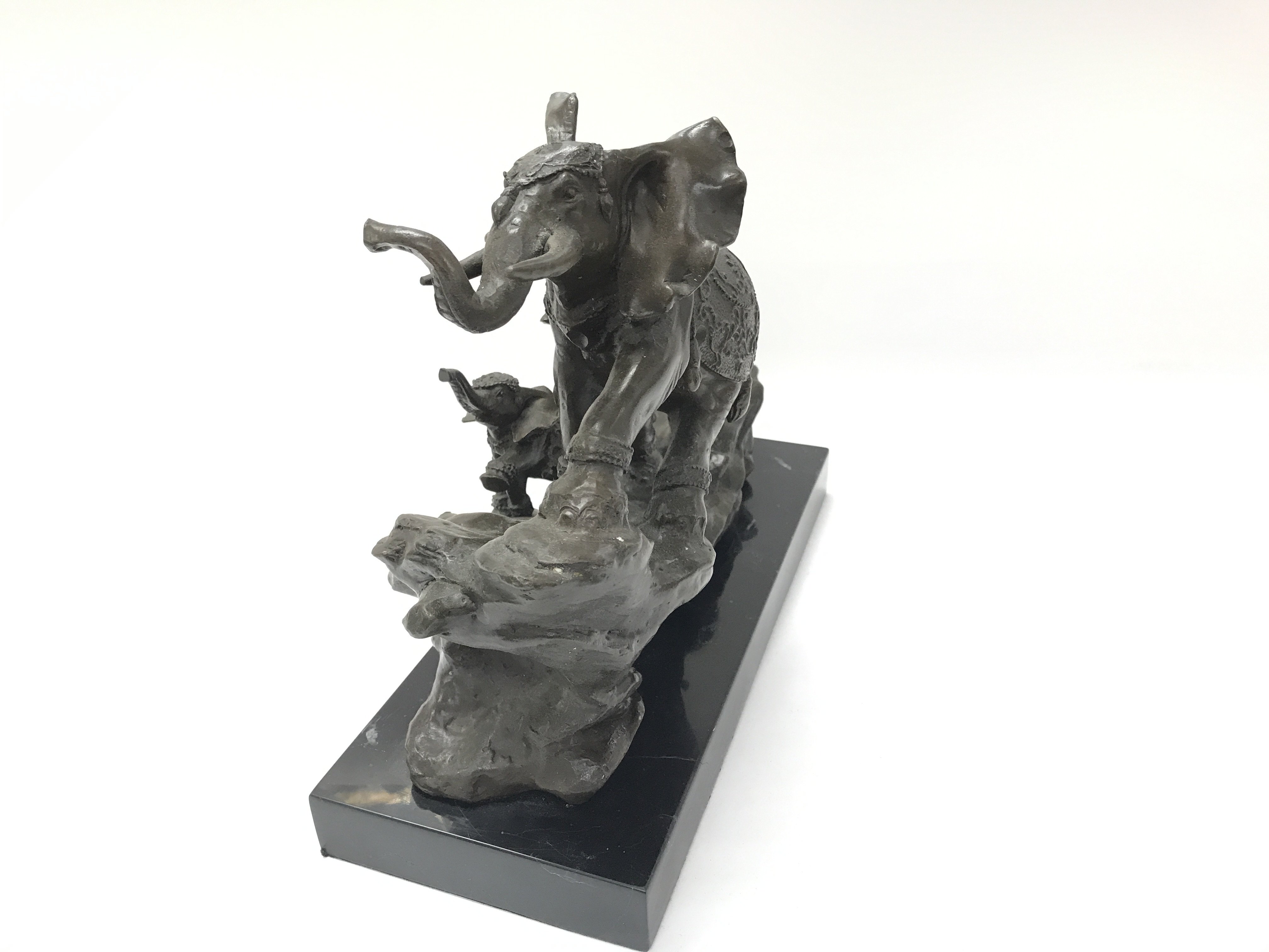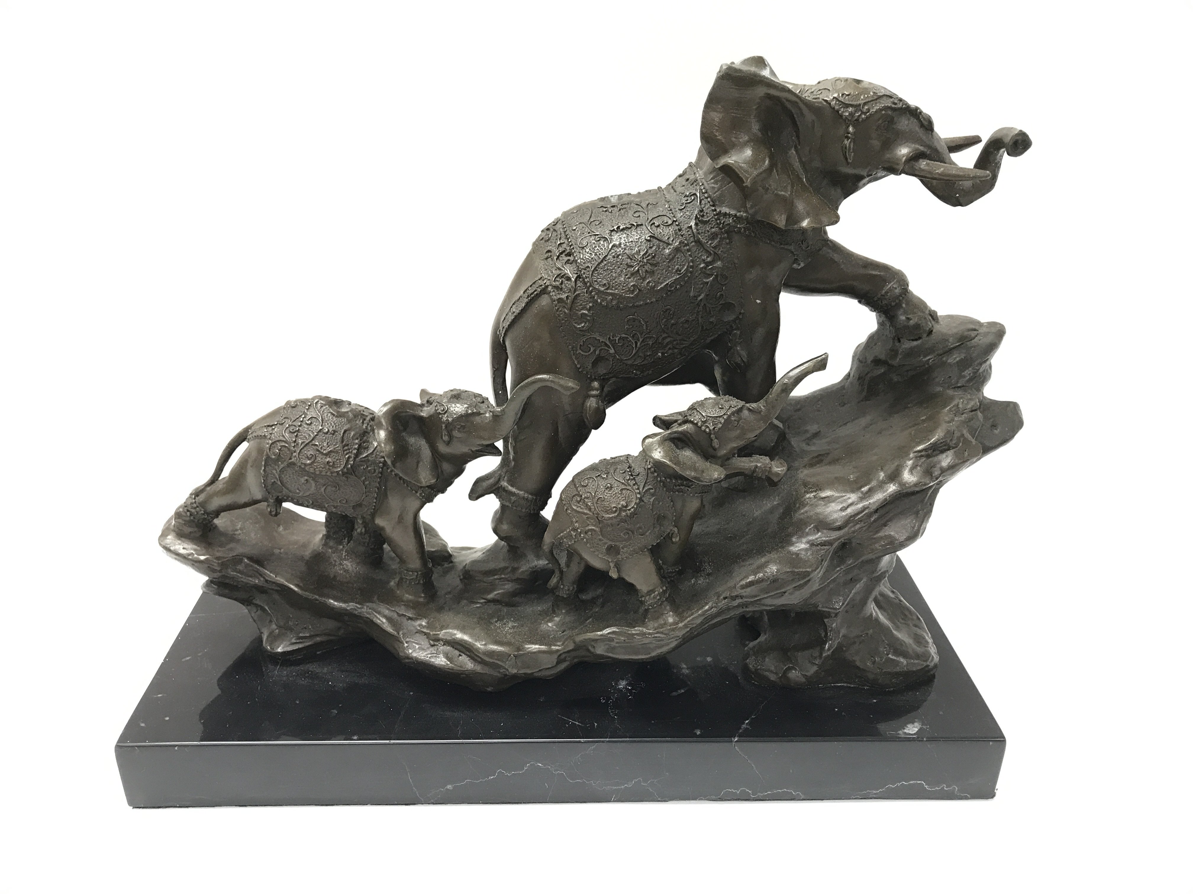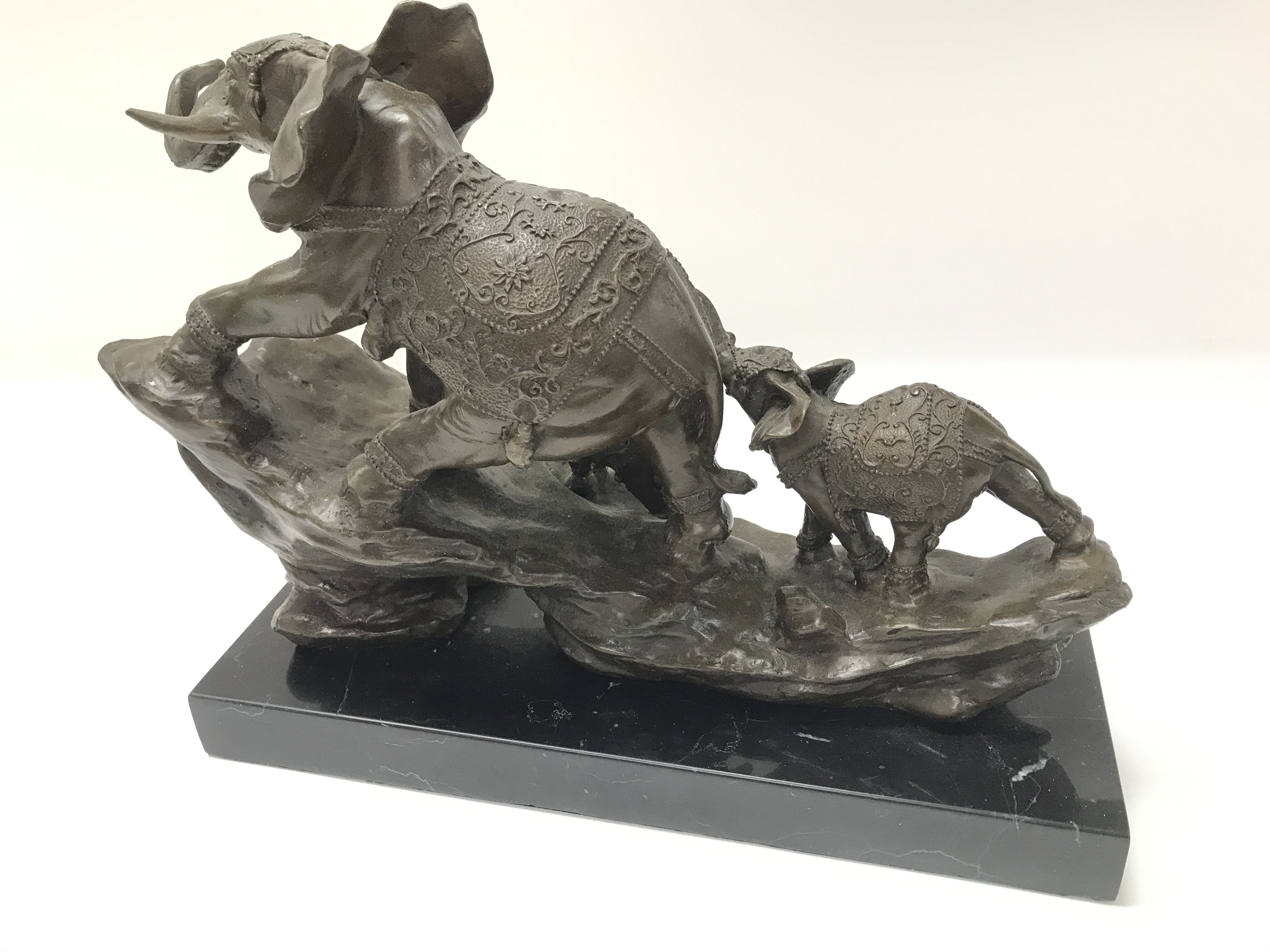 A modern cast bronze elephant figure on a stone base. 30cm wide by 25cm tall.