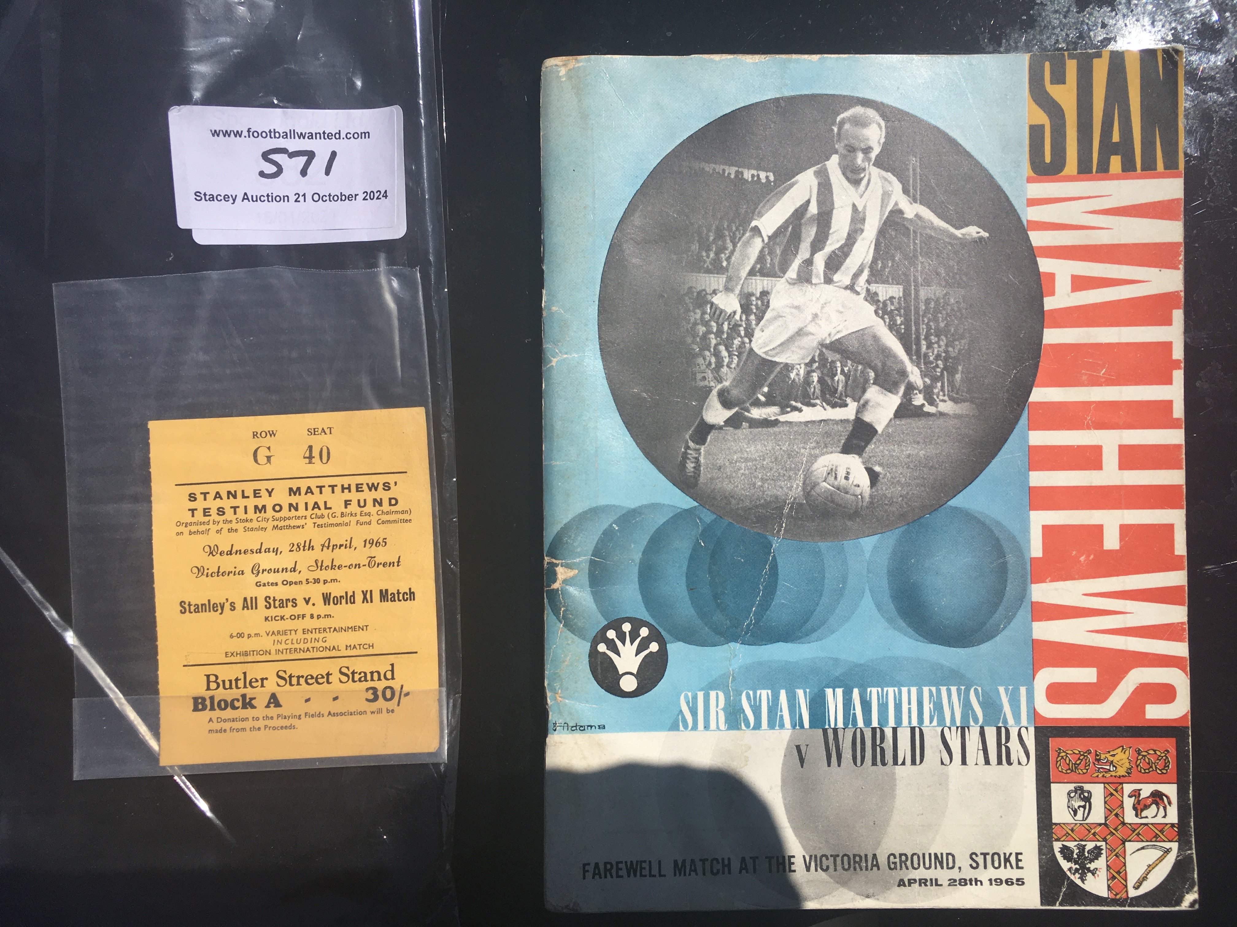 1965 Stanley Matthews Testimonial Ticket + Programme: Excellent condition ticket and fair condition programme for the Stanleys All Stars v World X1 match at Stoke.