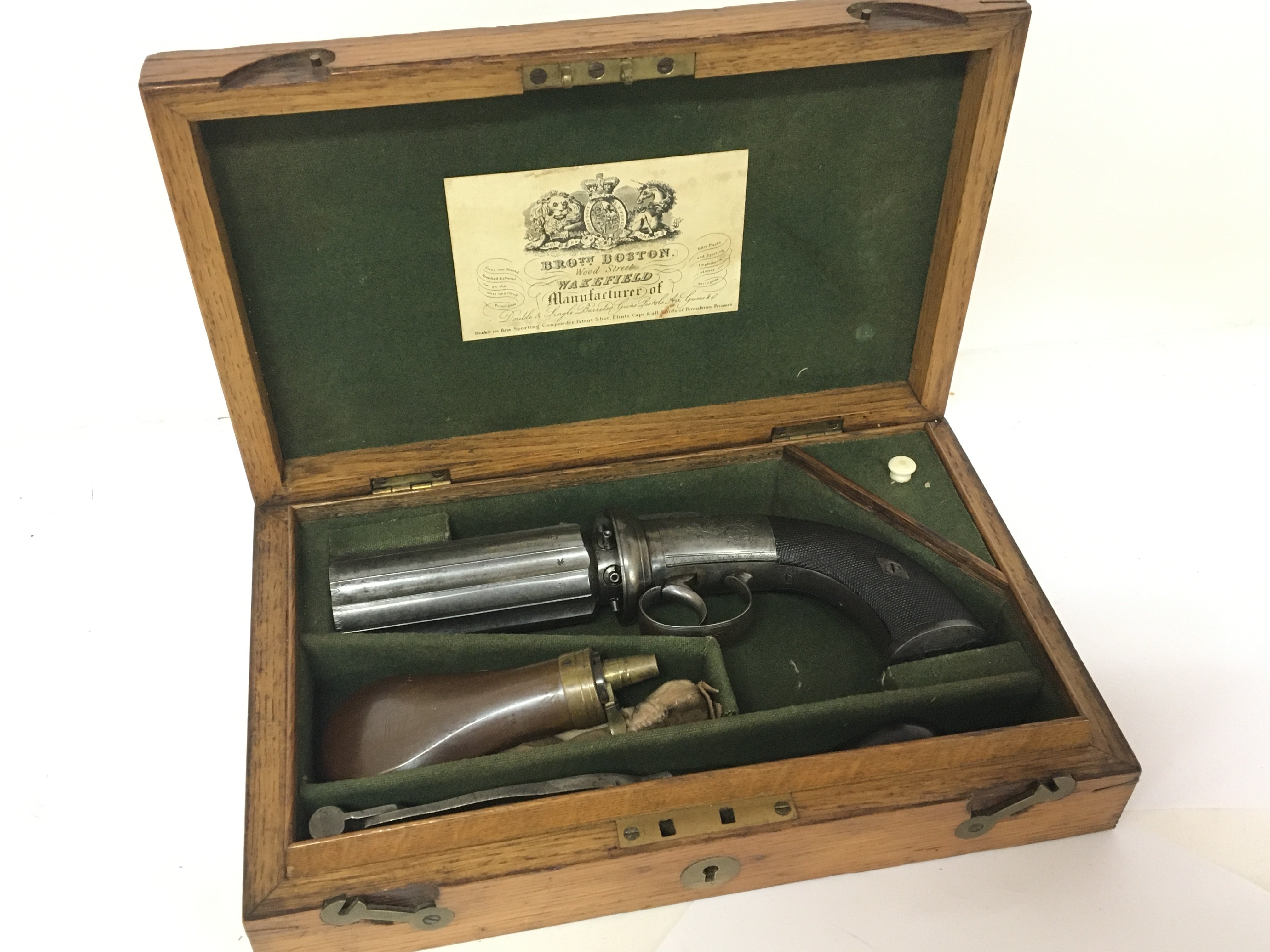 A Quality early 19th Century English Peperpot Revolver six shot with engraved steel action maker John Boston of Wakefield 1827-1857. With engraved and numbers barrels Bro Boston. In an original oak vase with makers label and with accessories mechanism working fine and in extremely good condition.