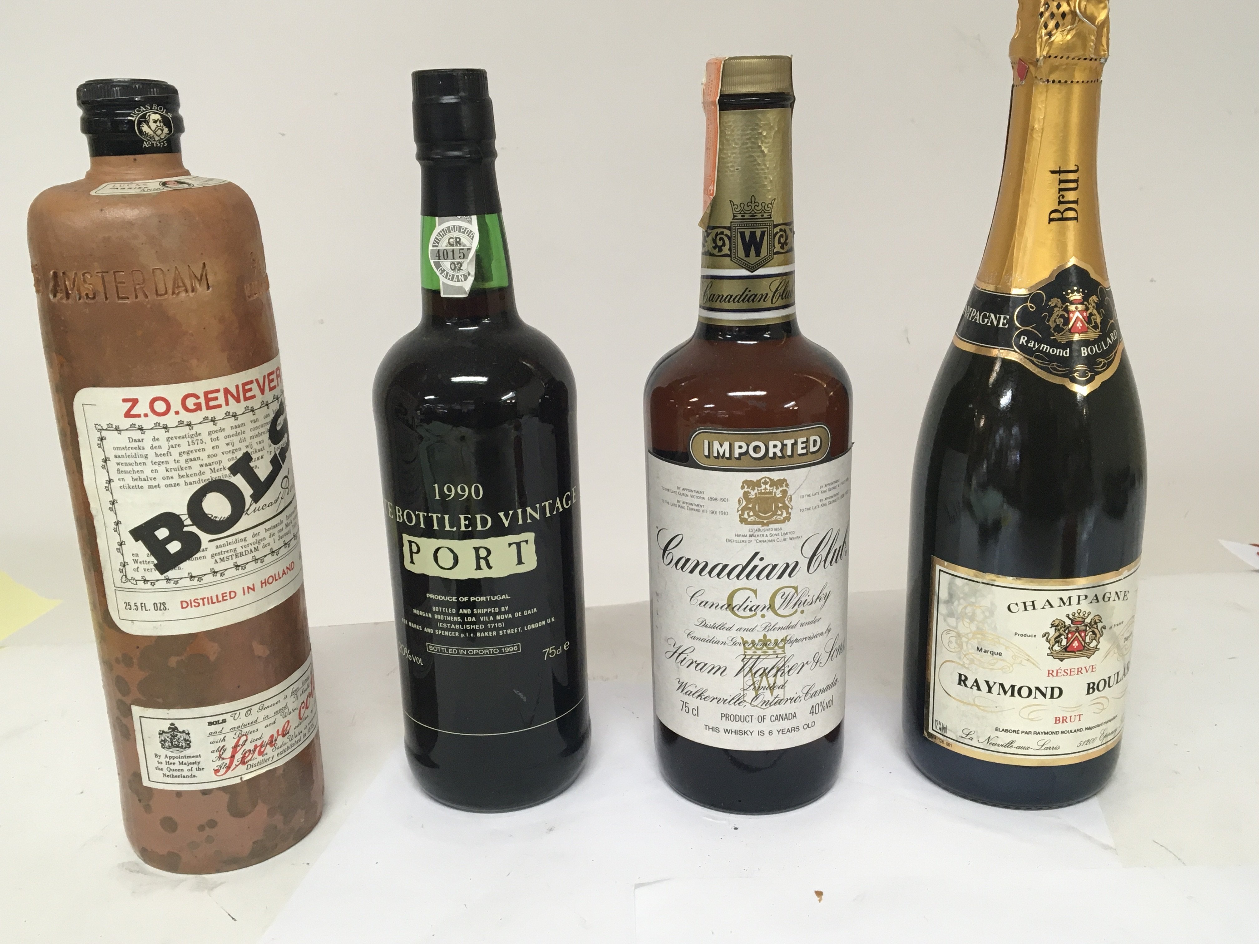 A bottle of 1990 Vintage Port a bottle of Canadian Club Whisky a bottle of Raymond Boulard Champagne and a bottle of Bols (4). NO RESERVE