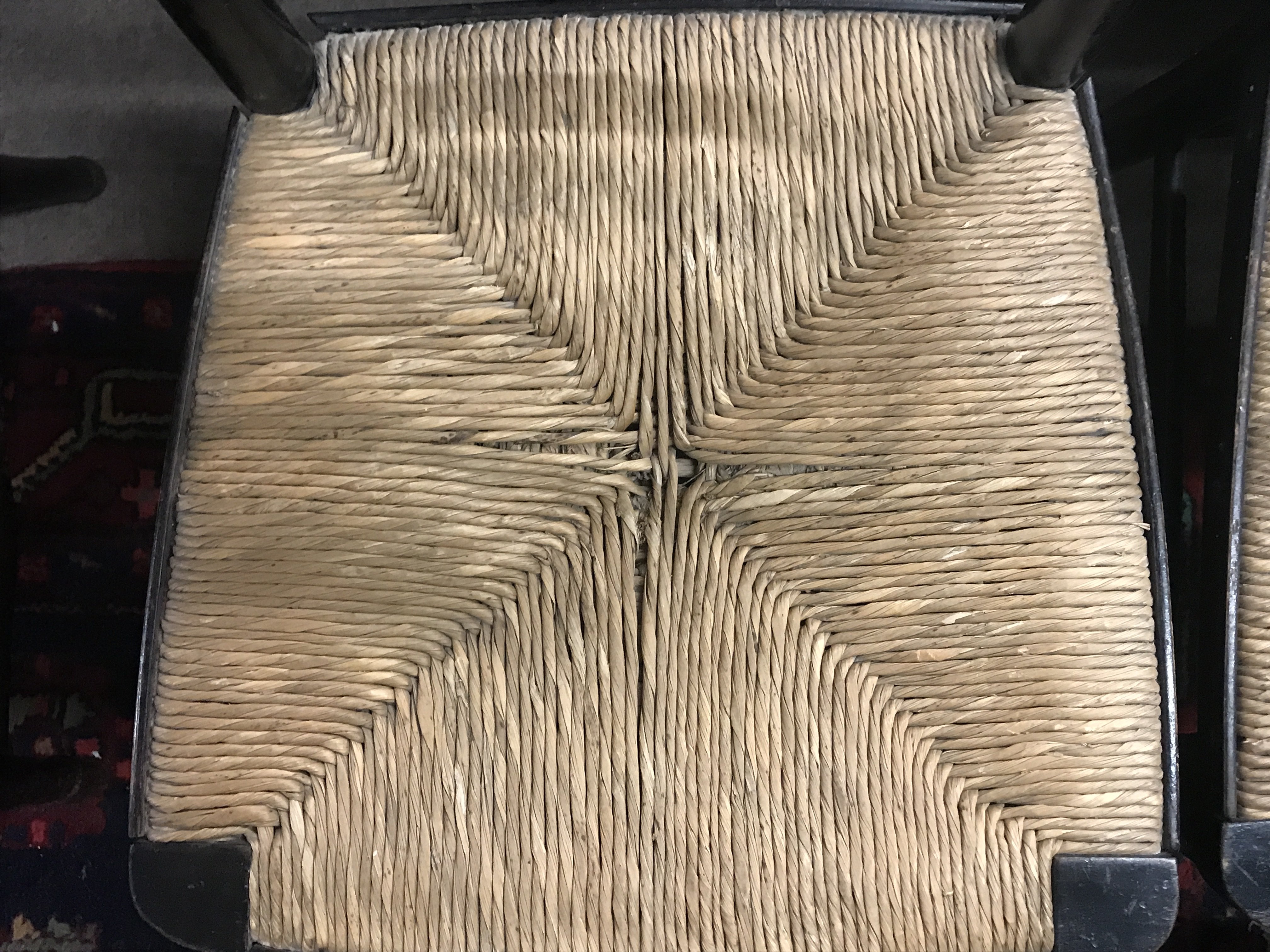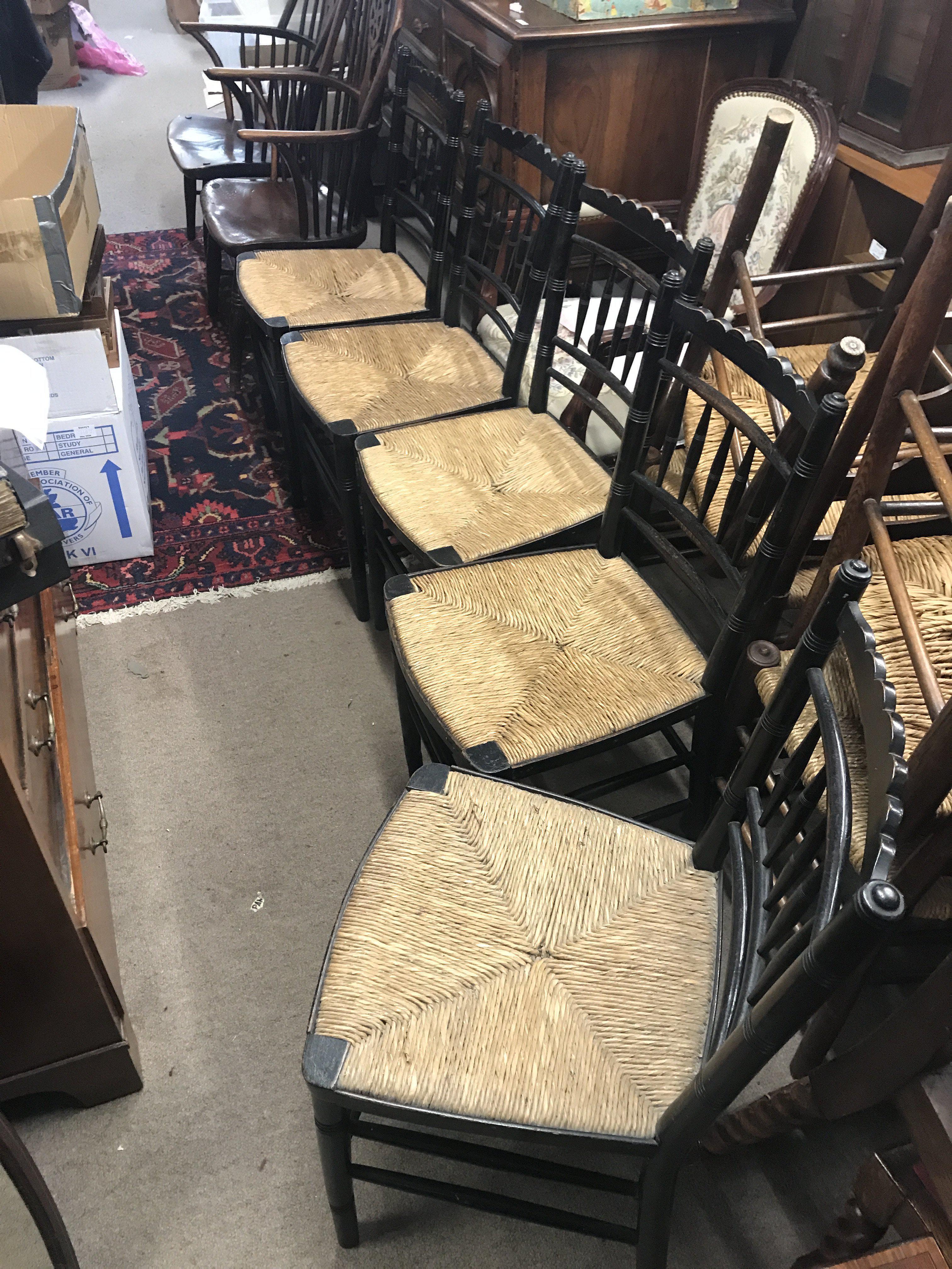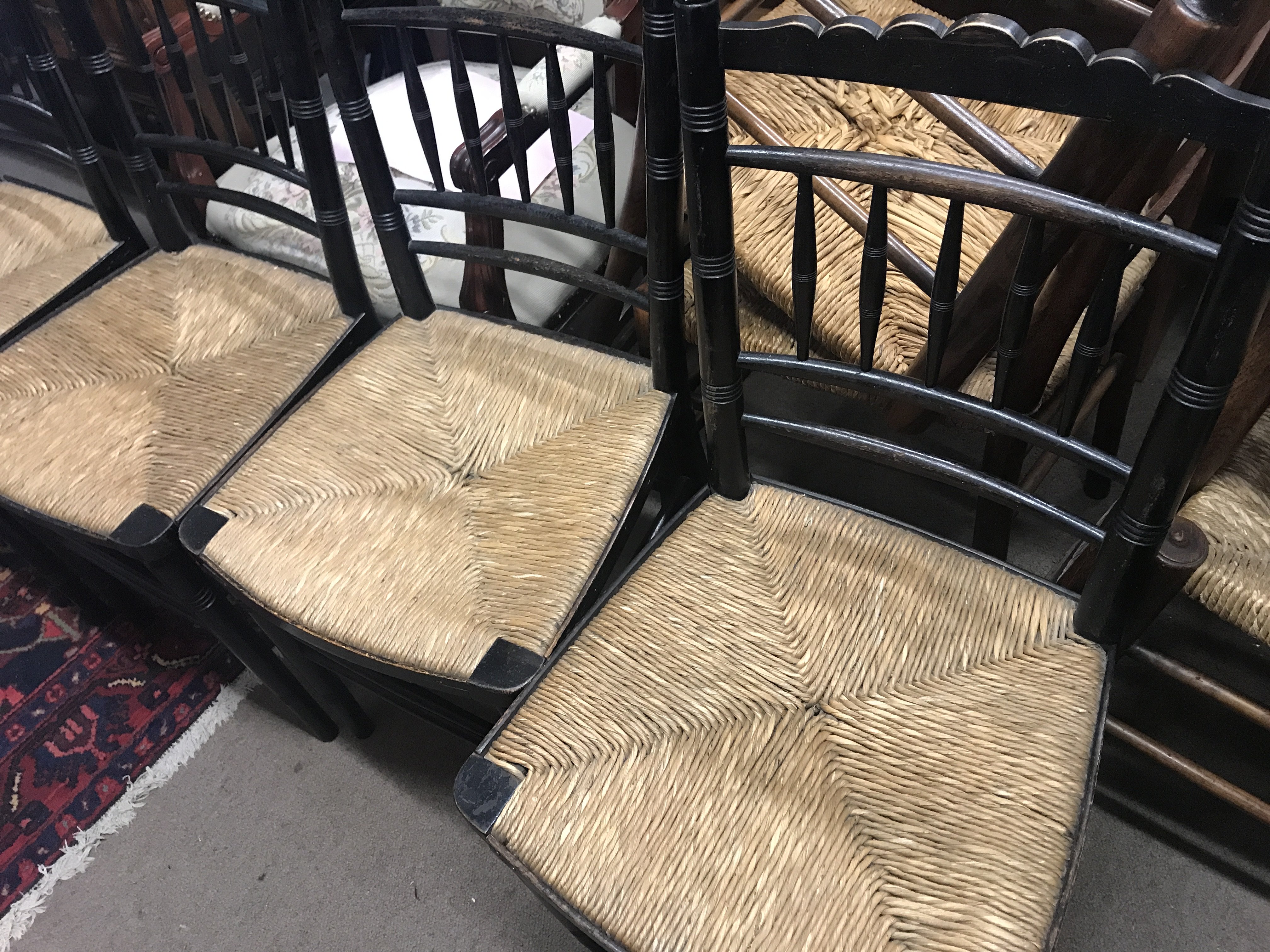 Five William Morris influenced design chairs with rush seats. Dimensions 40x40x85cm