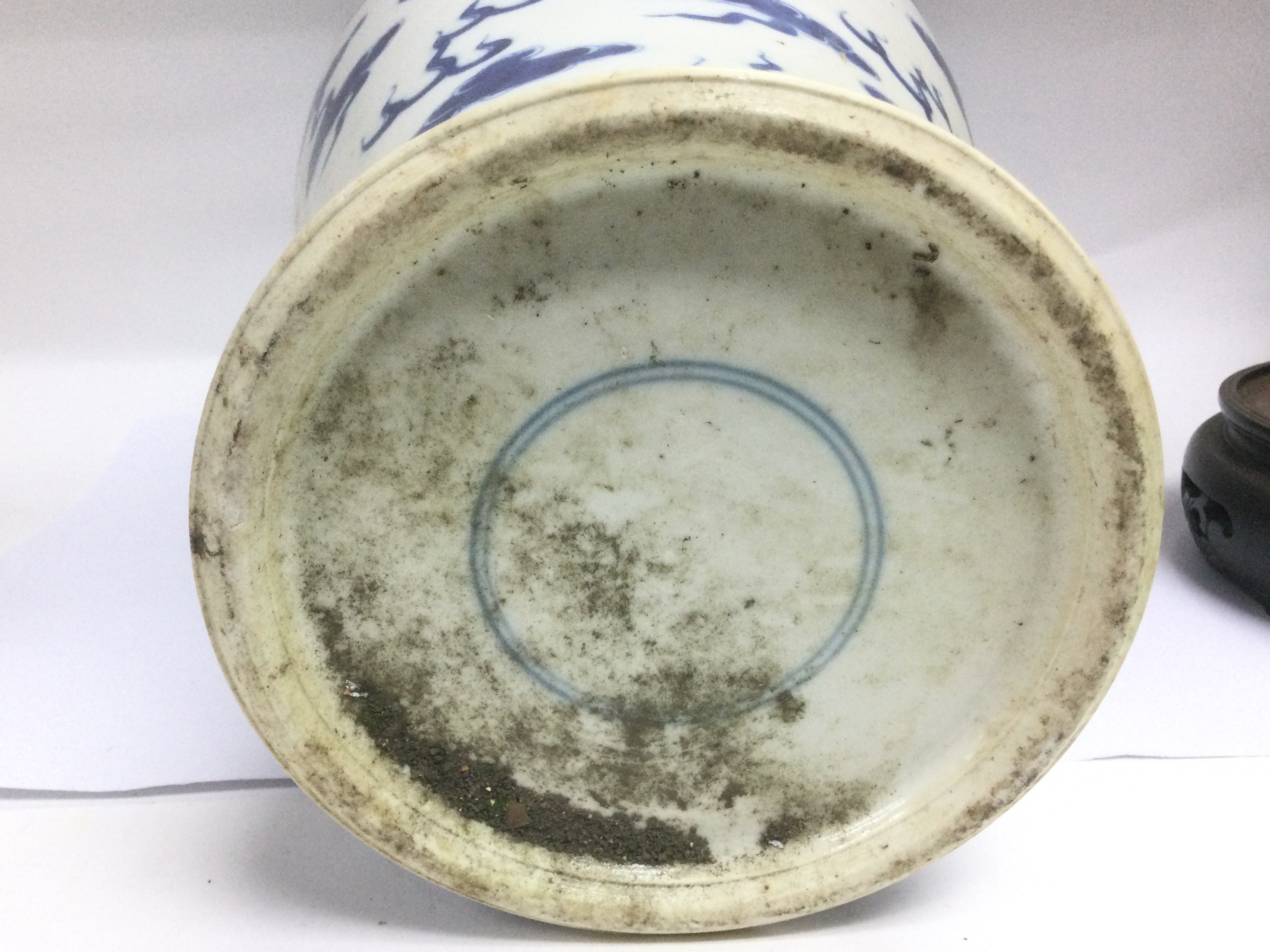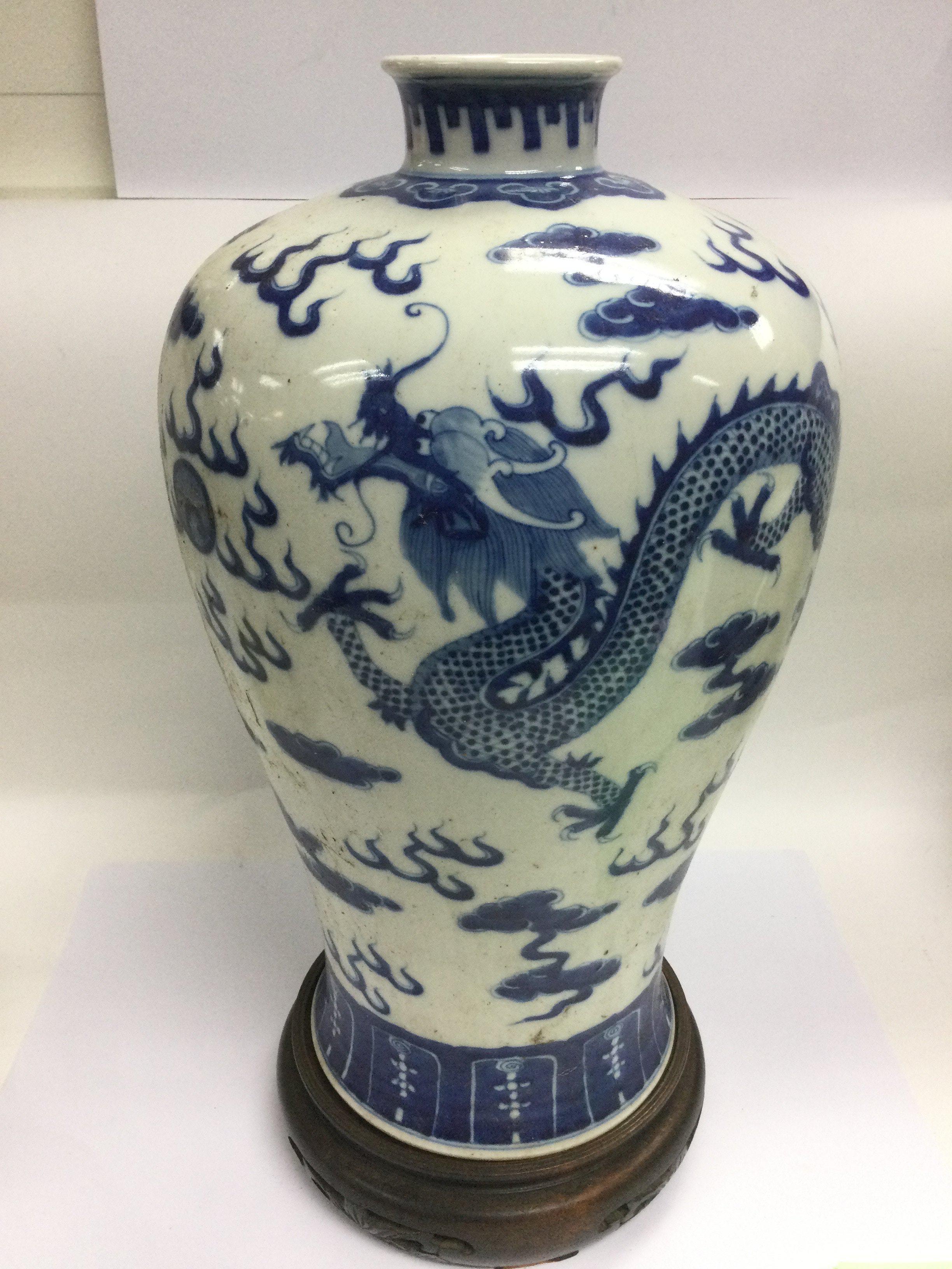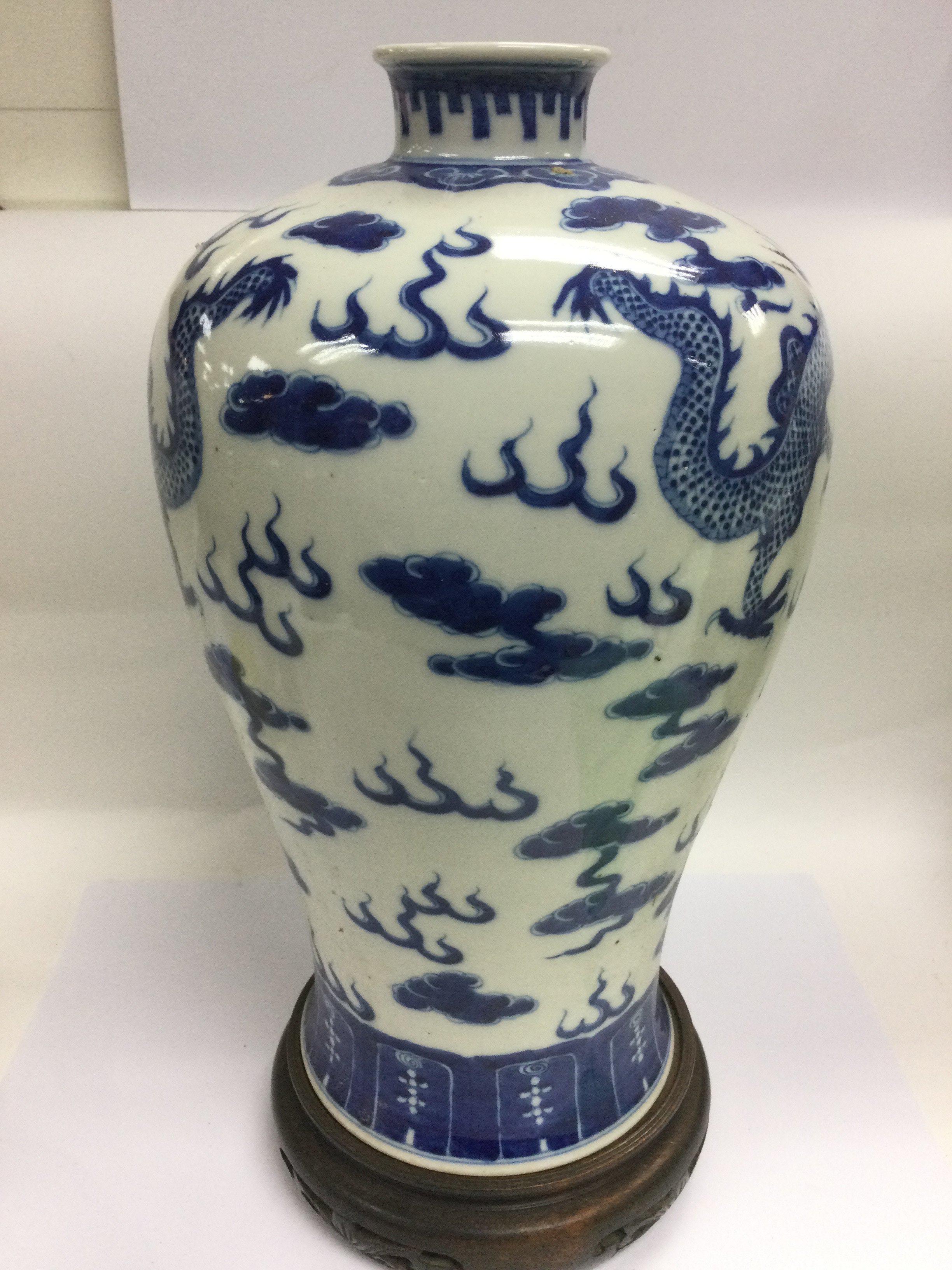A large blue and white baluster vase decorated with a dragon chasing a pearl raised on a hardwood stand, approx height 43cm. Shipping category D.