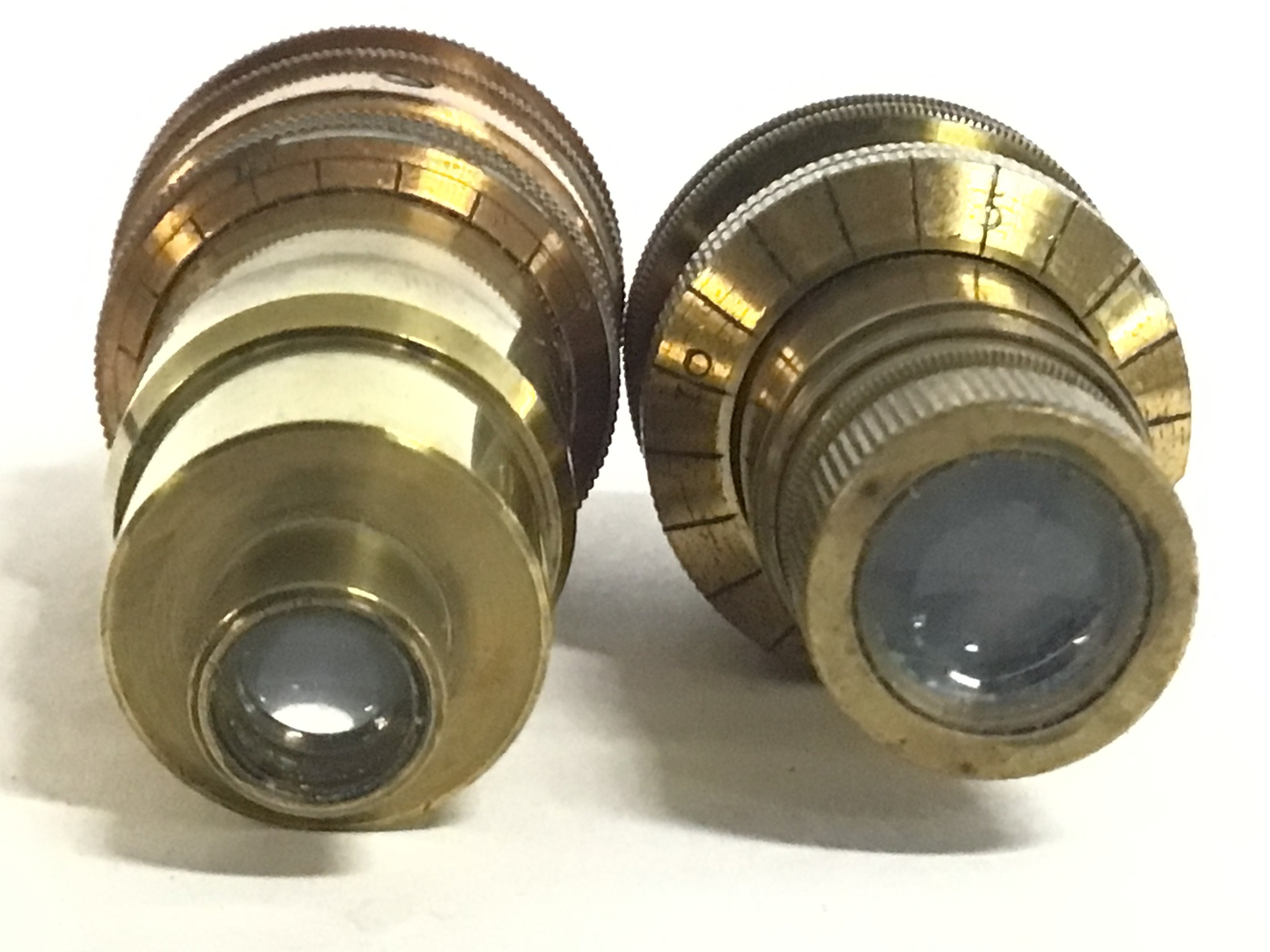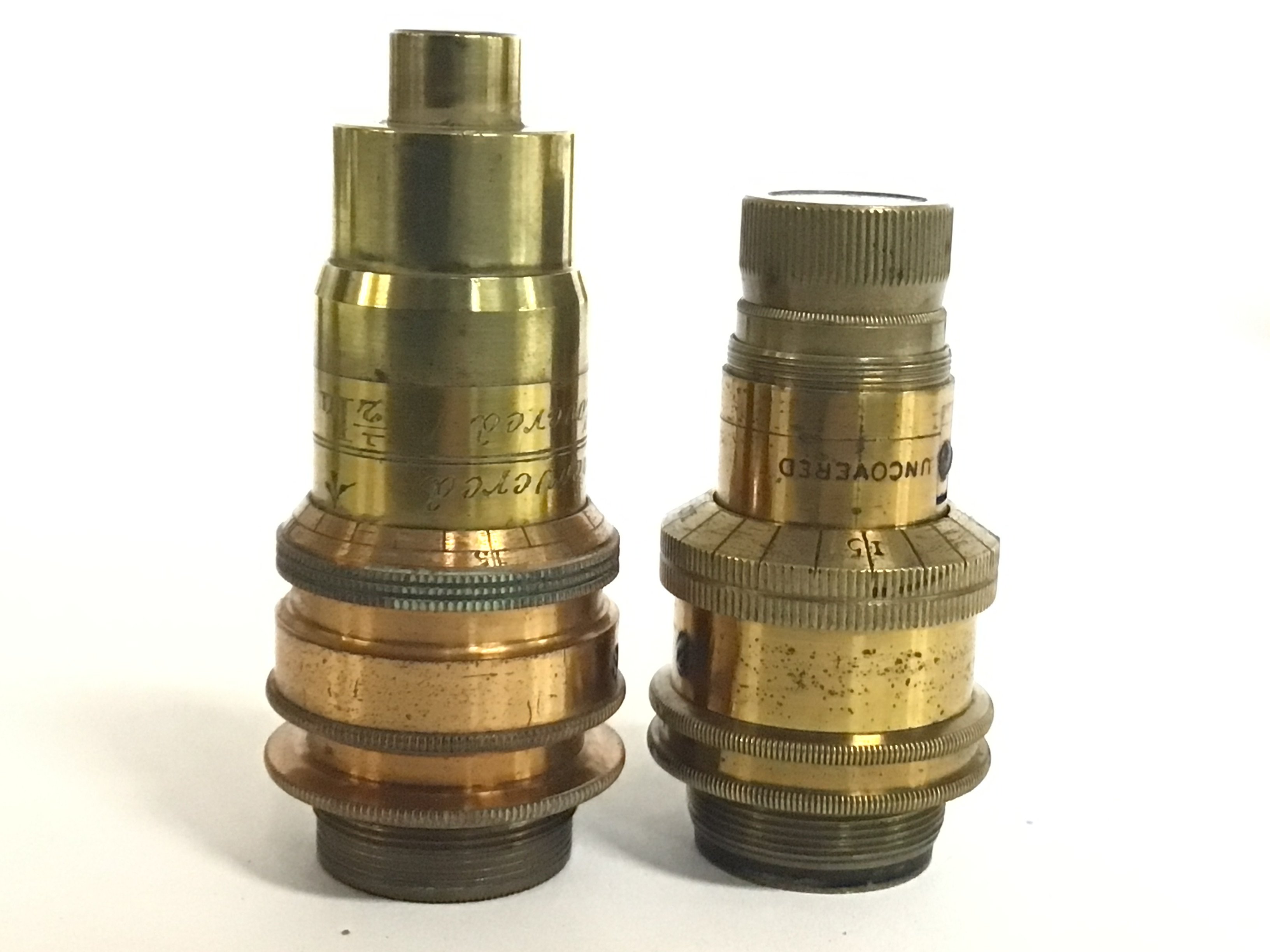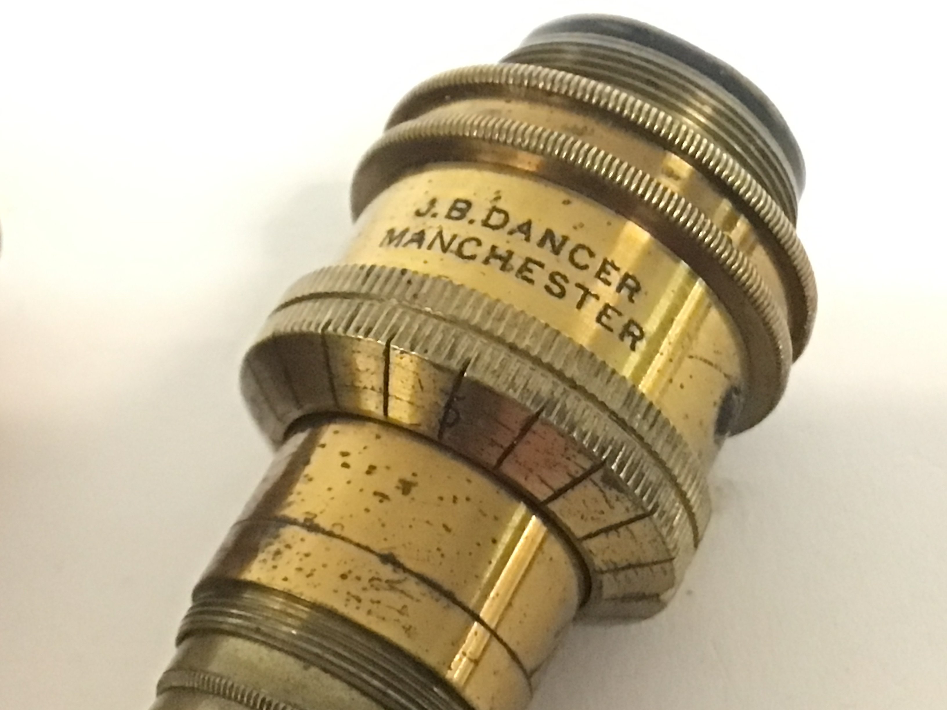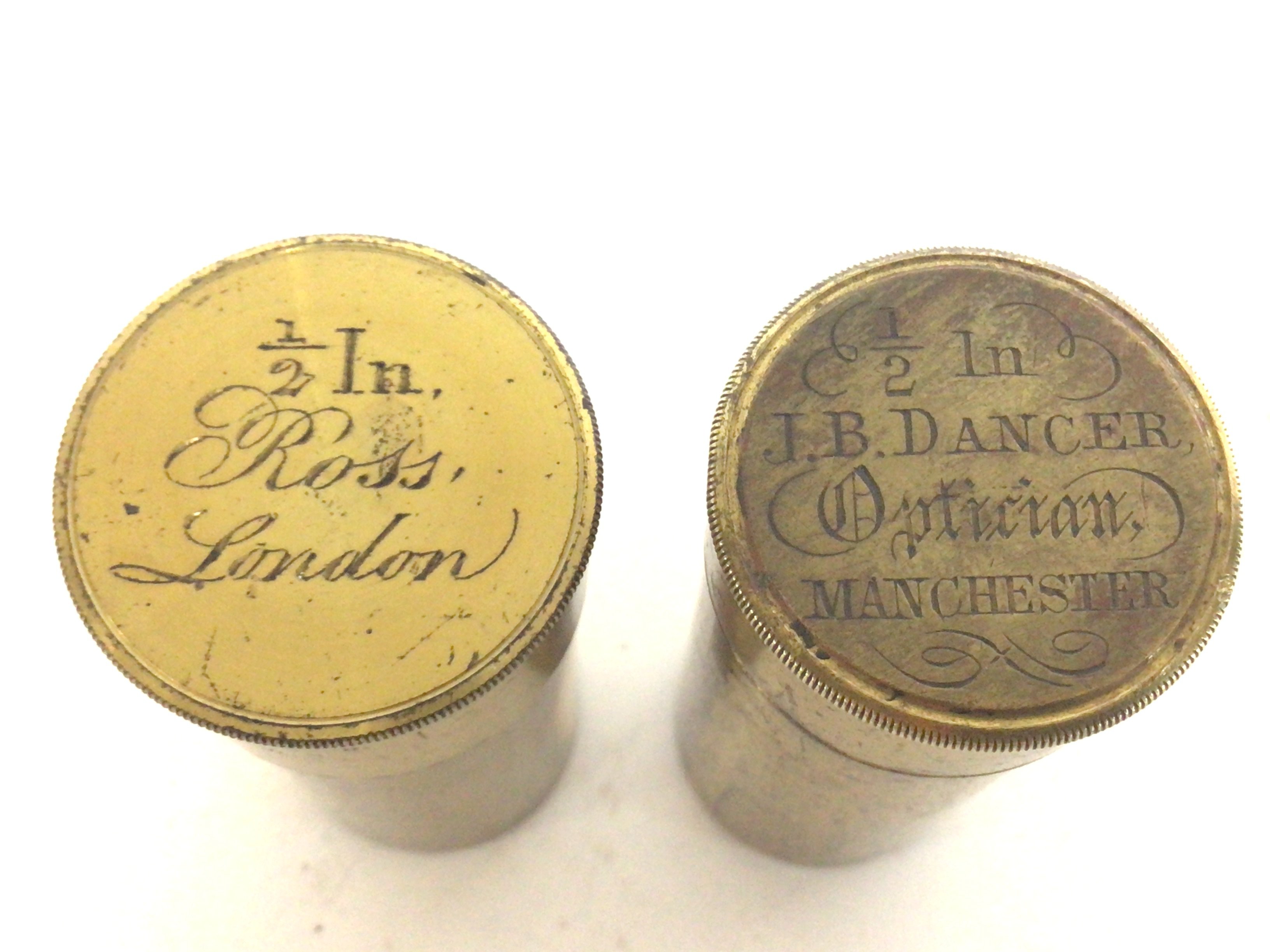 Two cased brass 1/2 inch microscope lenses by J.B Dancer and Ross. This lot cannot be posted
