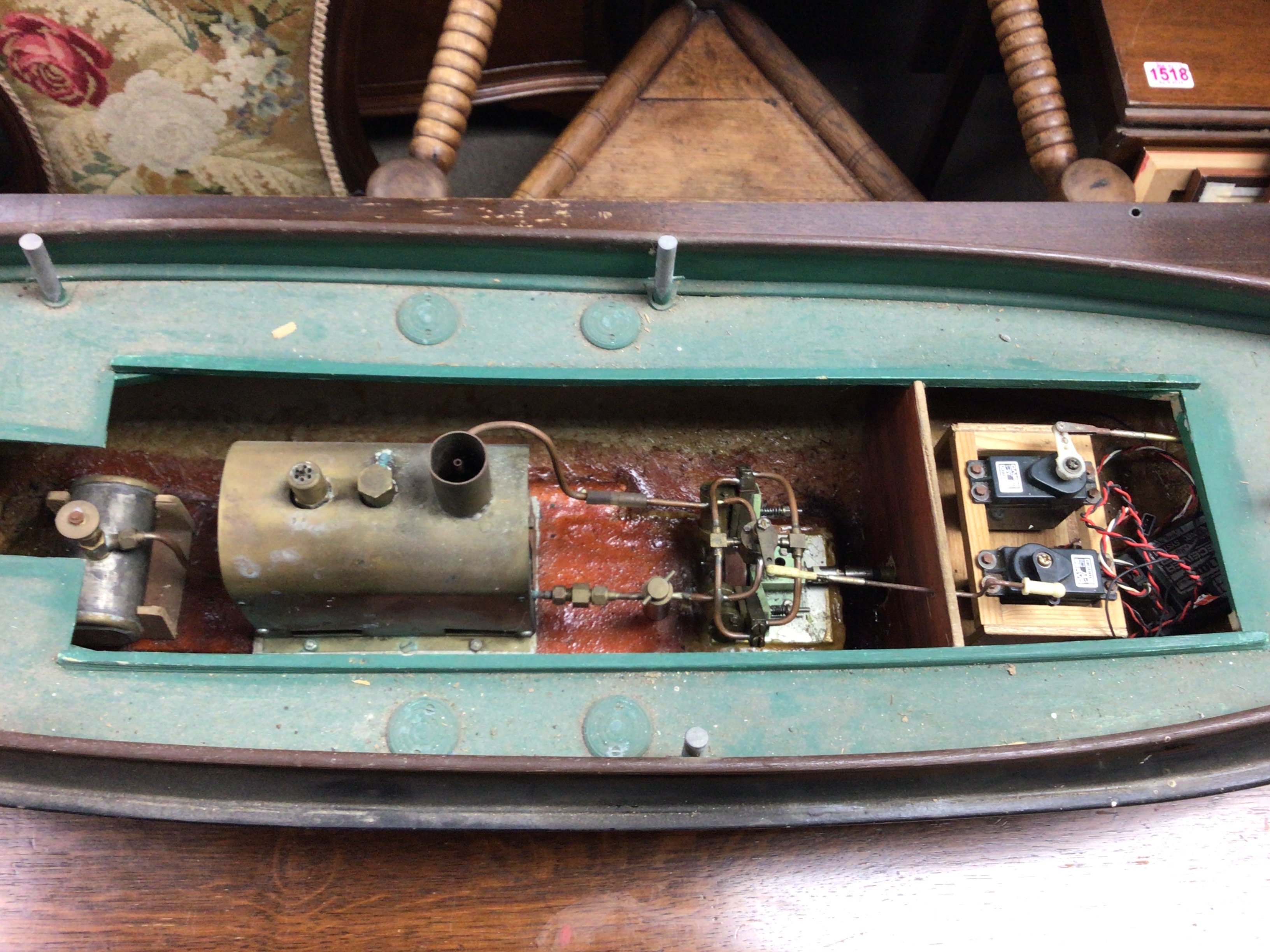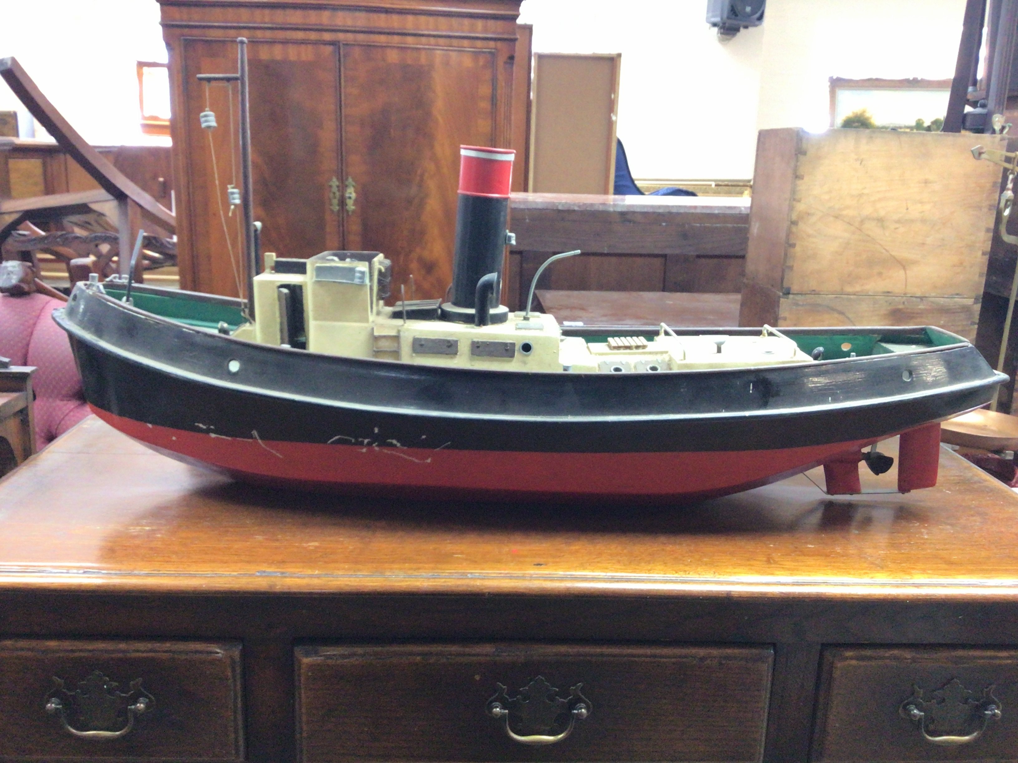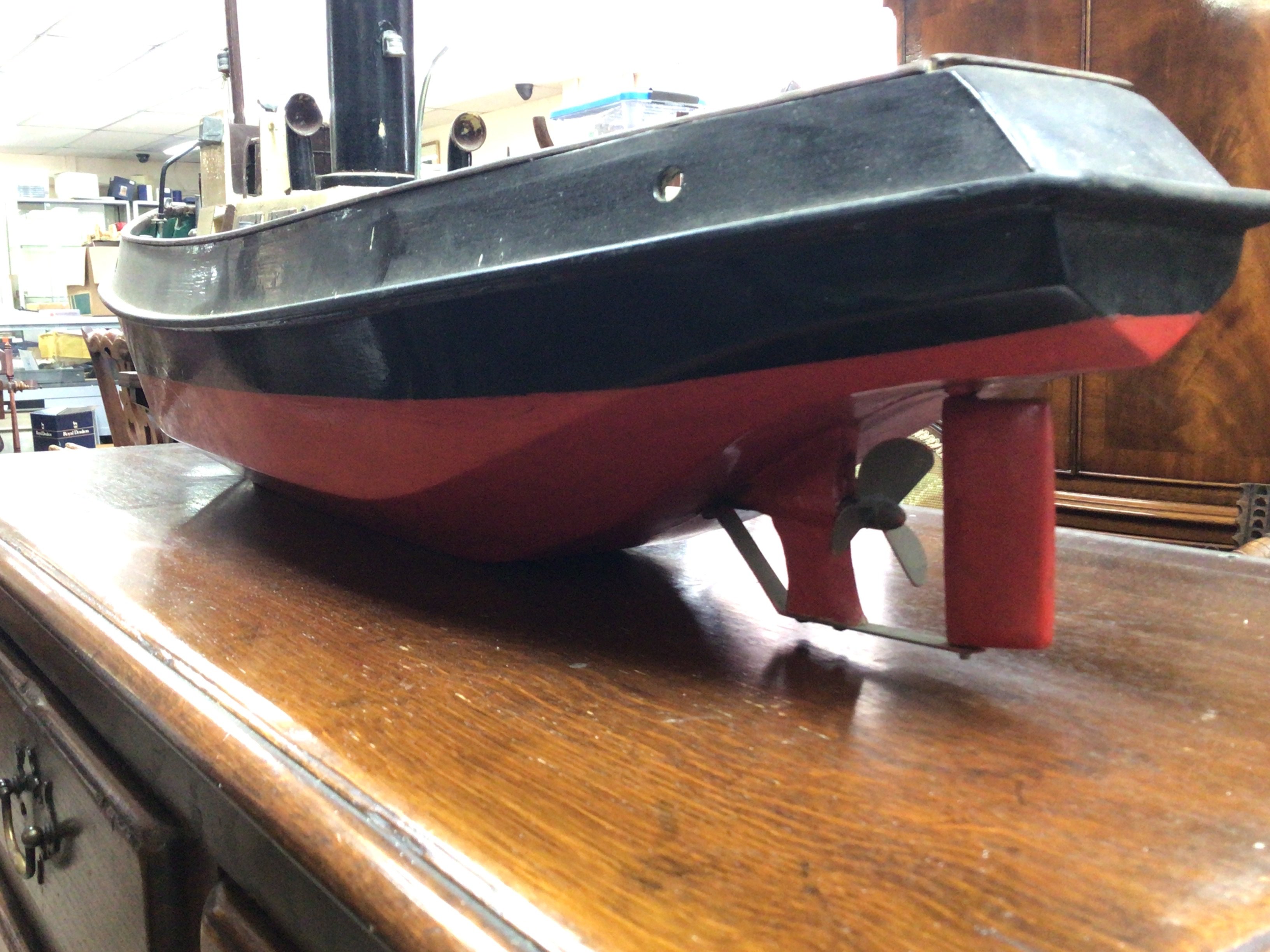 A live steam engine tug boat with boiler. Dimensions 90cm long,23cm wide,44cm tall. This lot cannot. Be posted