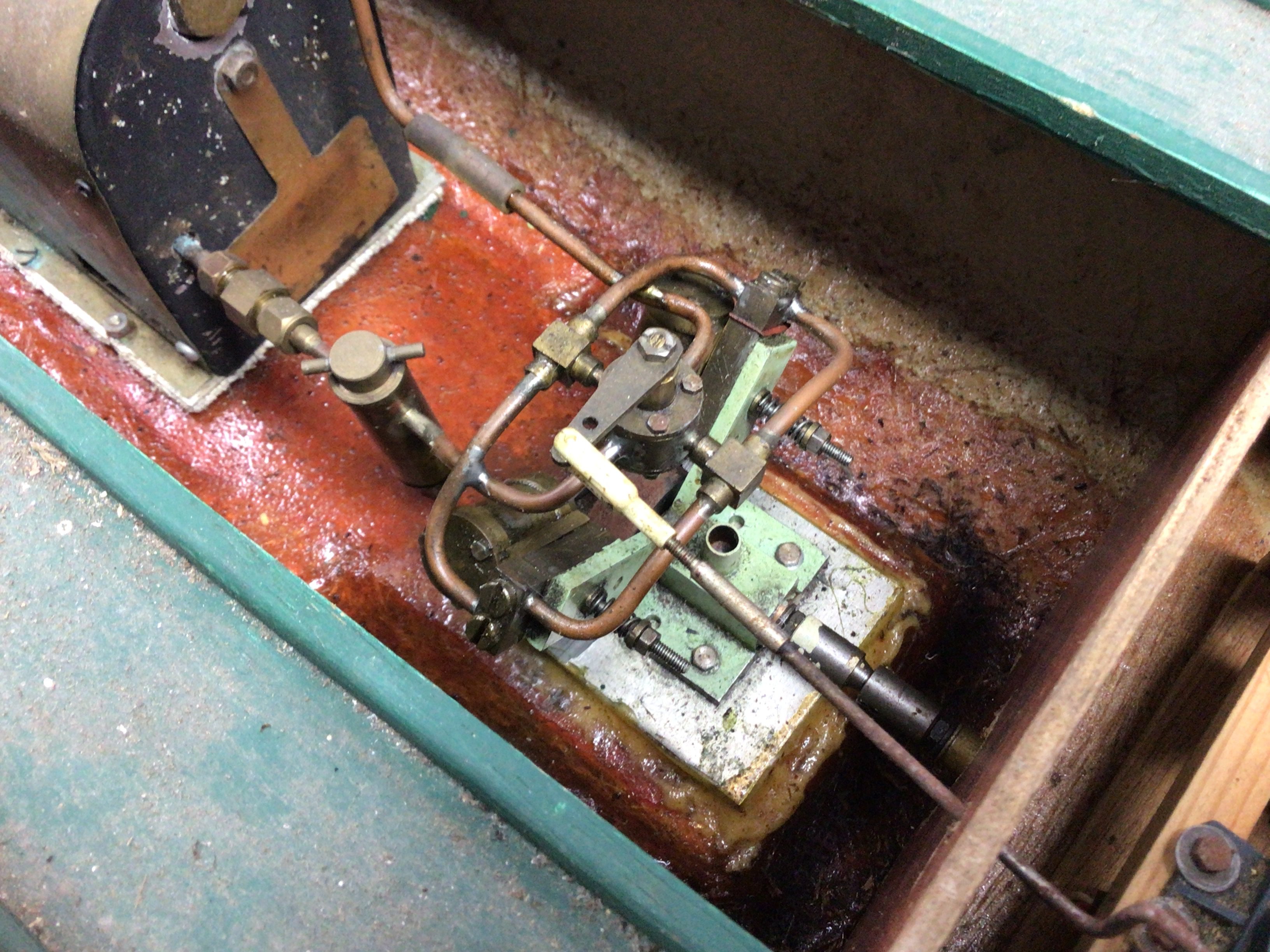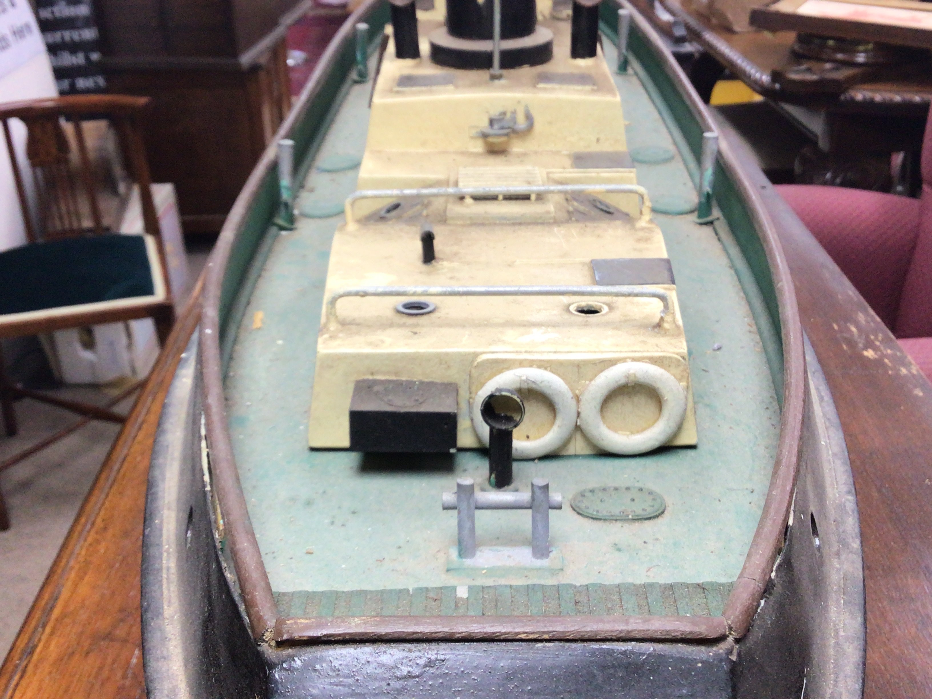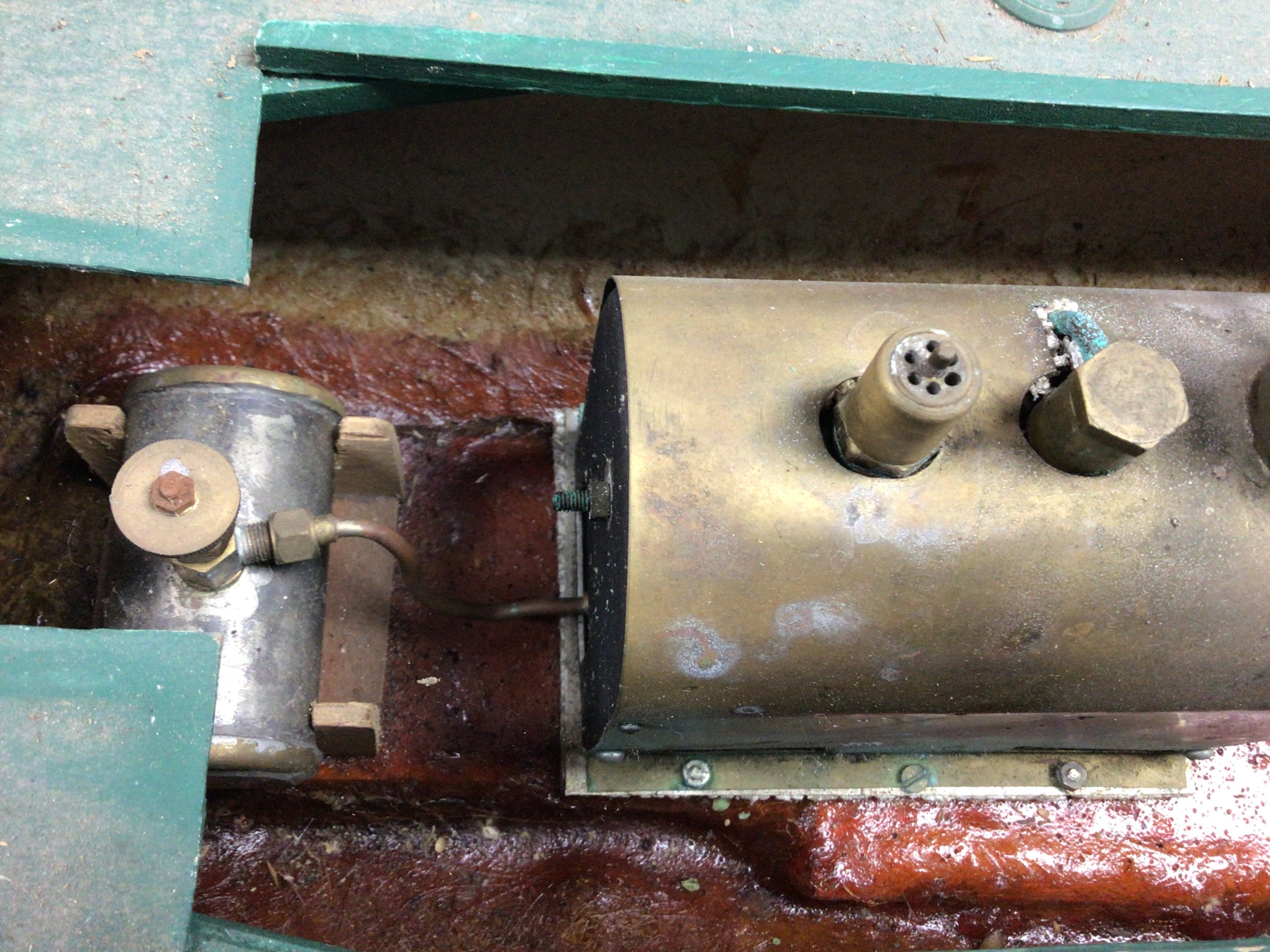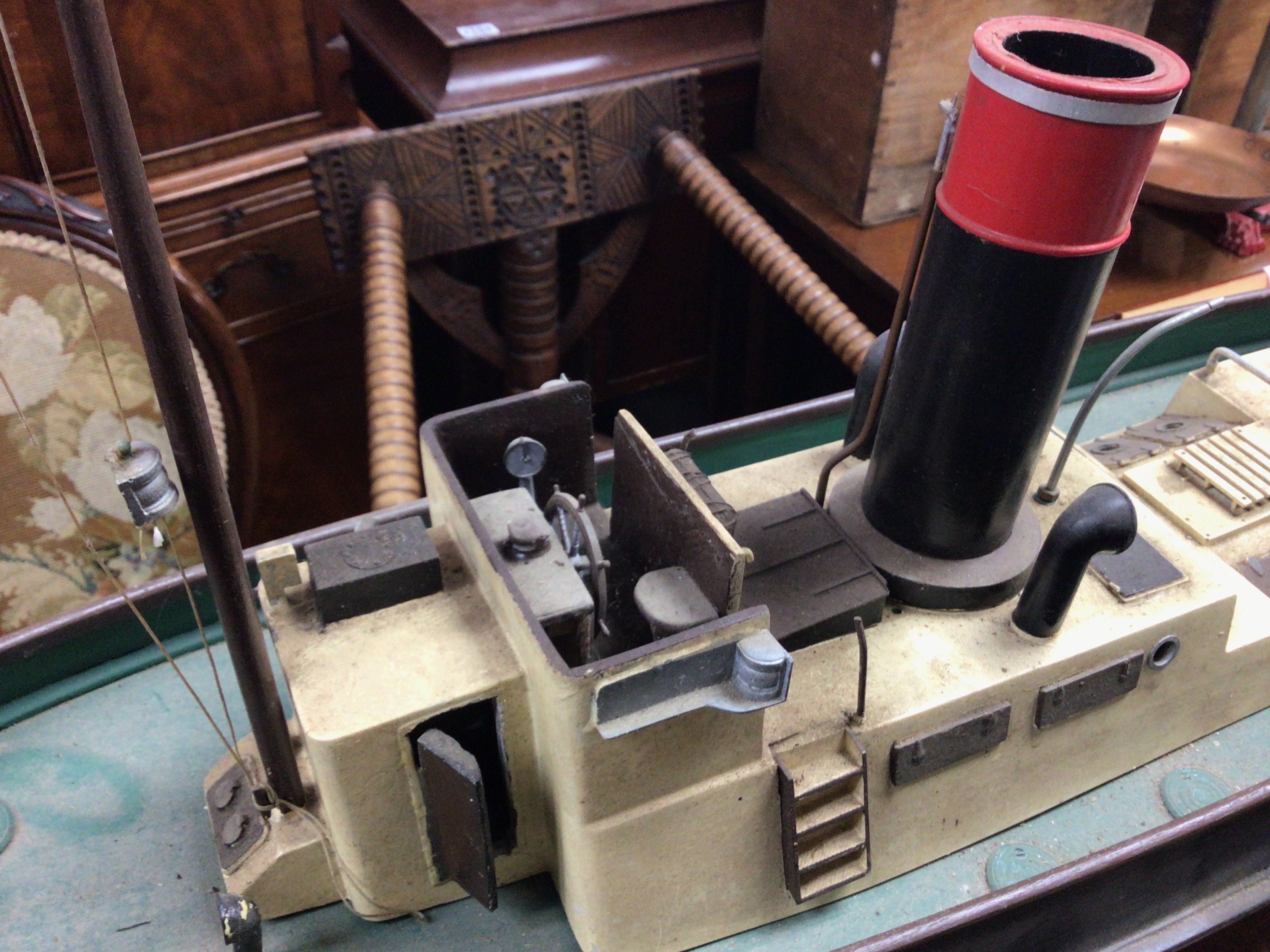 A live steam engine tug boat with boiler. Dimensions 90cm long,23cm wide,44cm tall. This lot cannot. Be posted