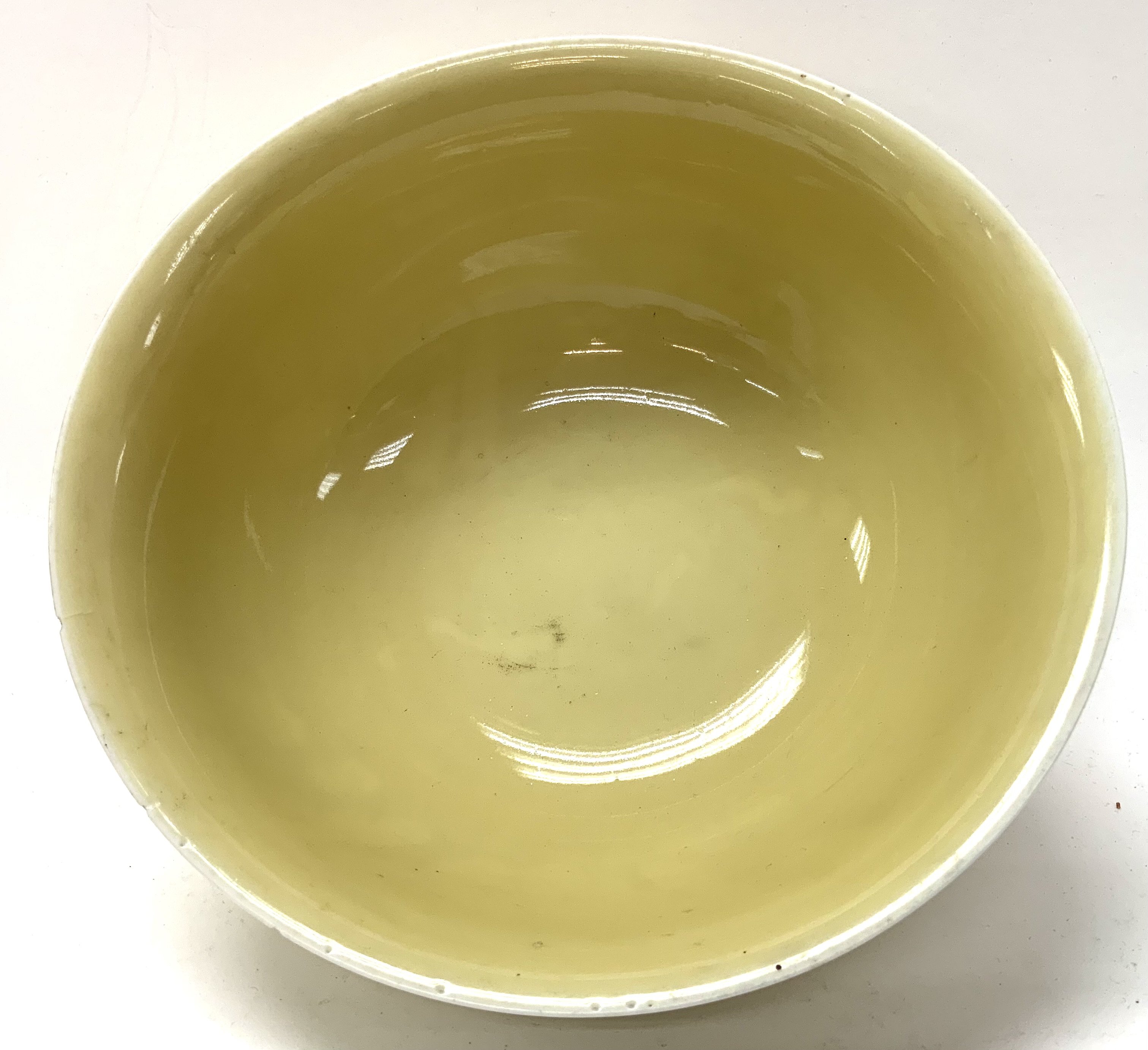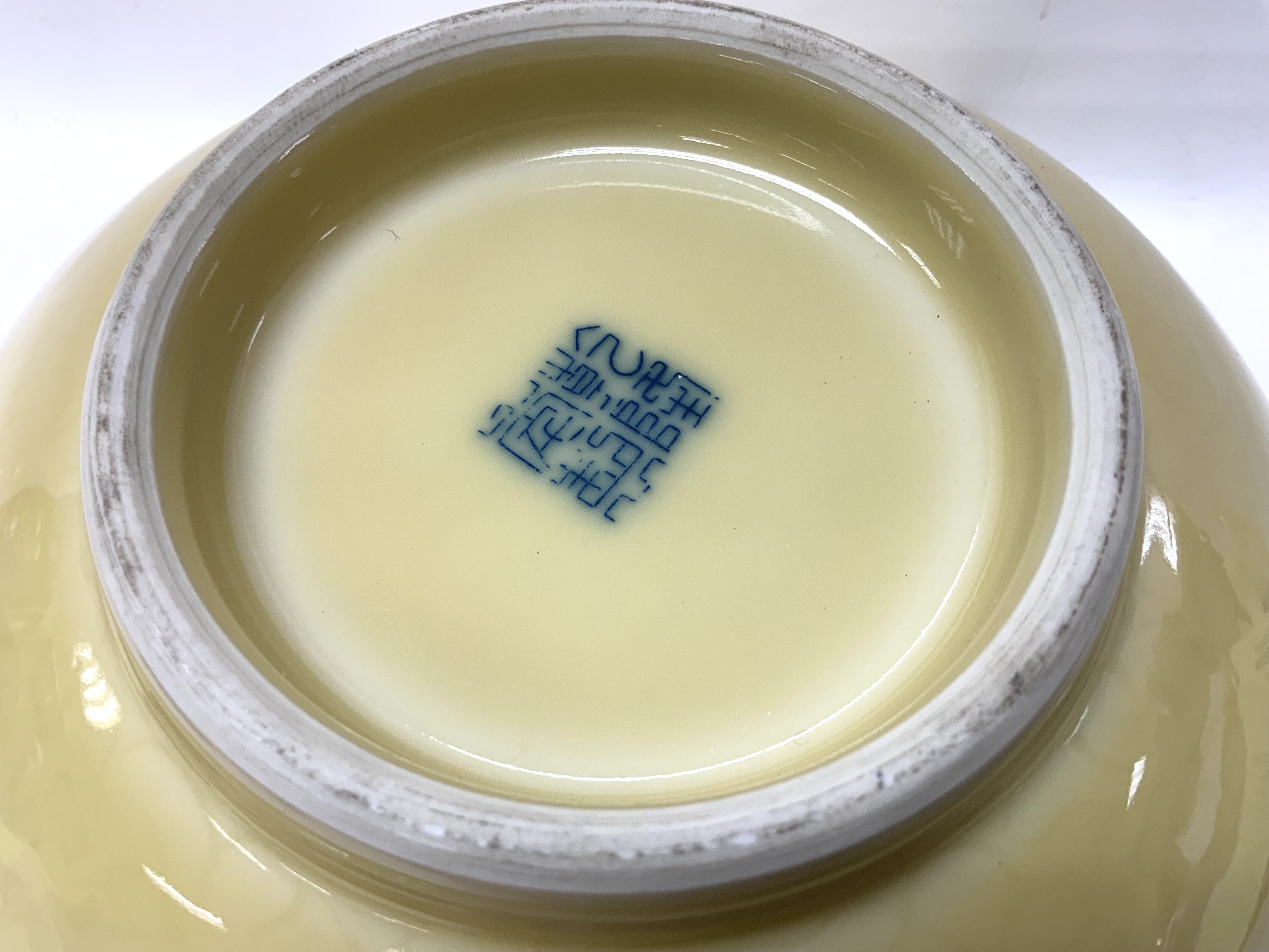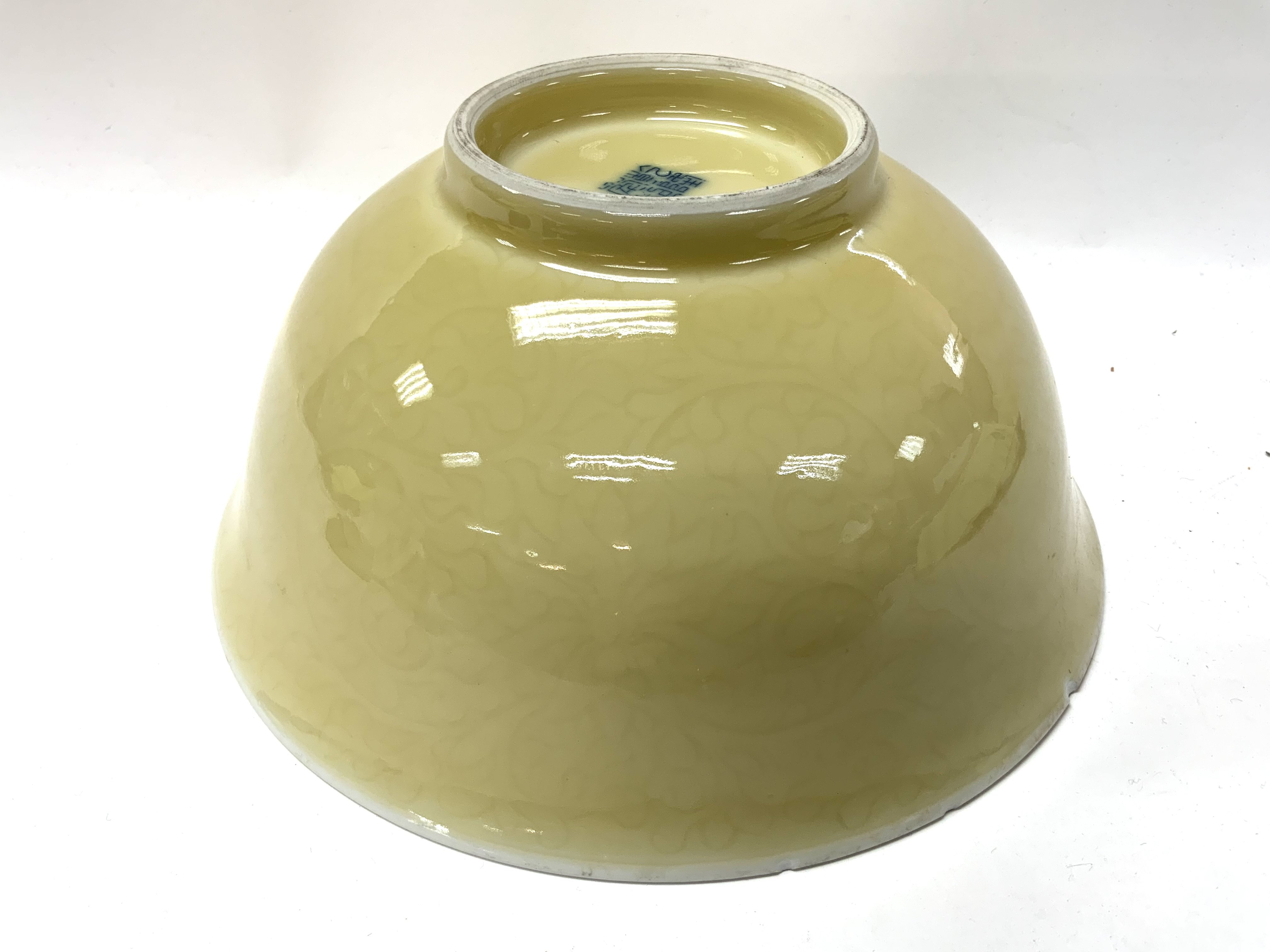 A Large yellow ground Chinese porcelain bowl with incised Lotus decoration, Underglazed 4 character mark to the underside. 23cm diameter x 11cm. (Some chipping to the rim), Catagory D postage. NO RESERVE