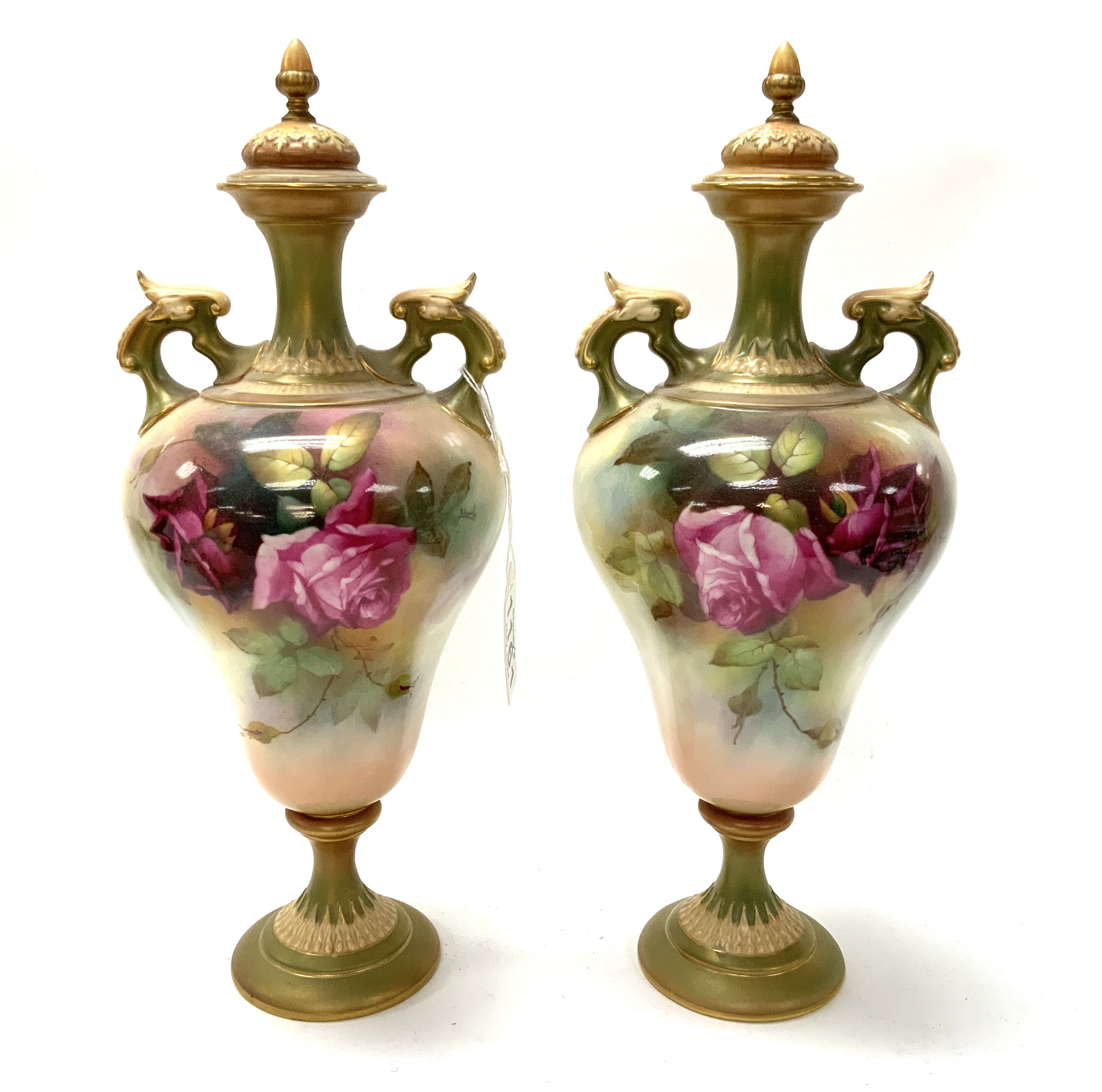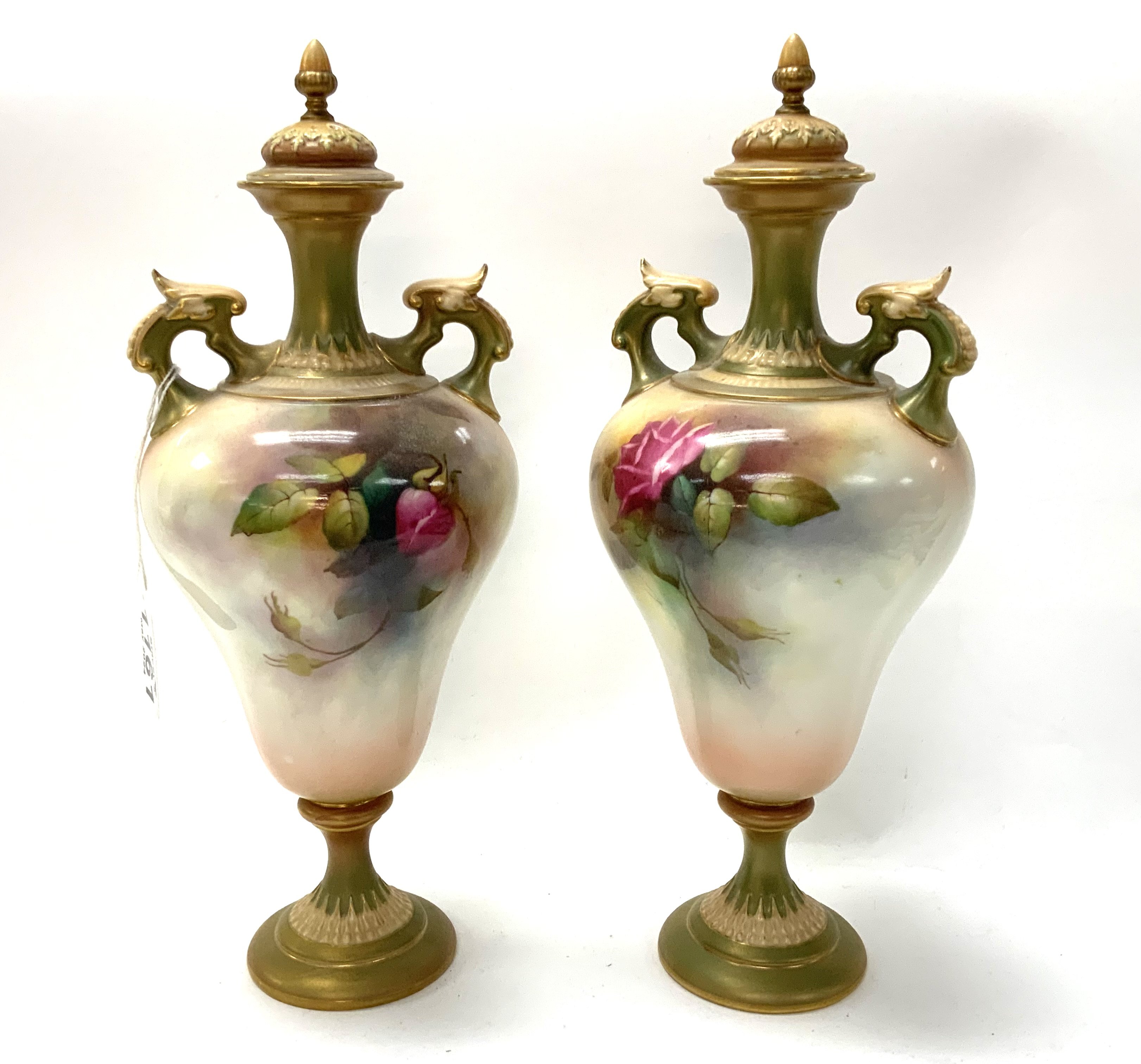 A Pair of Royal Worcester hand painted urns and covers with hand painted Rose decoration signed R.Austin. Height.32cm (D. in-house postage not available for this lot). No visible damage.