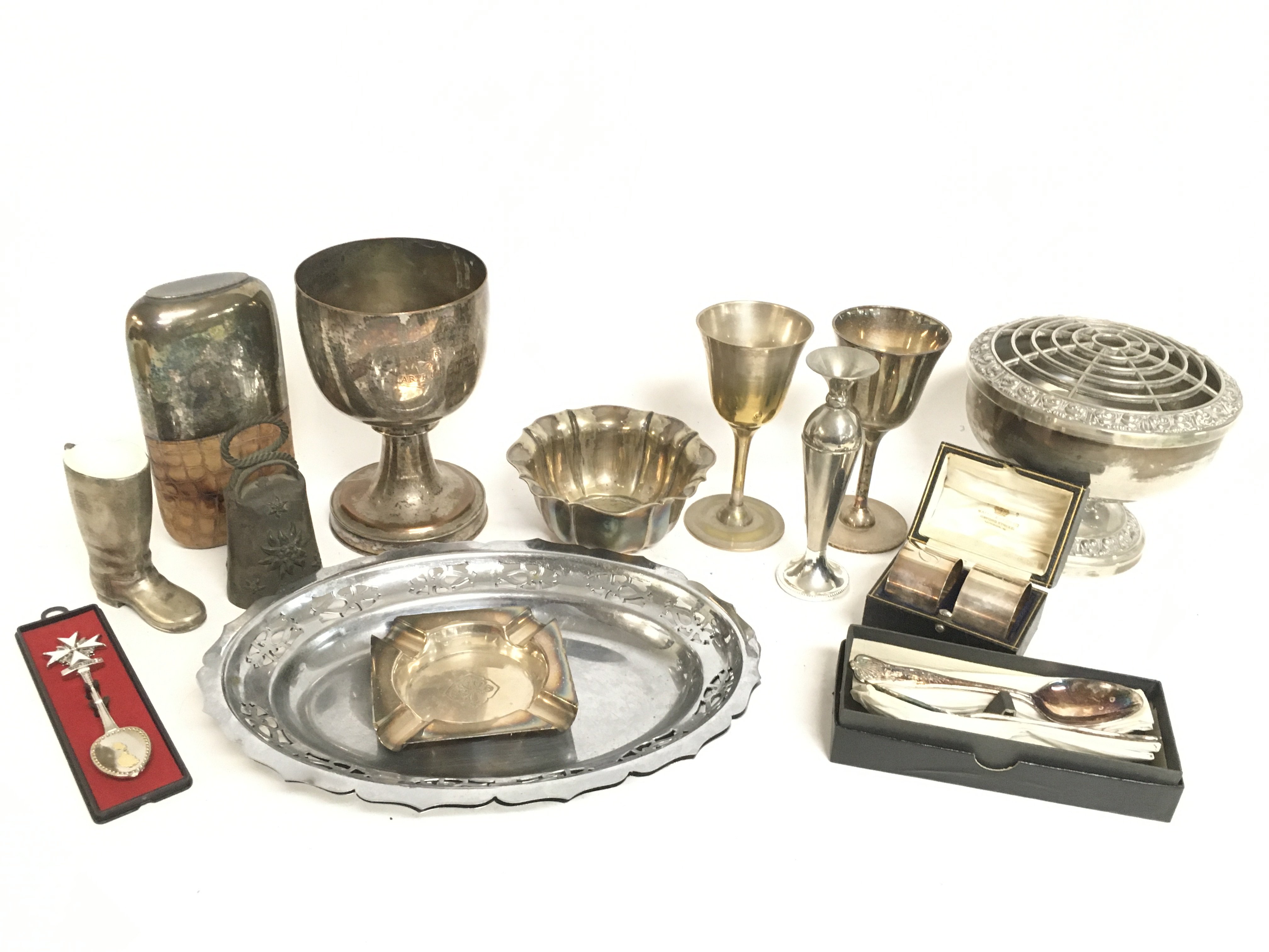 A collection of silver plate including a novelty boot, trays, glasses, spoons, napkin rings. Postage category C. NO RESERVE