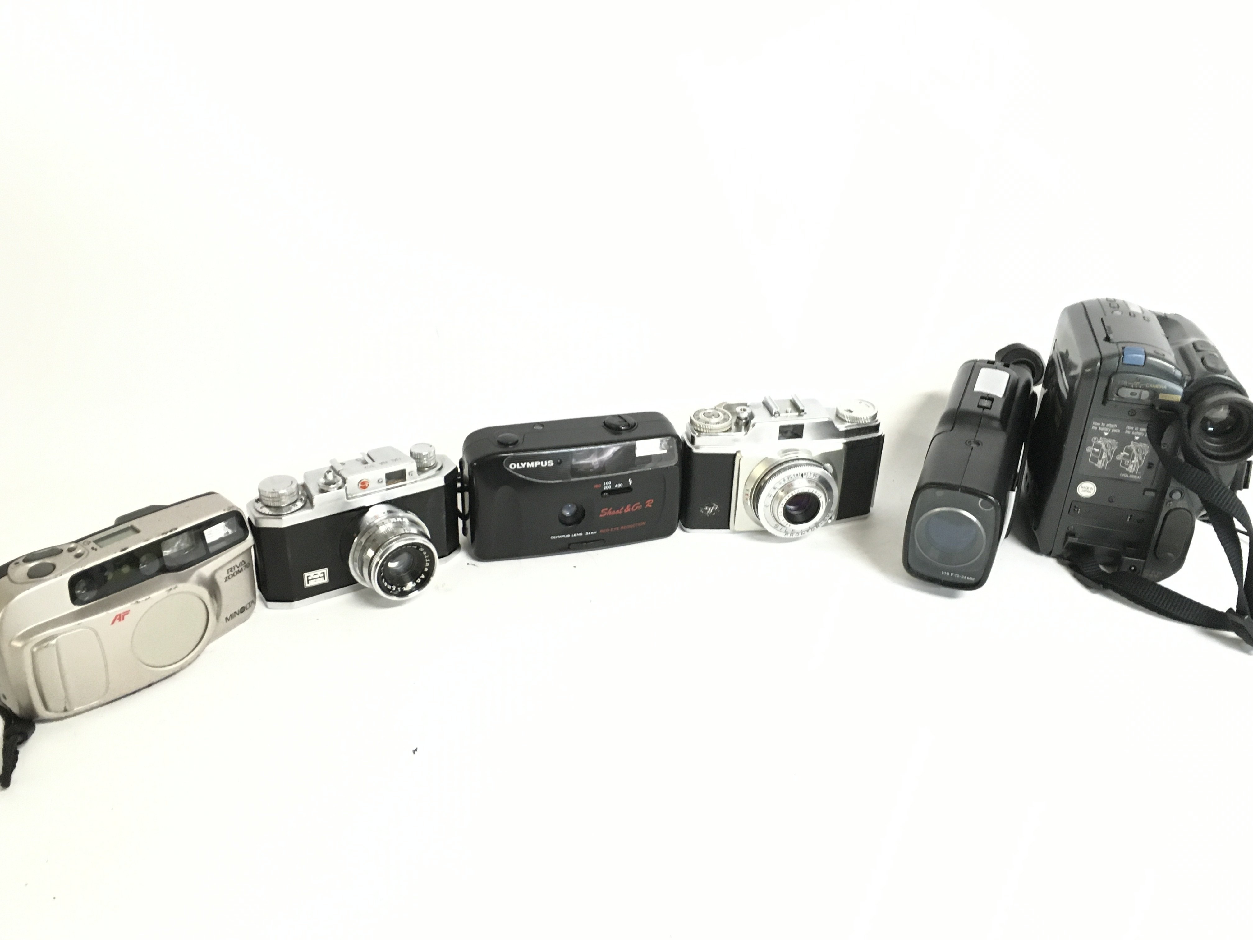 A large collection camera equipment including cameras with cases, photo printers and camcorders including cameras Panasonic M7, Silette prontor svs etc. This lot cannot be posted. NO RESERVE
