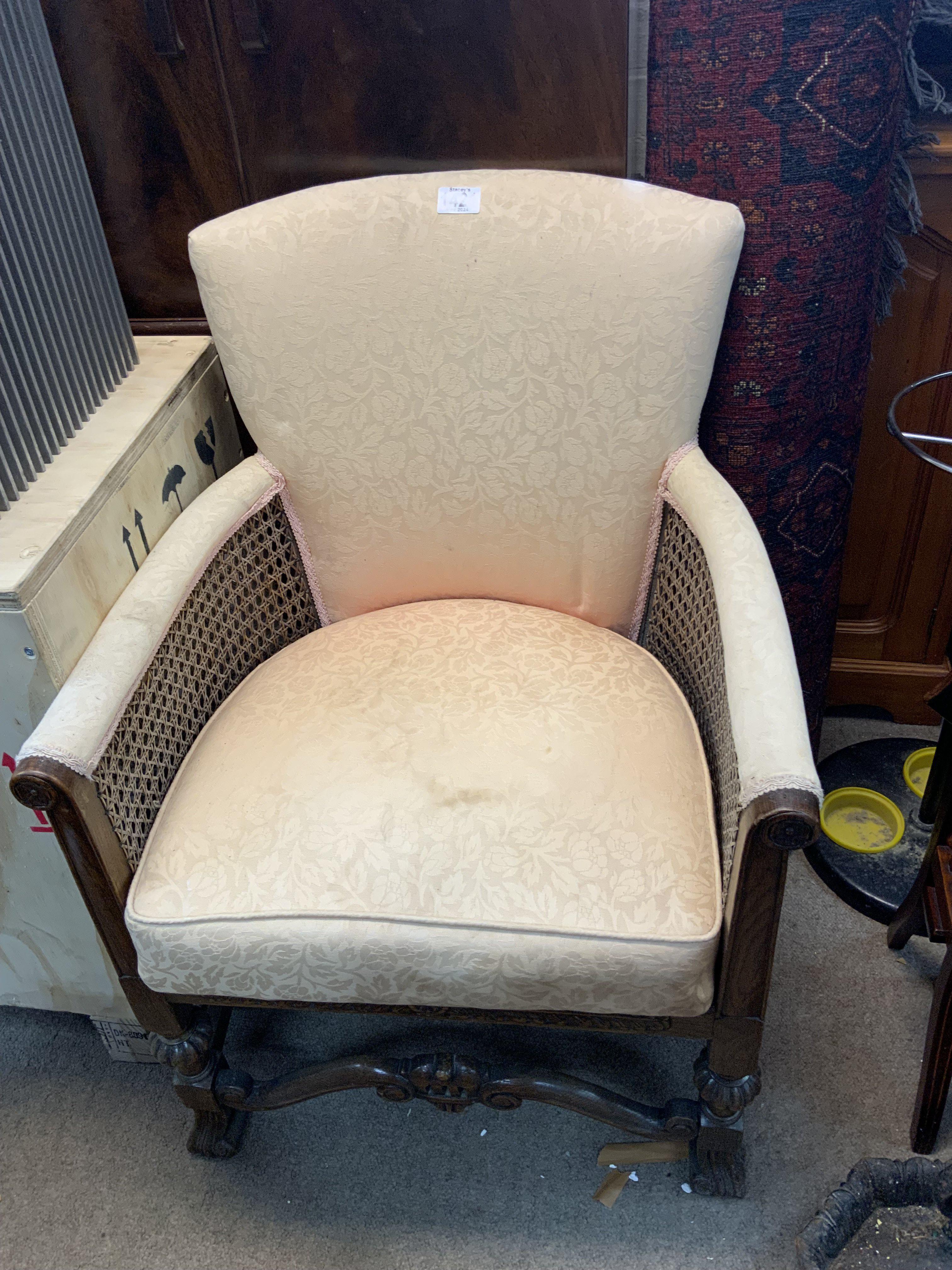 A small 1930s oak framed pink upholstered Berger style tub chair. NO RESERVE