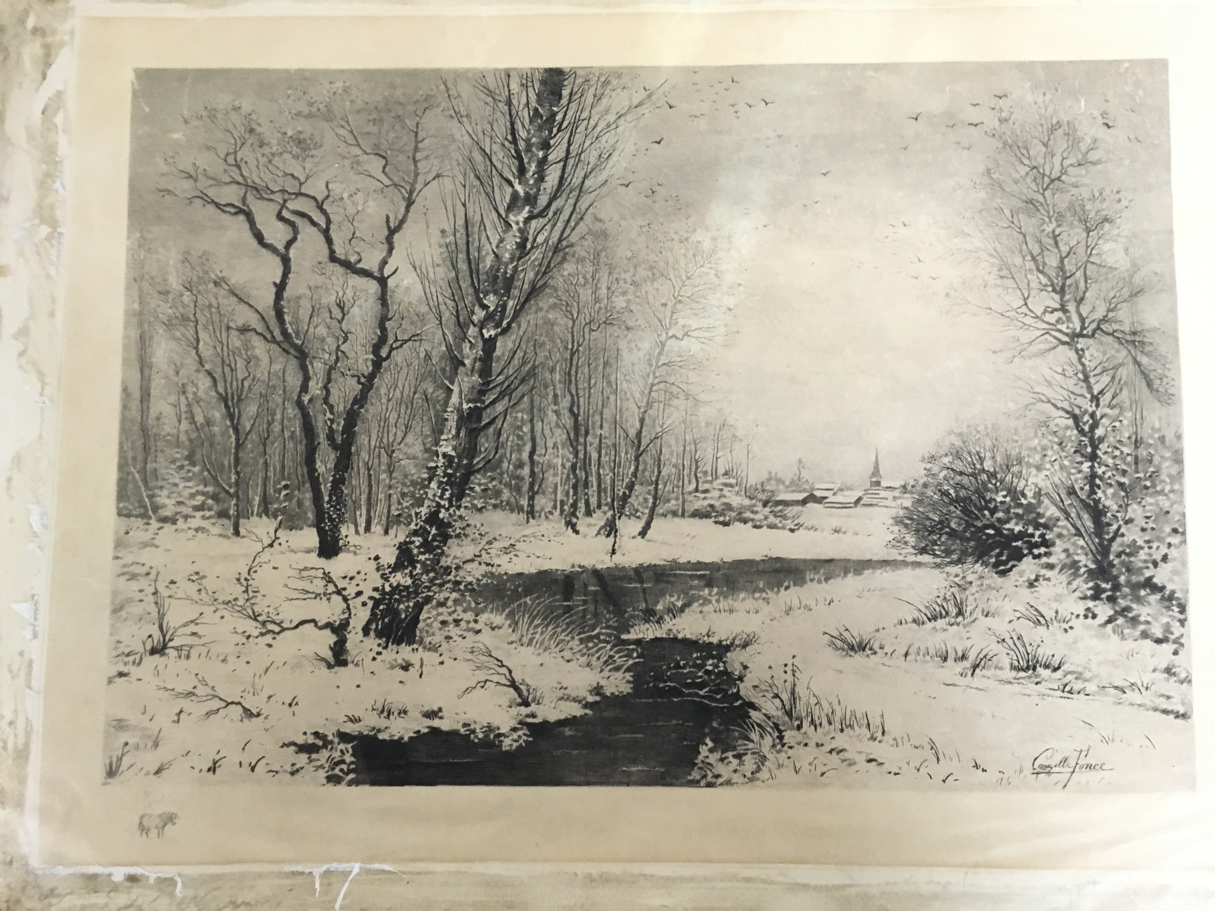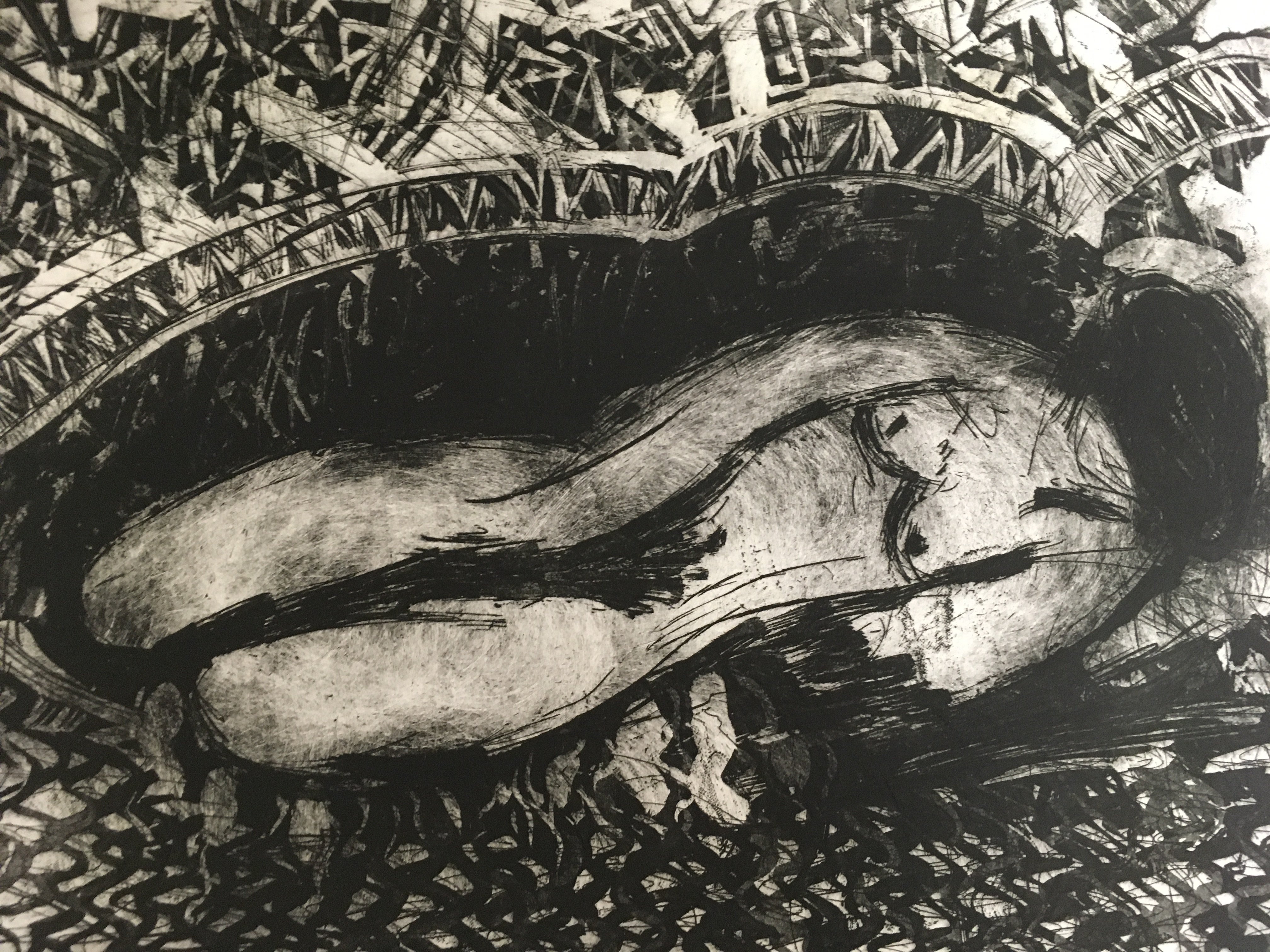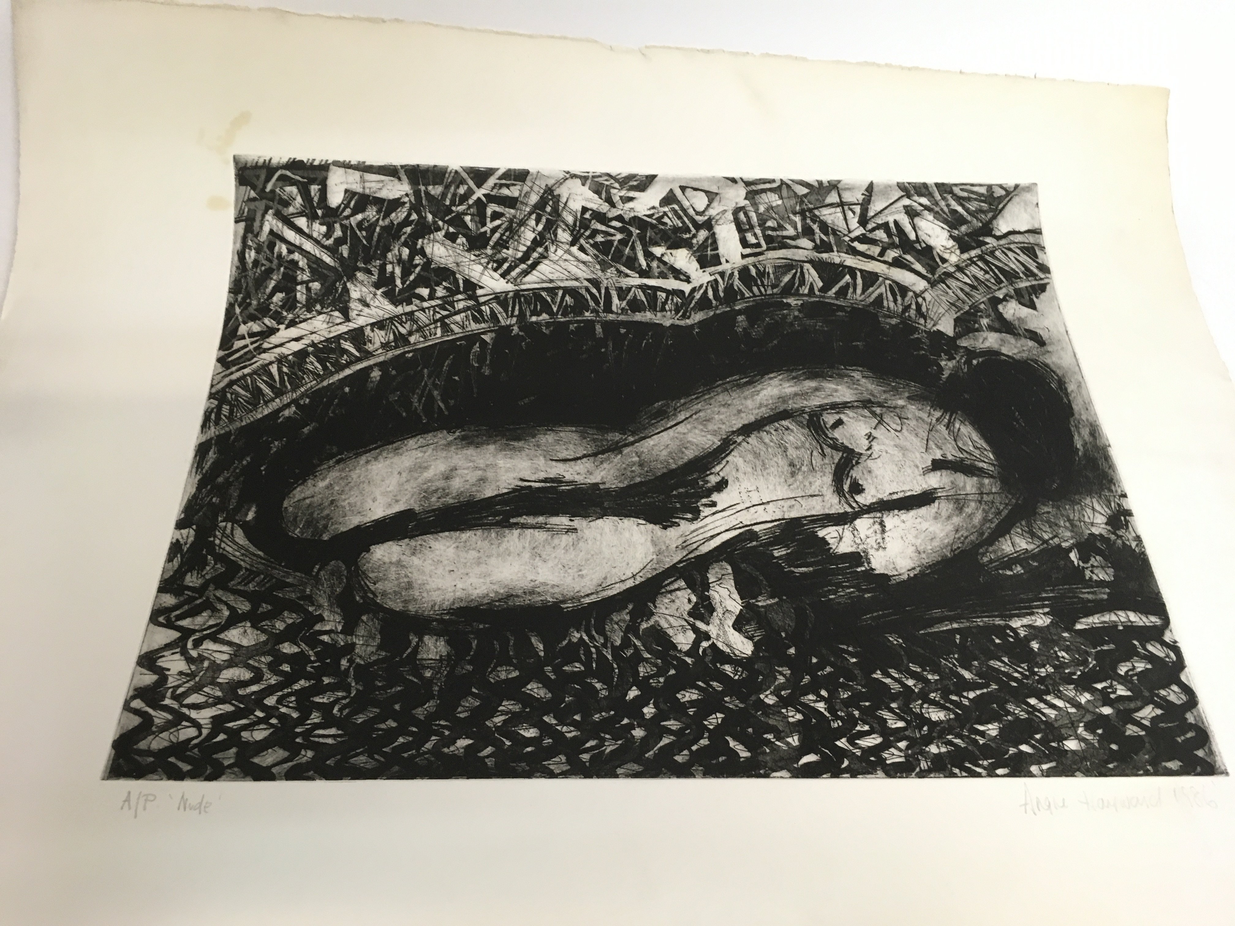 Two unframed modern dry point signed watercolours, a nude signed Angie Hayward 1986 and a winter forest view signed Cangille Fonce 75x58cm and 46x65cm. Postage category B