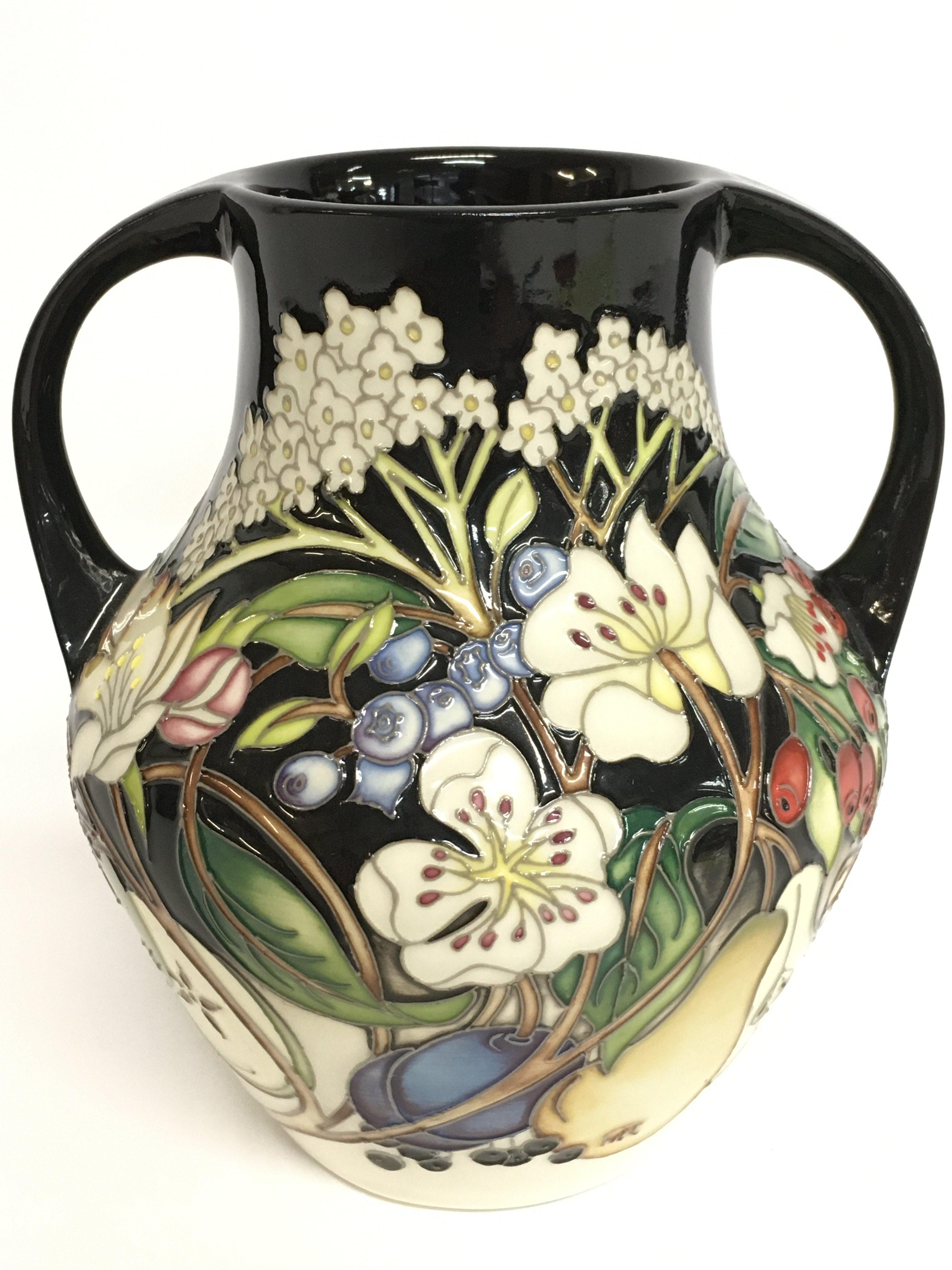 A Moorcroft Nicola Slaney two handled vase , 17.5cm tall. No obvious damage or restoration, this lot cannot be posted.