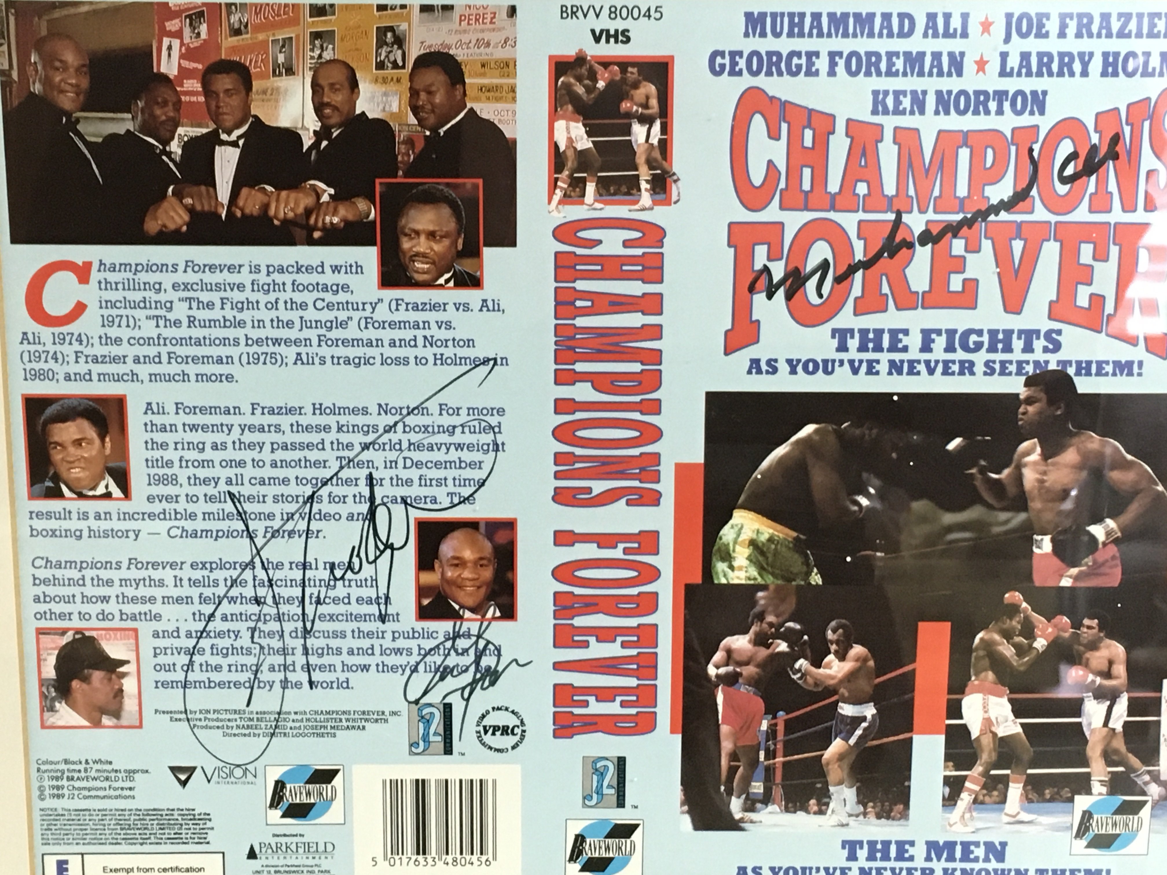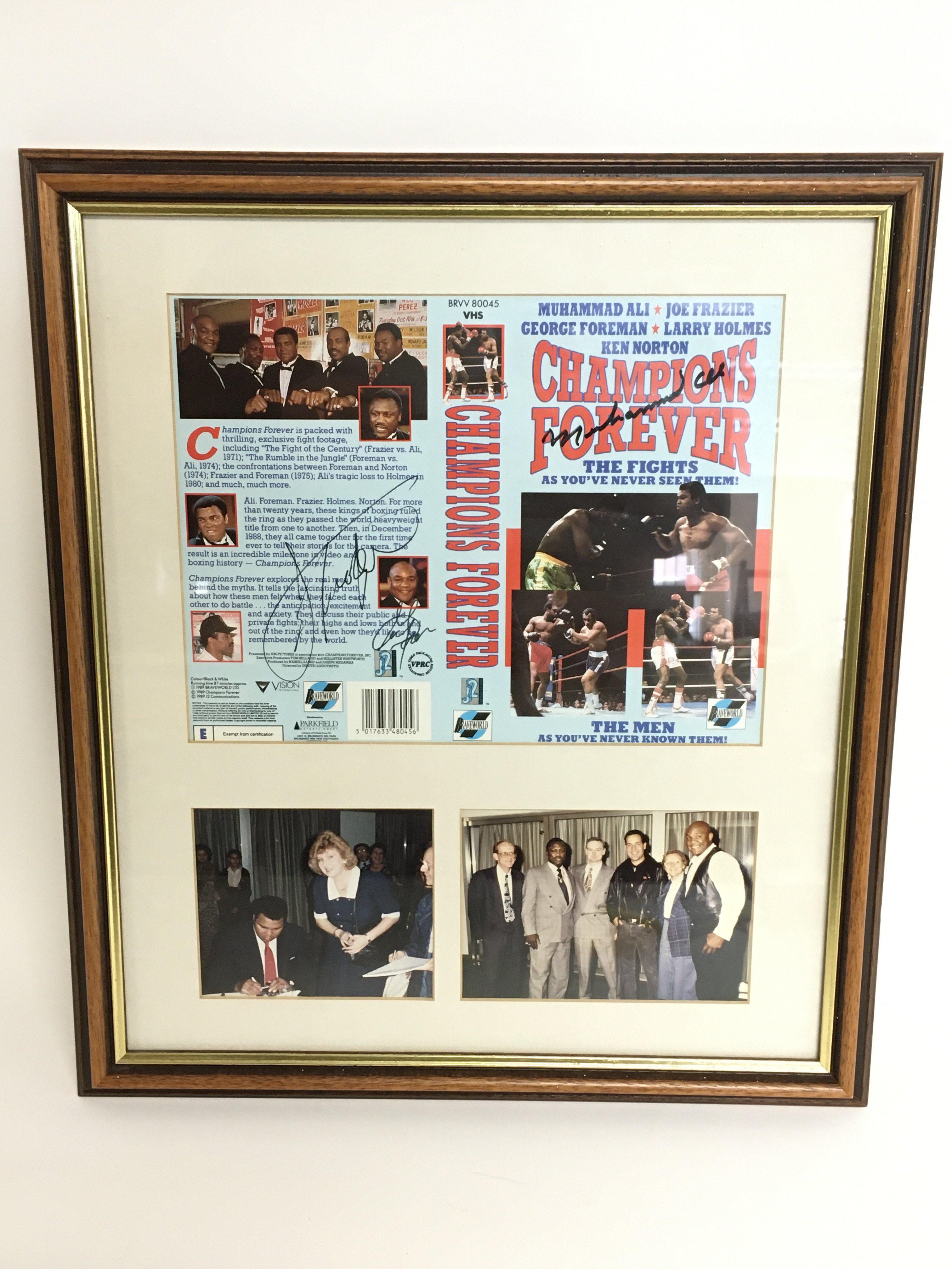 A signed Champions Forever VHS cover including signatures from Muhammad Ali, George Foreman & Joe Fraizer with photographs. This lot cannot be posted. Frame dimensions 37.5x33cm
