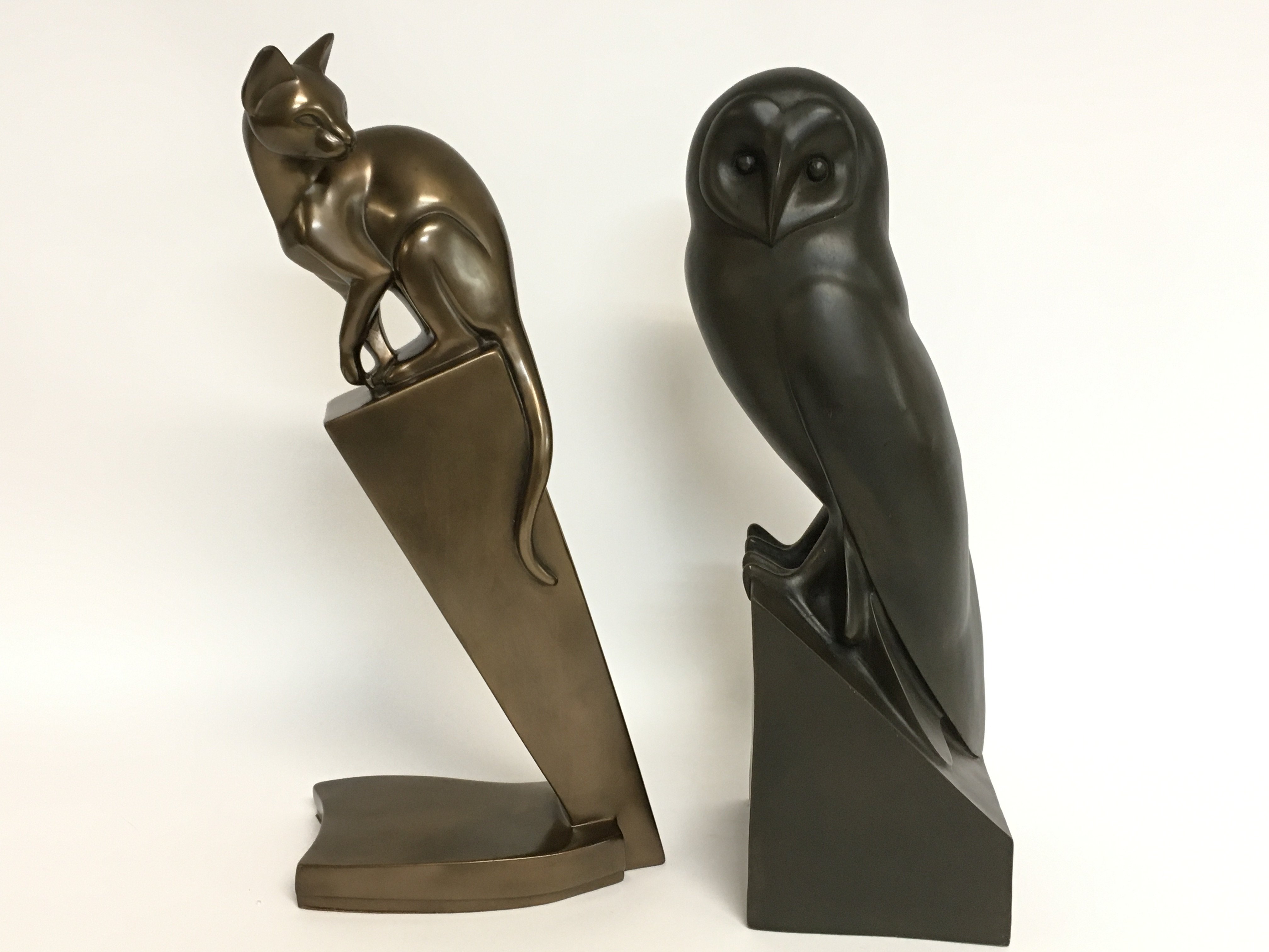 Two cast resin figures, owl and a cat. Approximately 40cm tall. This lot cannot be posted. NO RESERVE