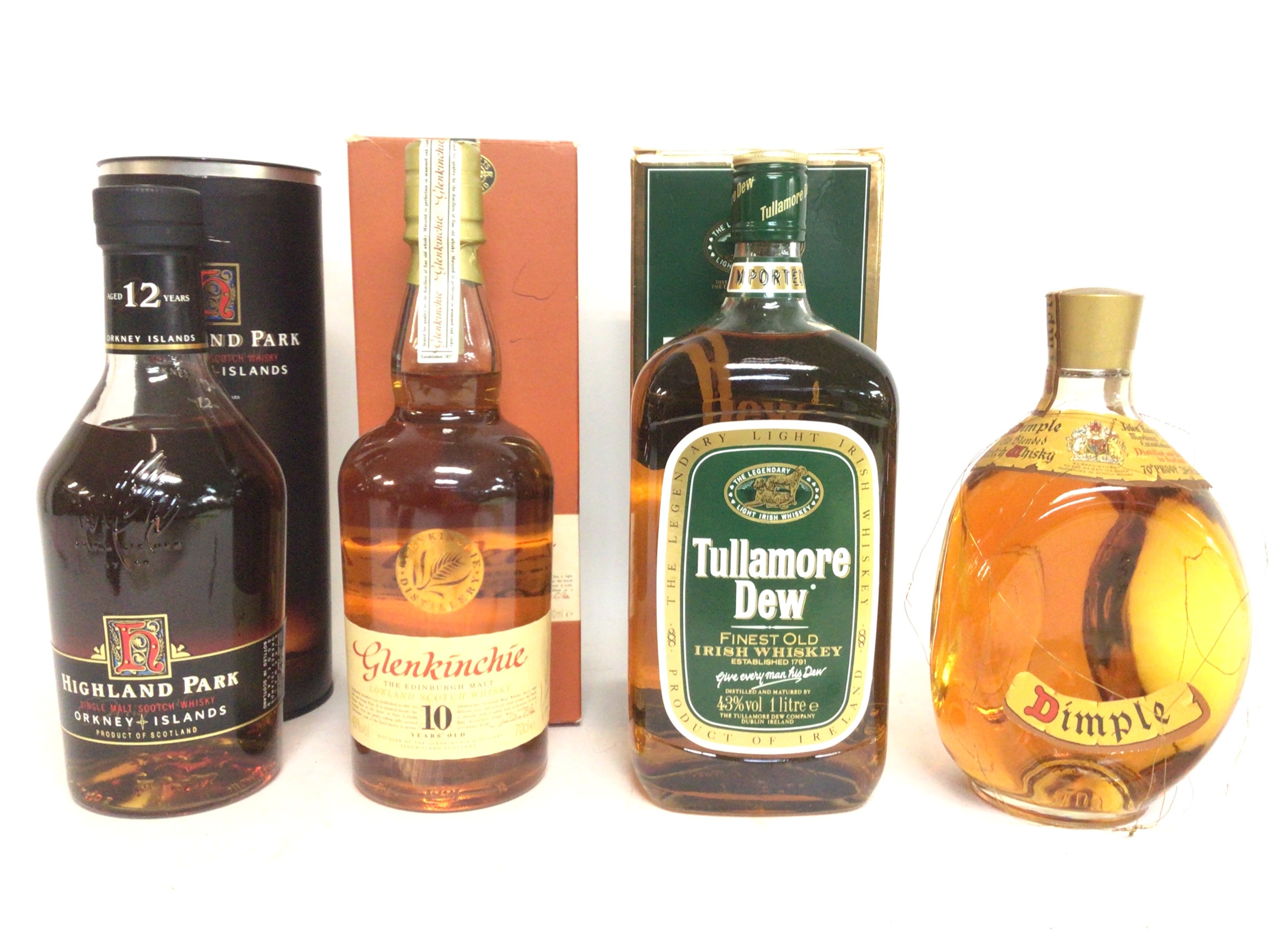 Whiskys including Highland Park Single Malt Scotch Whisky, Glenkinchie The Edinburgh Malt Lowland Scotch Whisky, Tullamore Dew Finest Old Irish Whiskey and Dimple. This lot cannot be posted.