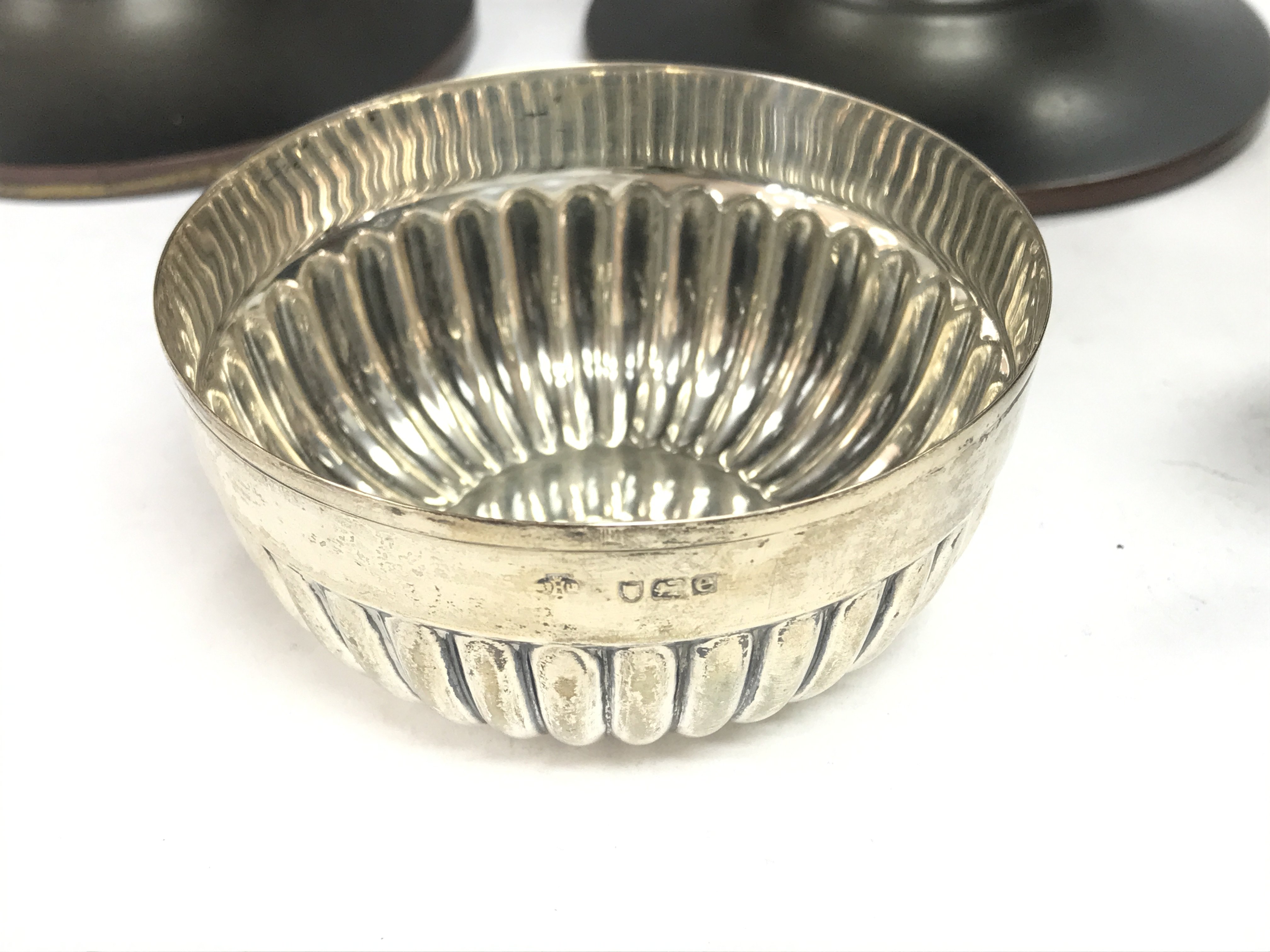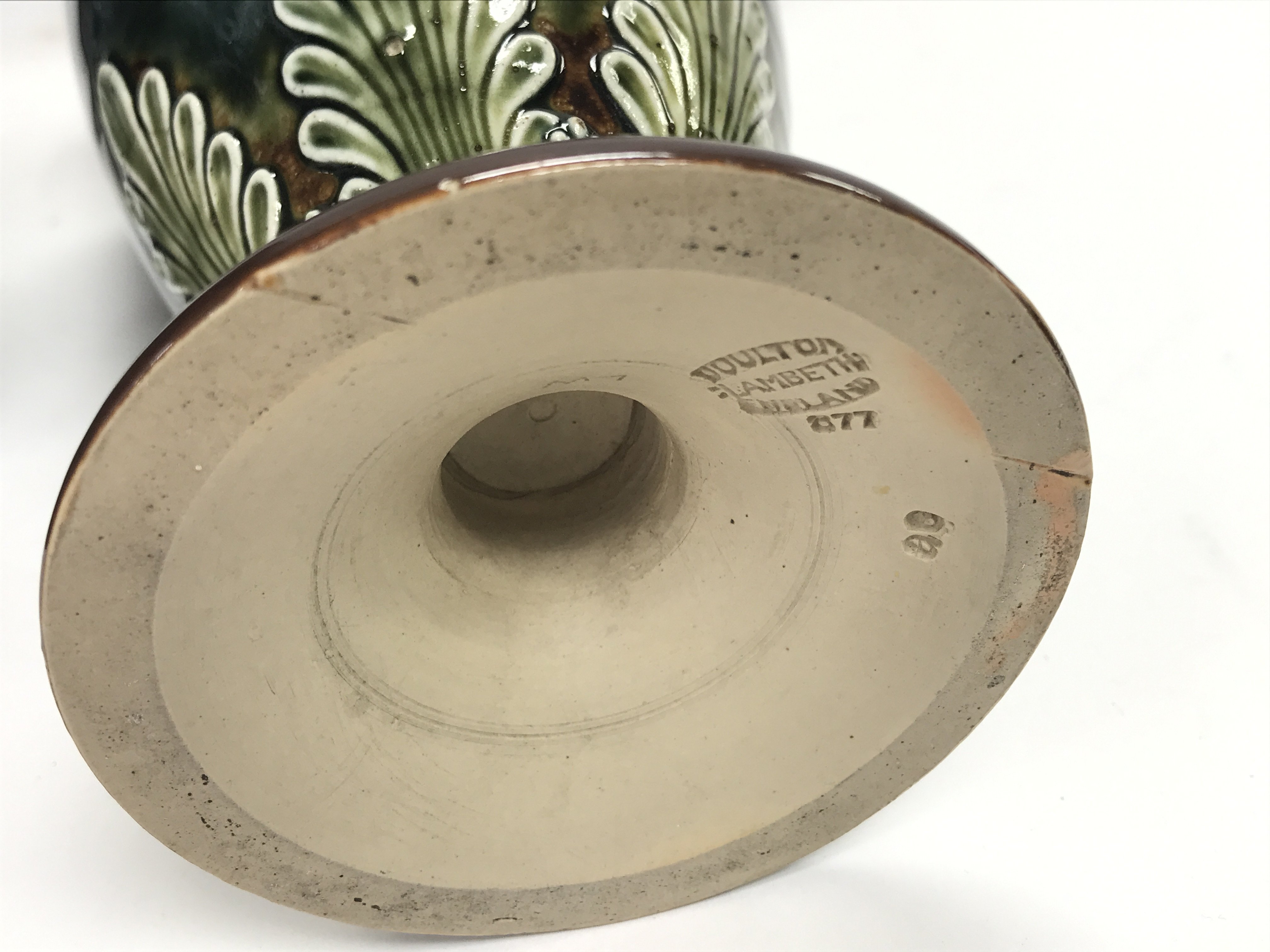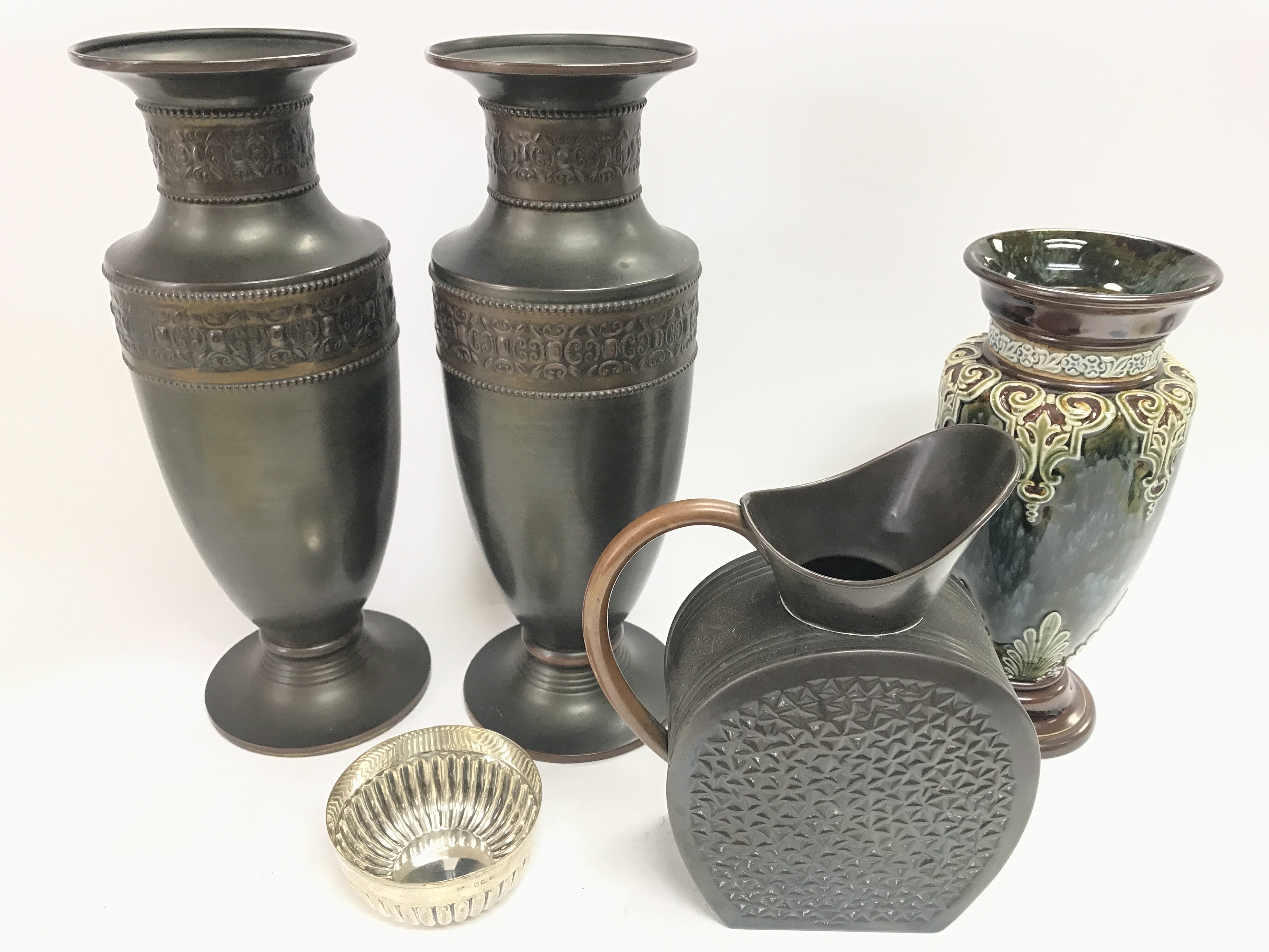 A pair of Dutch copper vases and arts and crafts jug along with a Doulton Lambeth vase and a silver bowl.