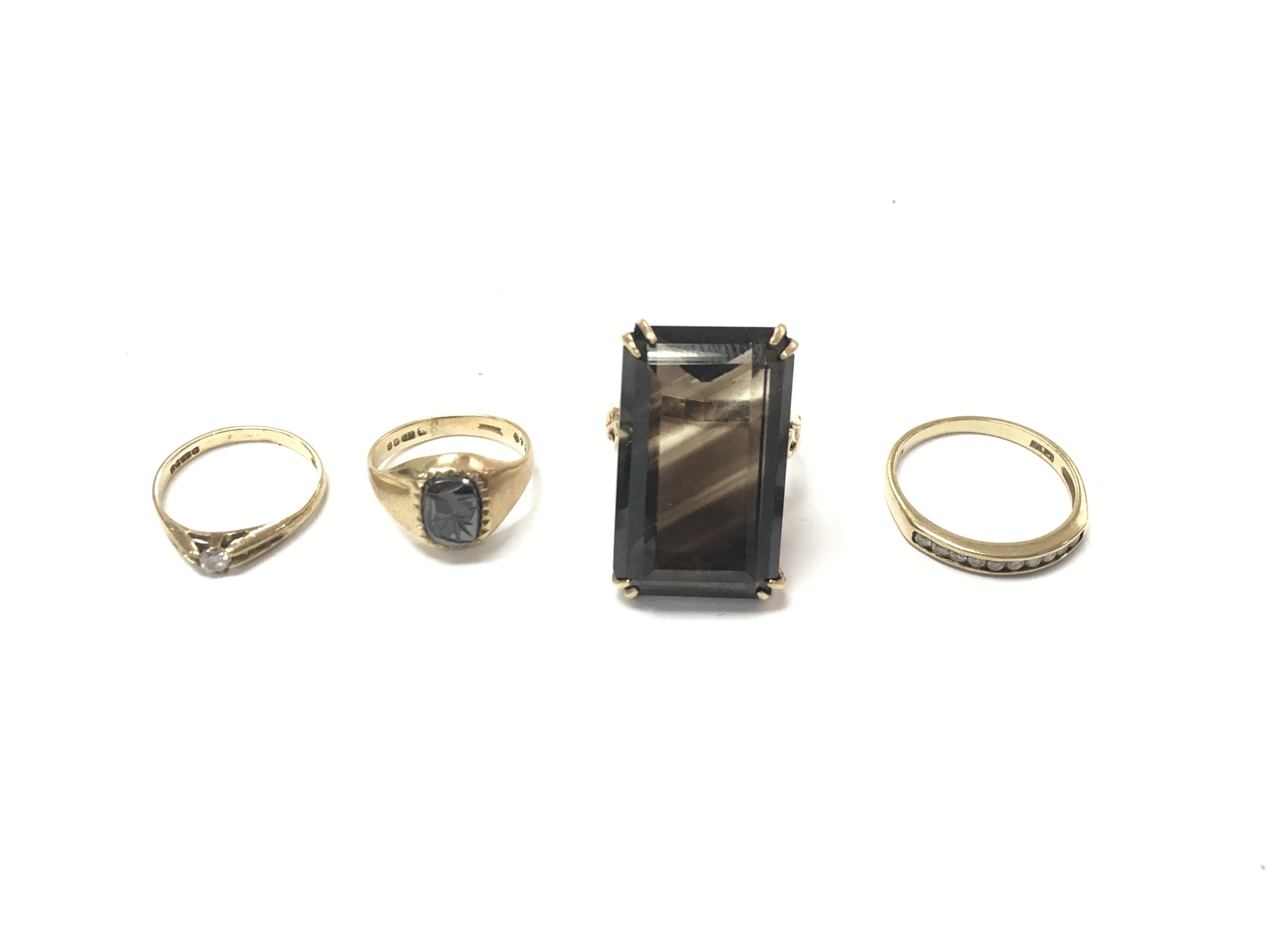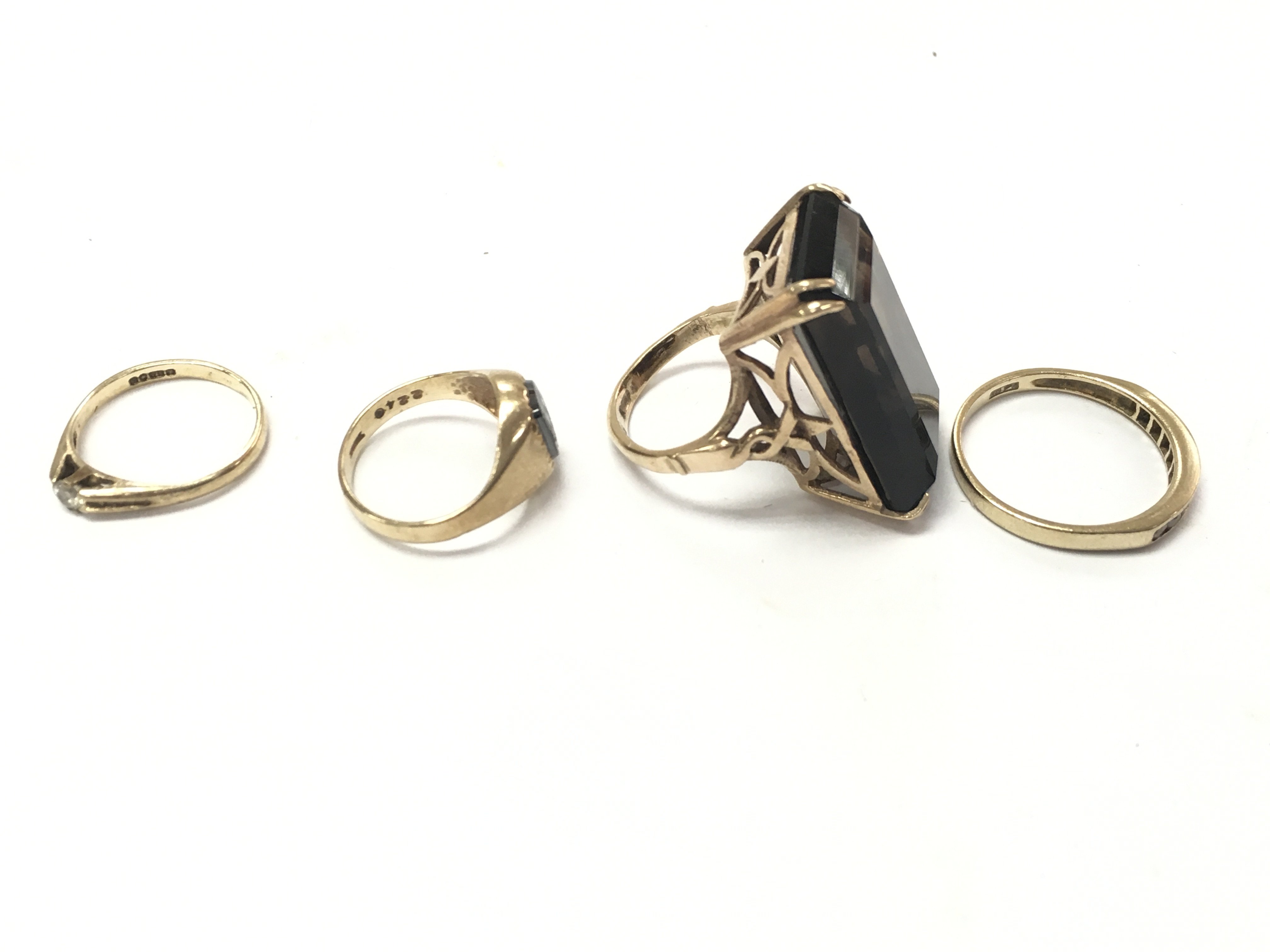 A collection of four 9ct gold rings set with various stones. 13.10g total. Postage B