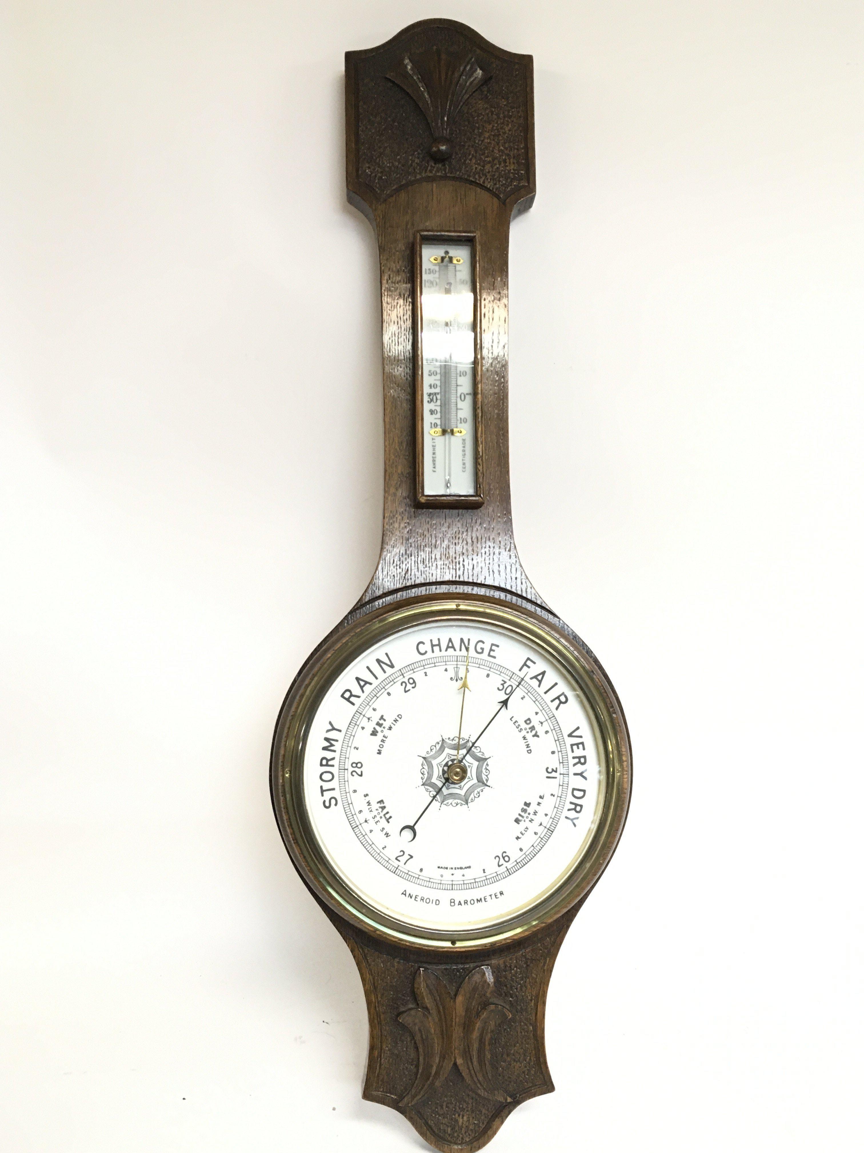 An oak barometer with a damaged mercury box, 80cm tall .this lot cannot be posted. NO RESERVE