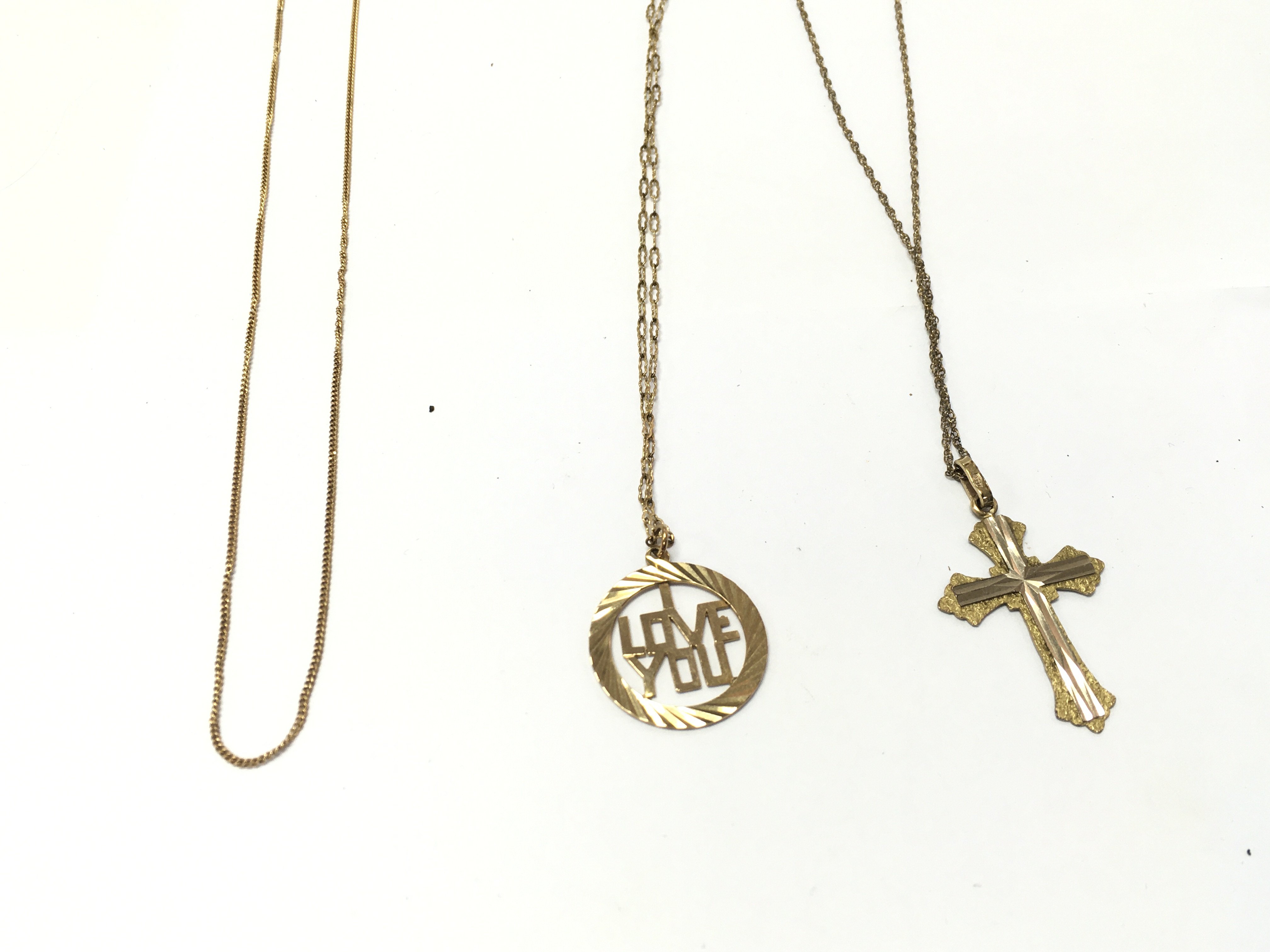 Three 9ct gold chains two with 9ct pendant. Total weight 10.12g Postage A
