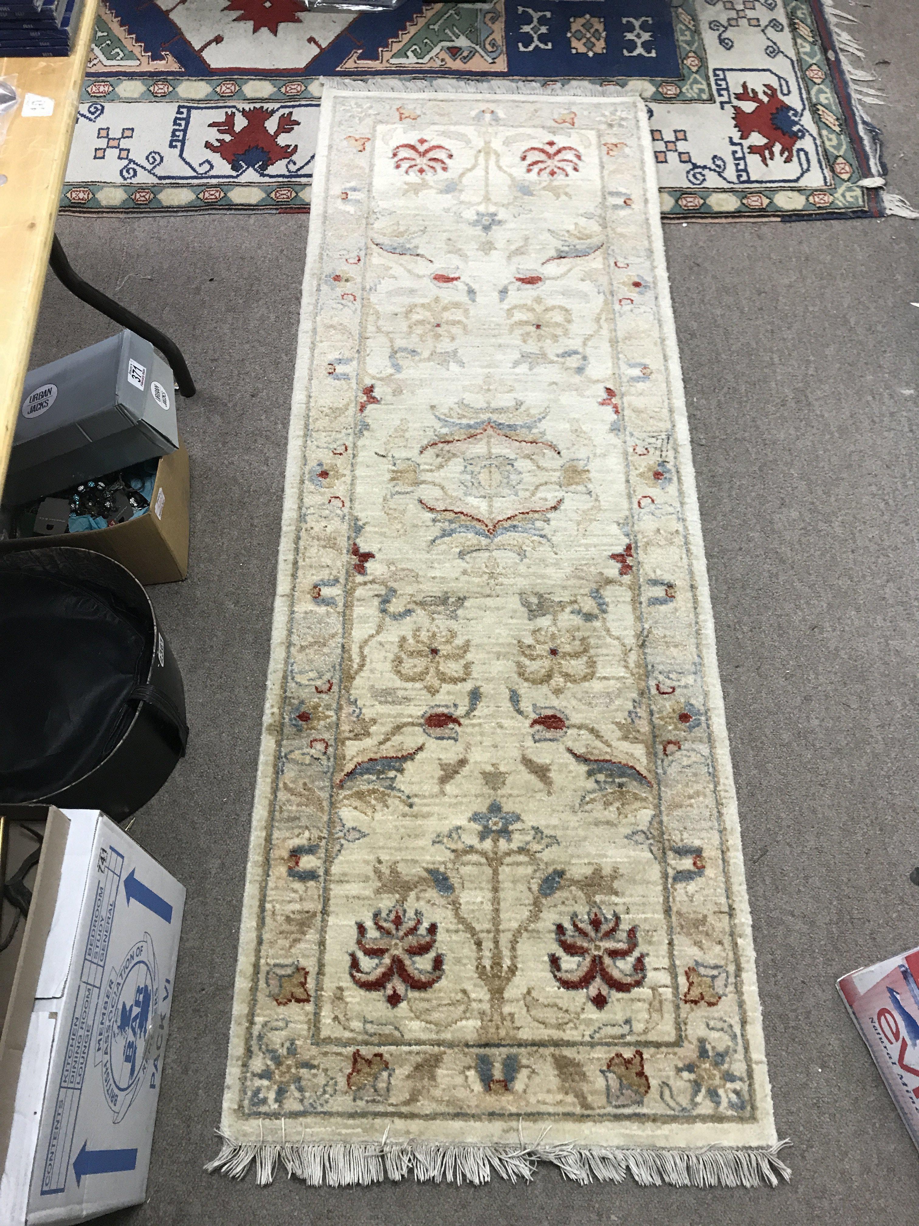 A hand tied wool hall runner rug. 182cm by 64 cm approx. NO RESERVE