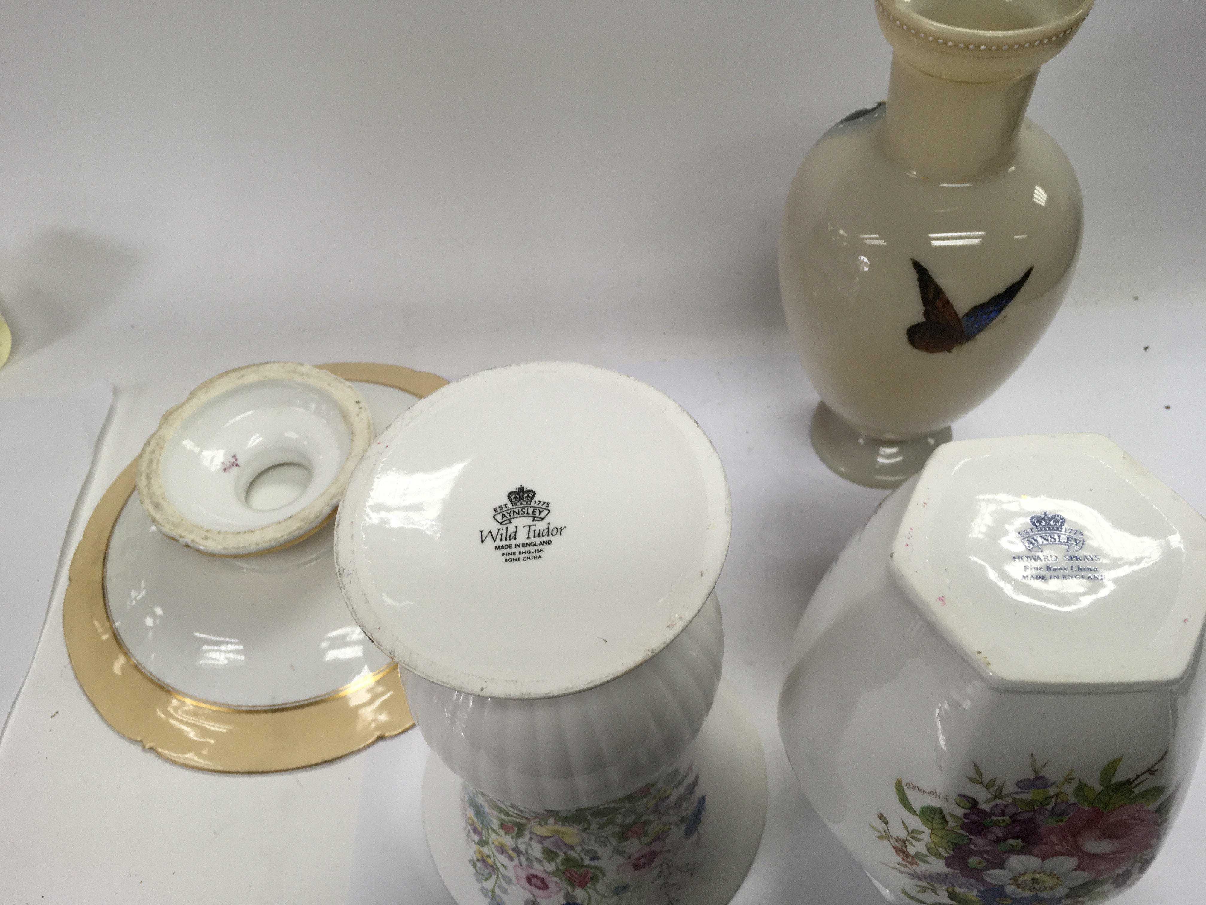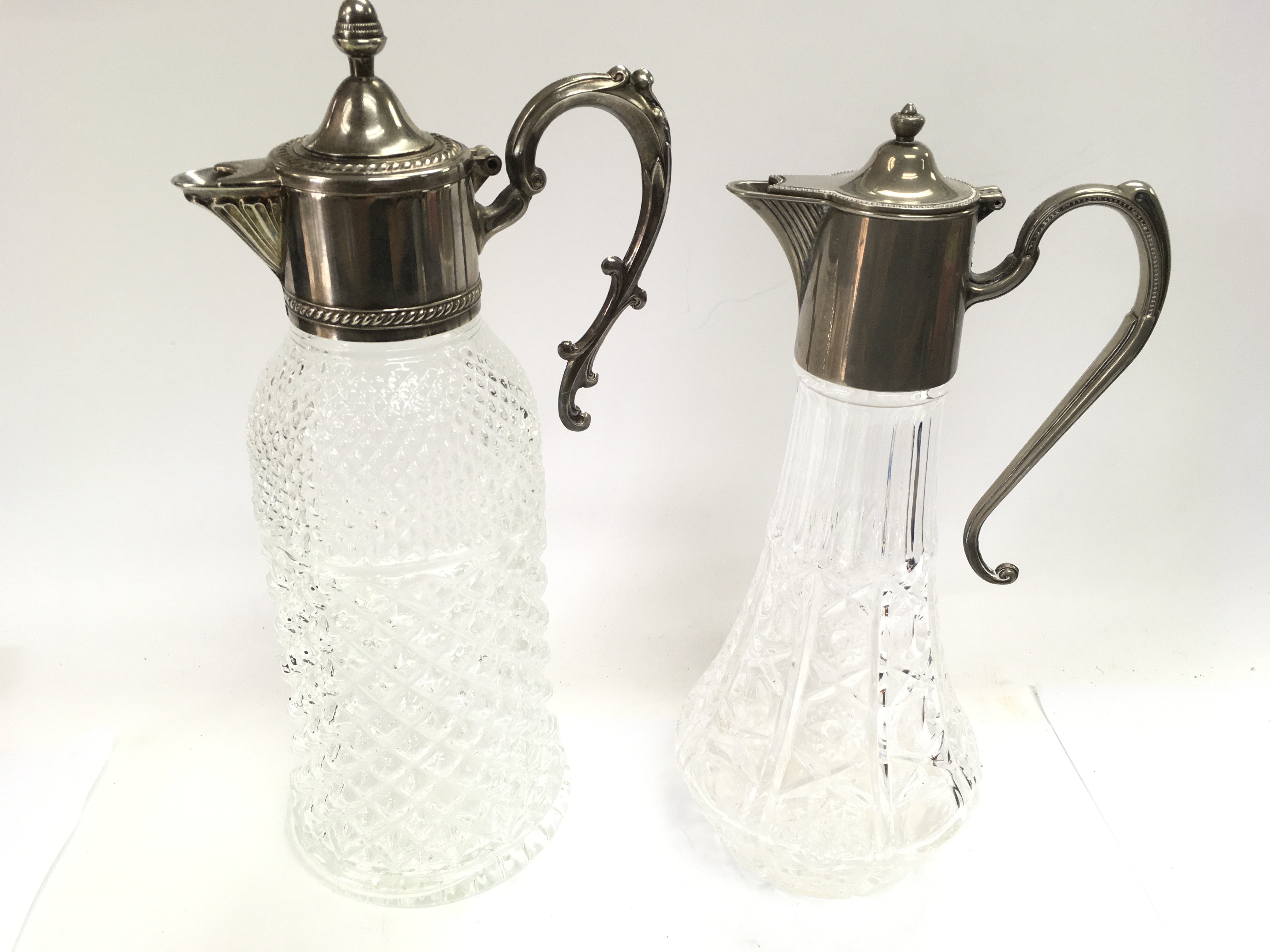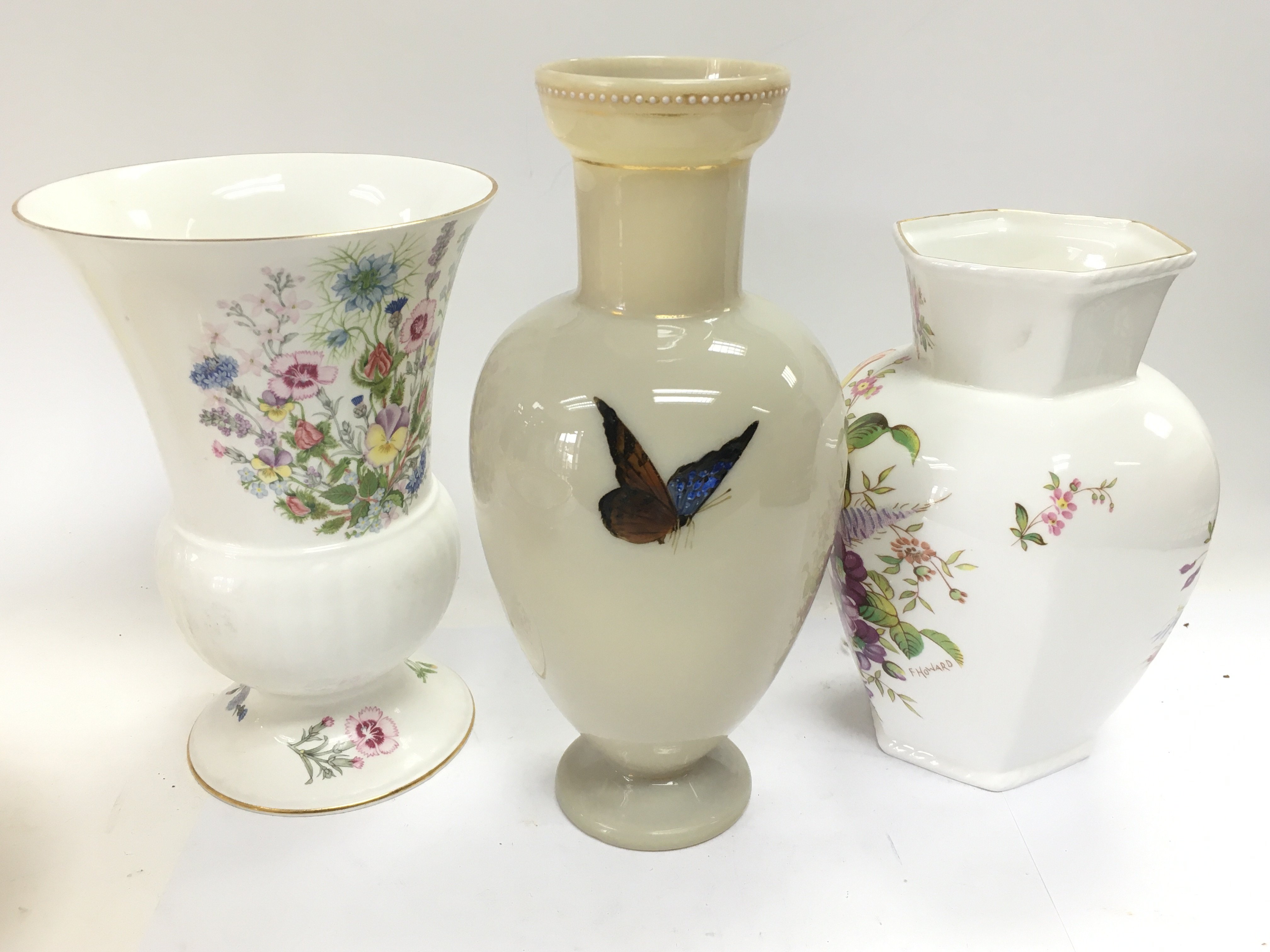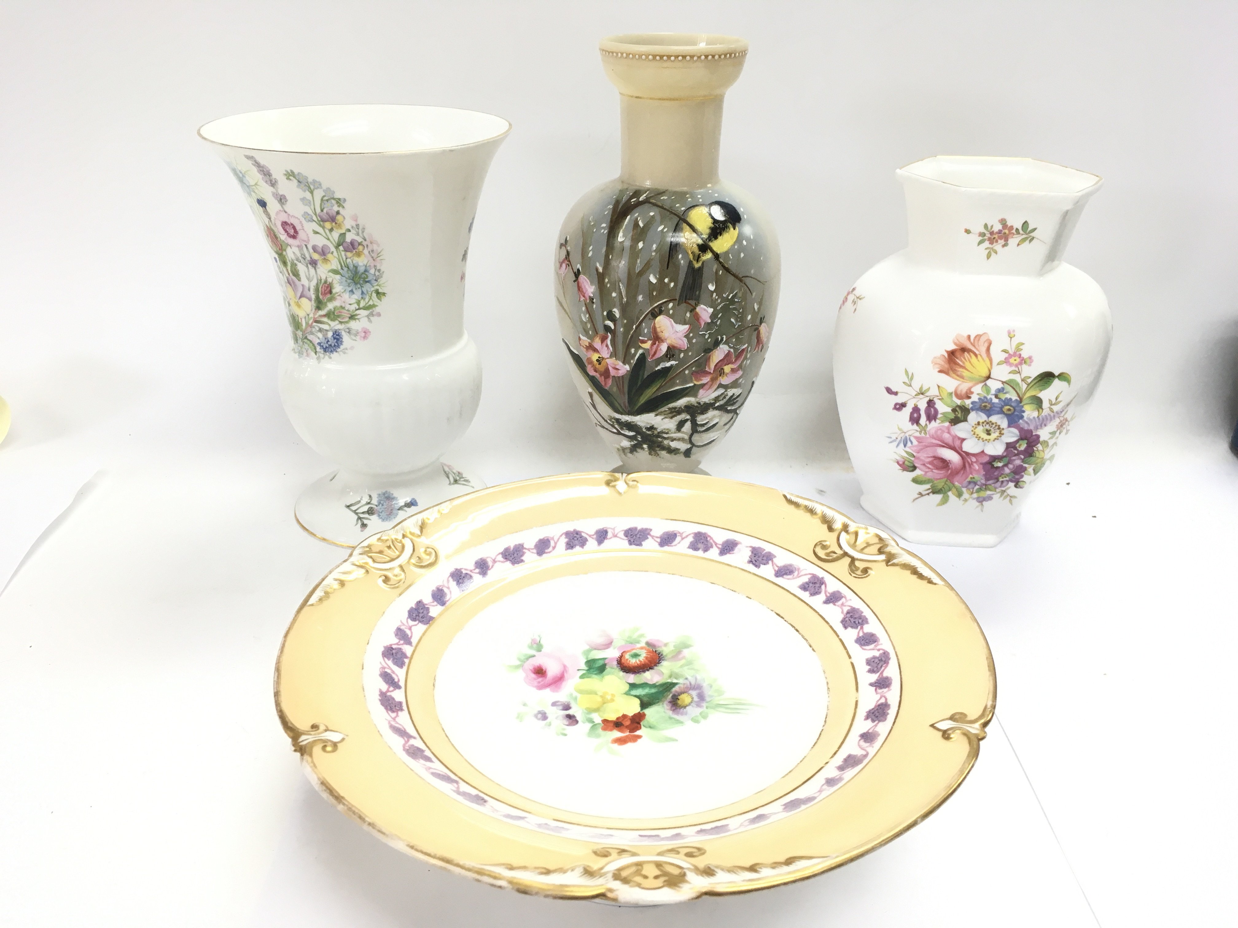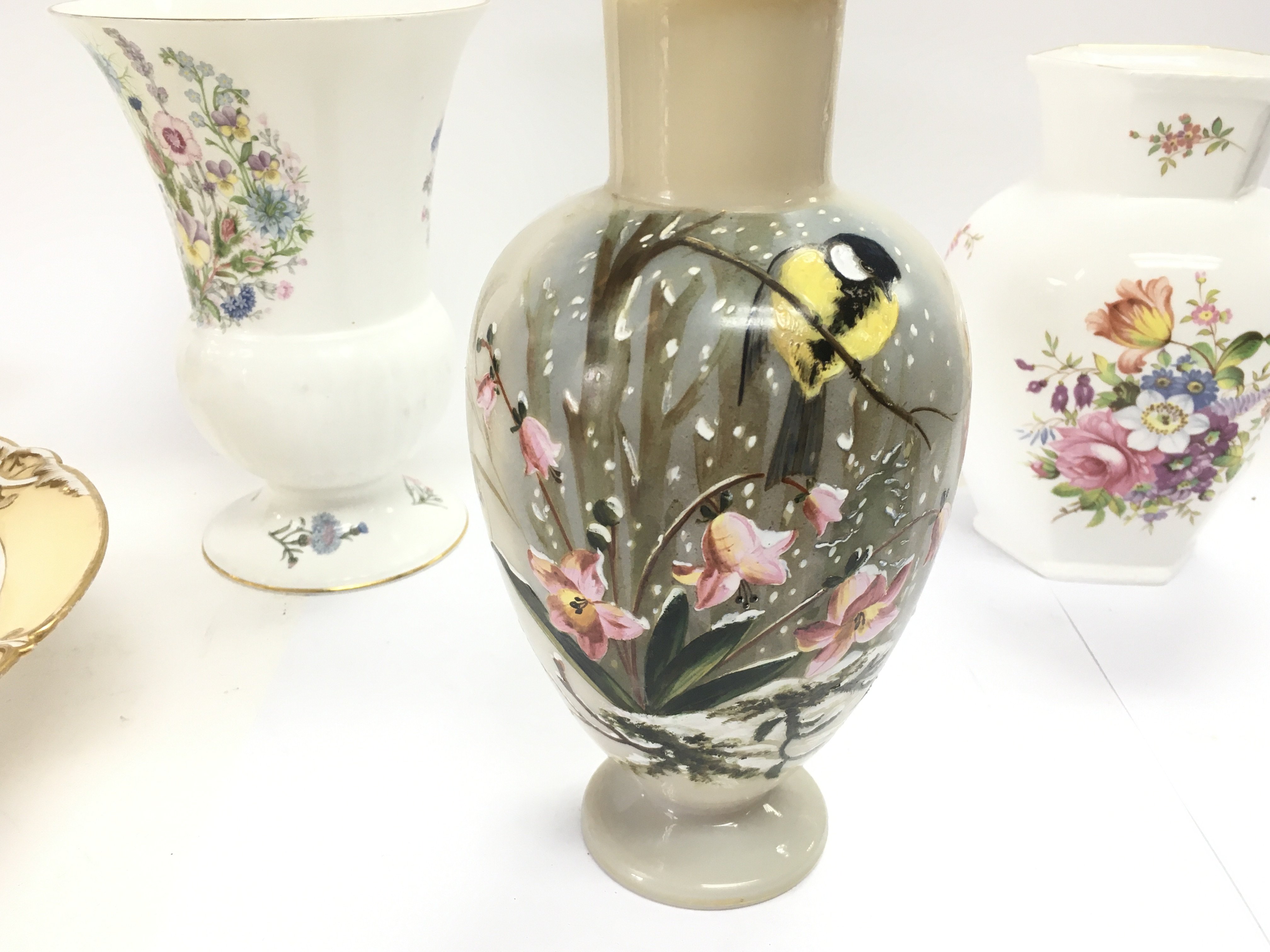 A Victorian hand painted vase with two other vases, two claret jugs and a dish. NO RESERVE