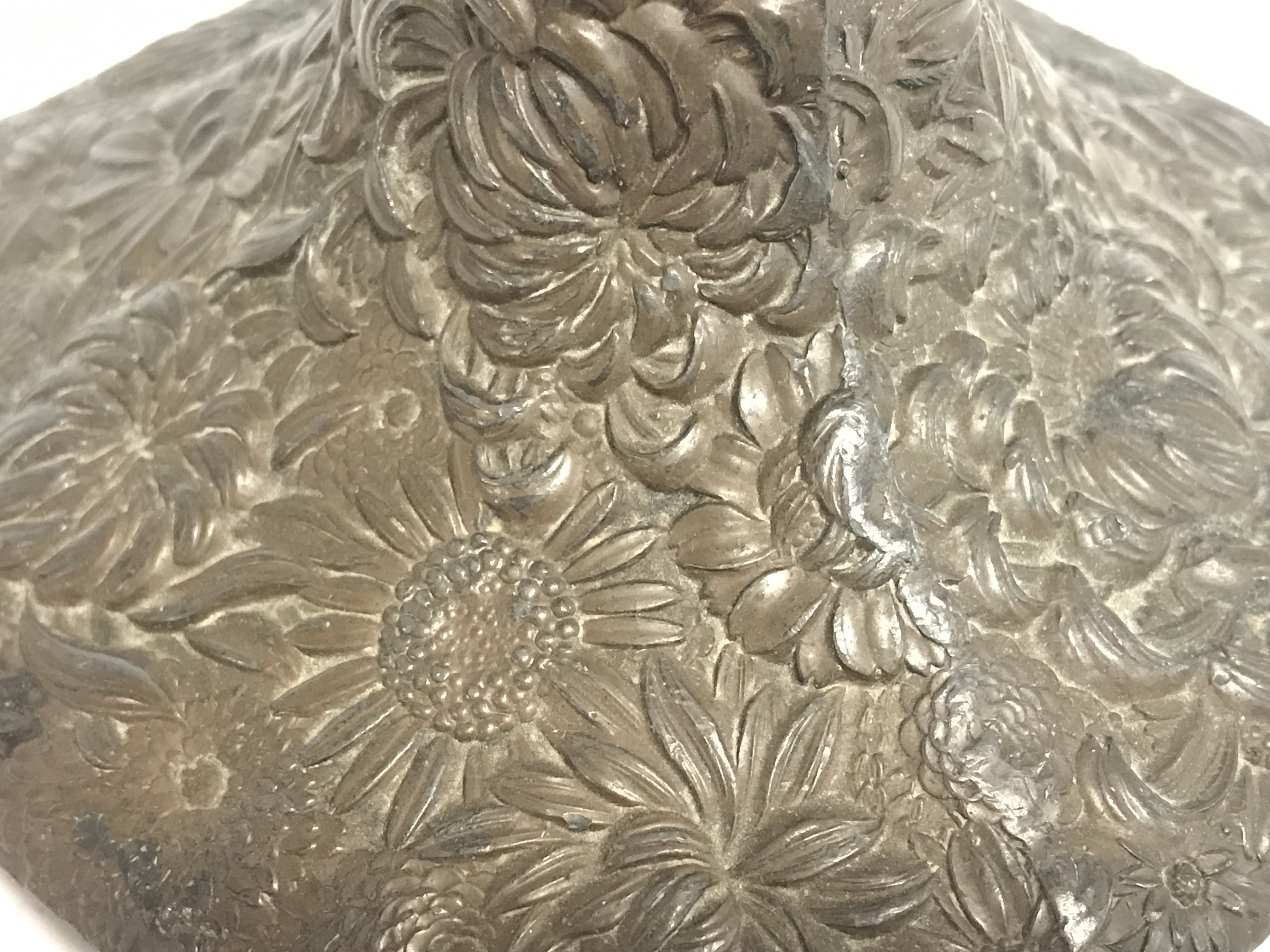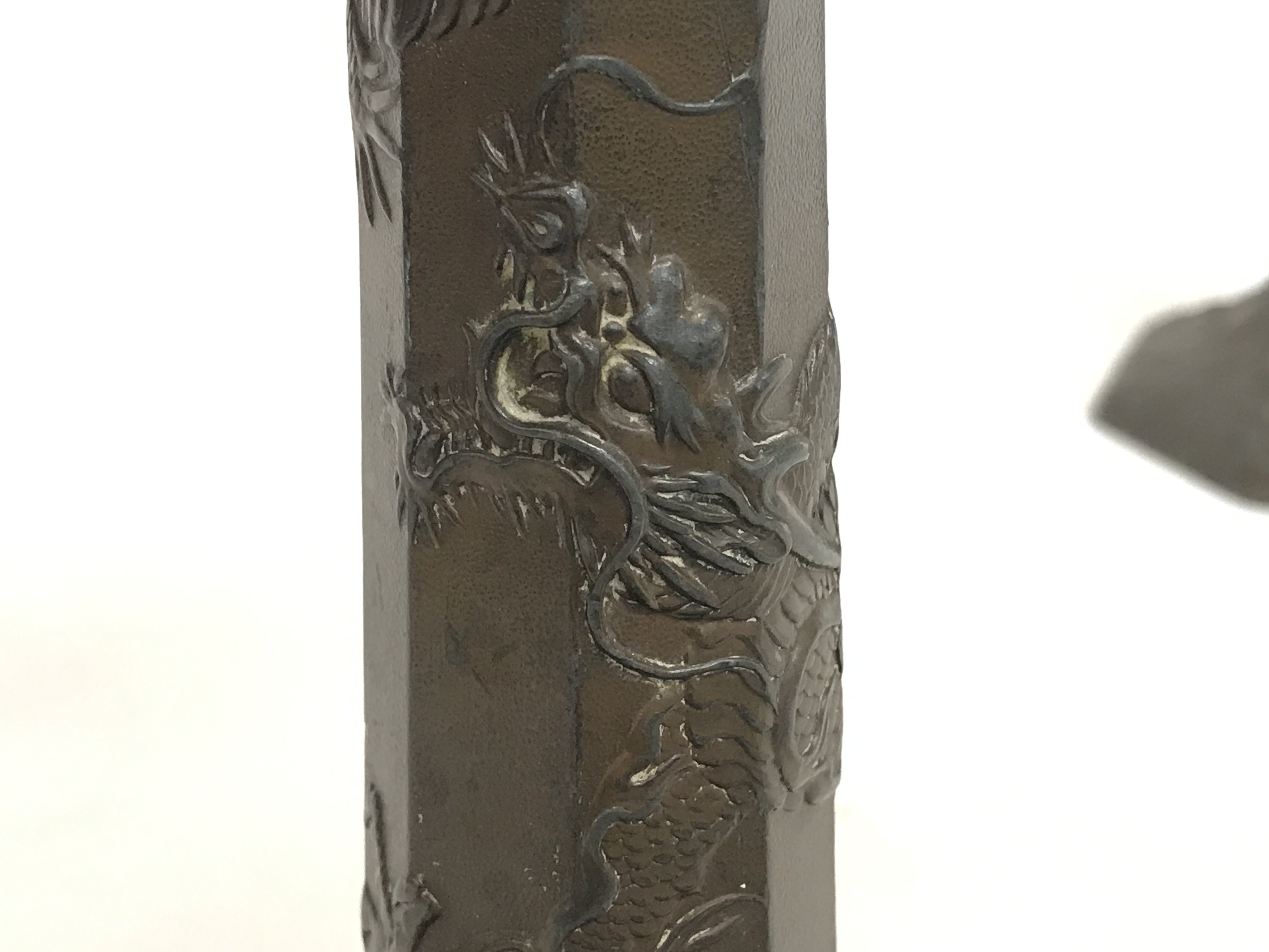 A pair of Japanese metal candlesticks decorated with dragons and flowers. 23cm tall. Postage category c. NO RESERVE