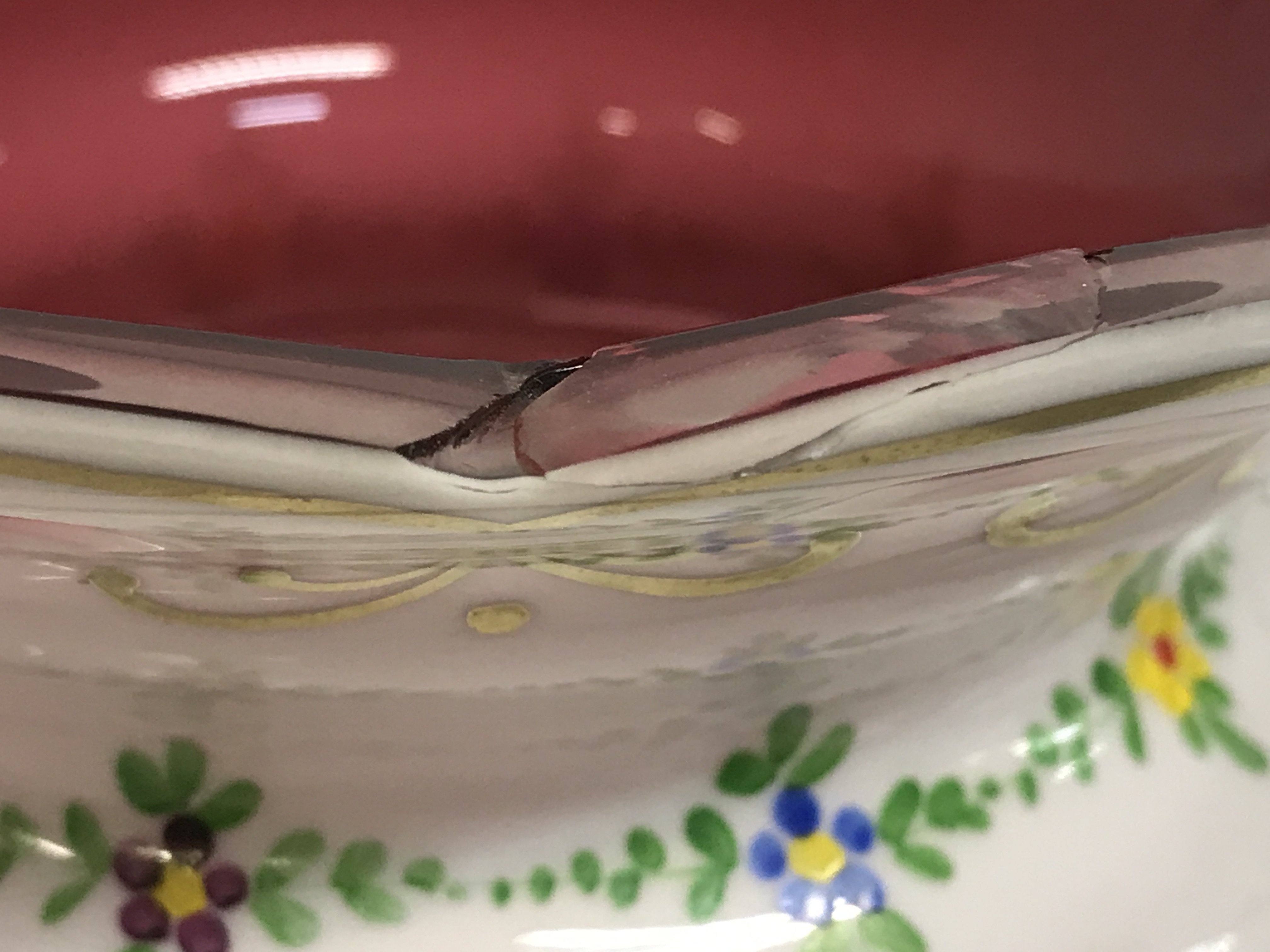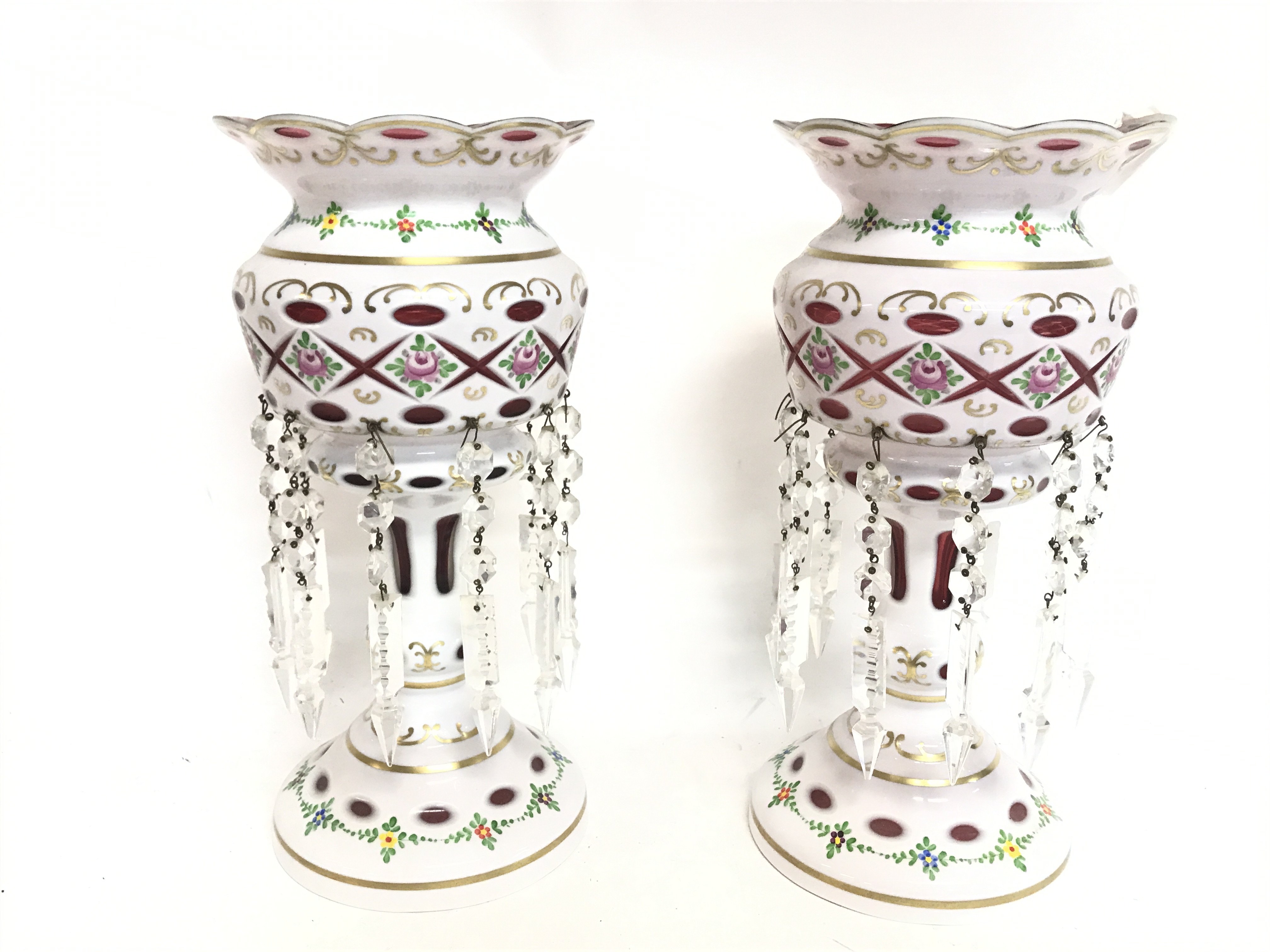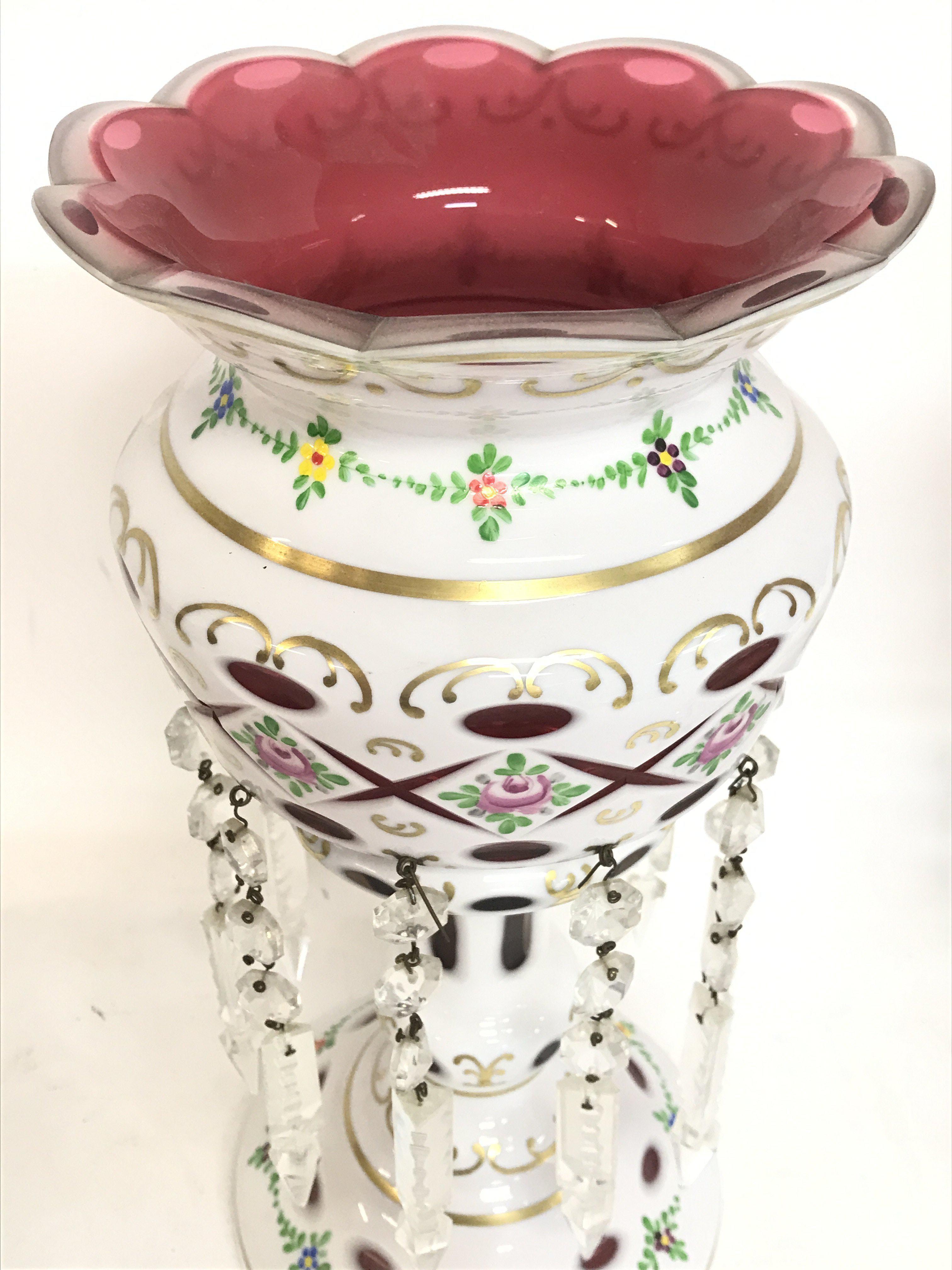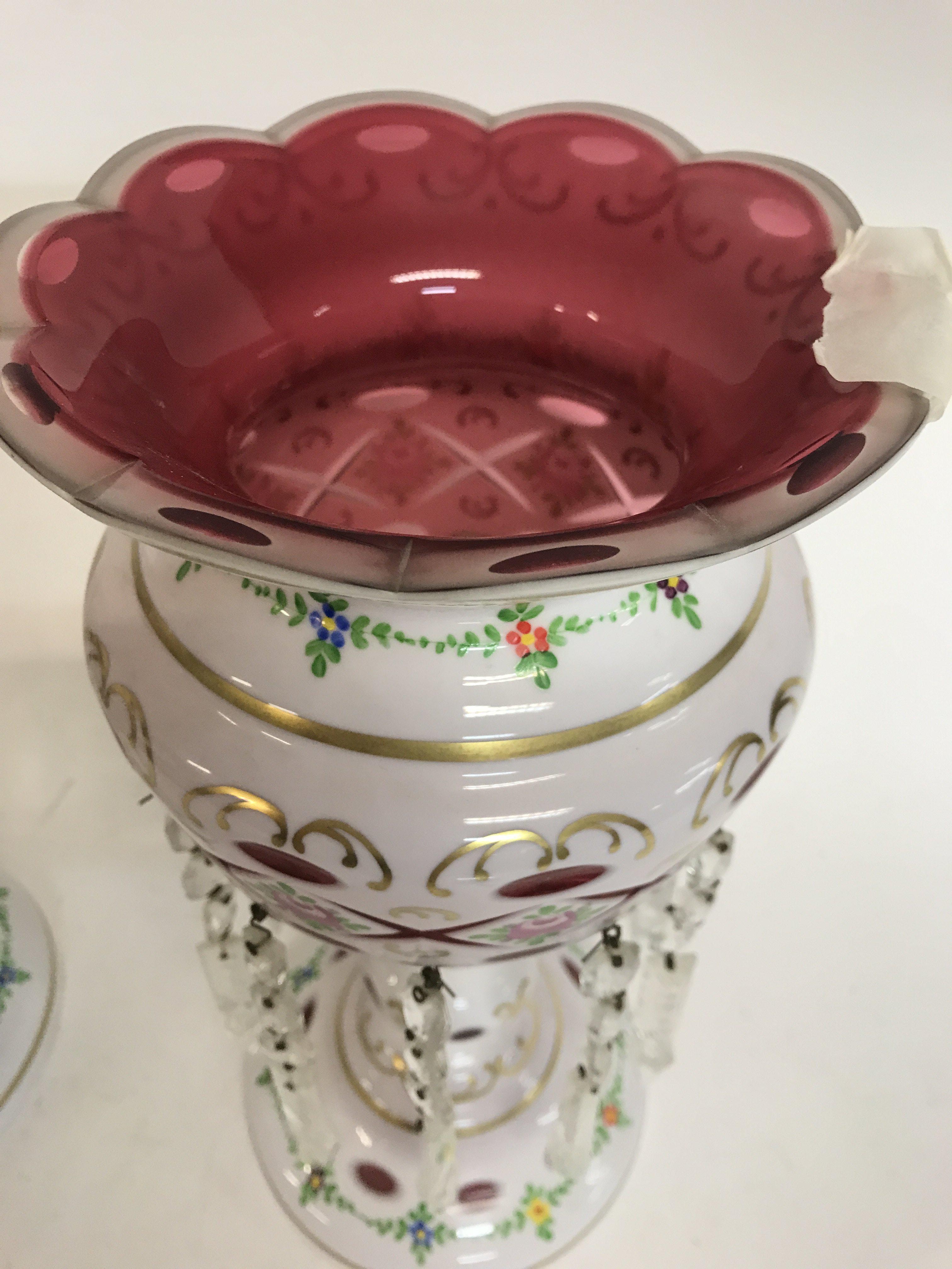 A pair of Victorian white and cranberry glass lustres with hand painted floral decoration, one damaged. 33cm tall. This lot cannot be posted