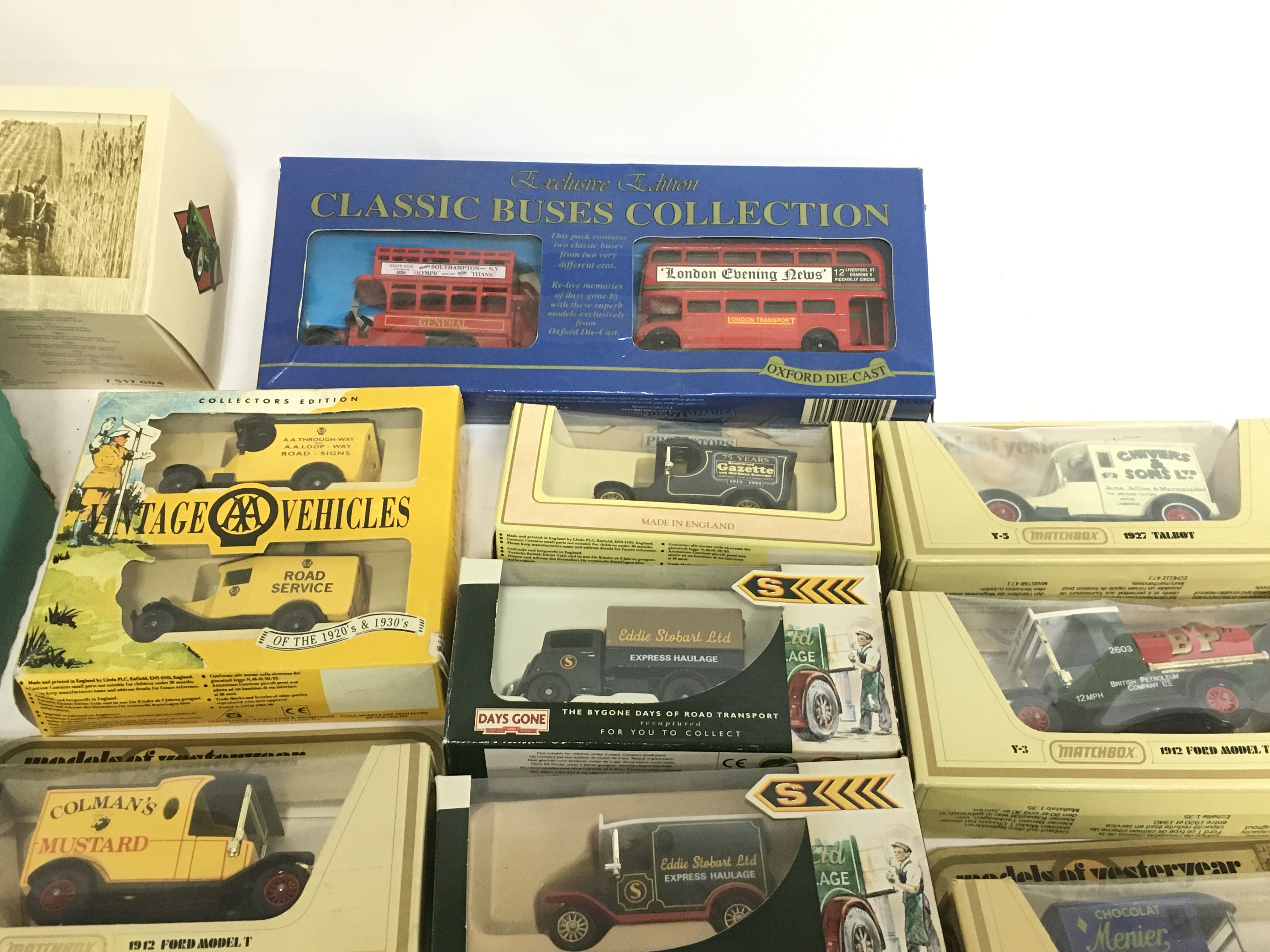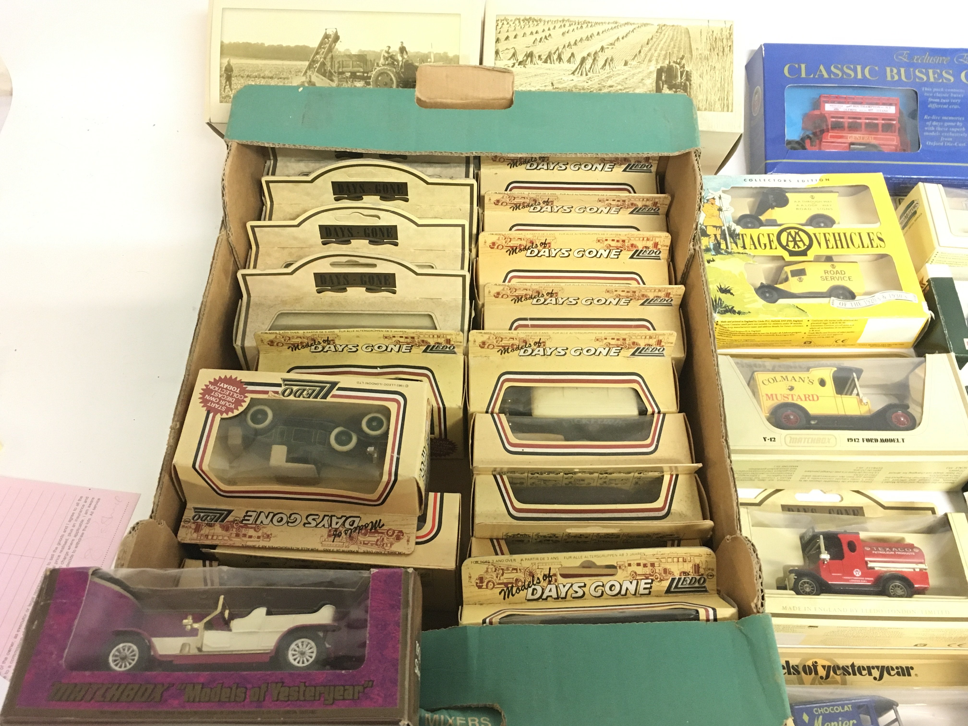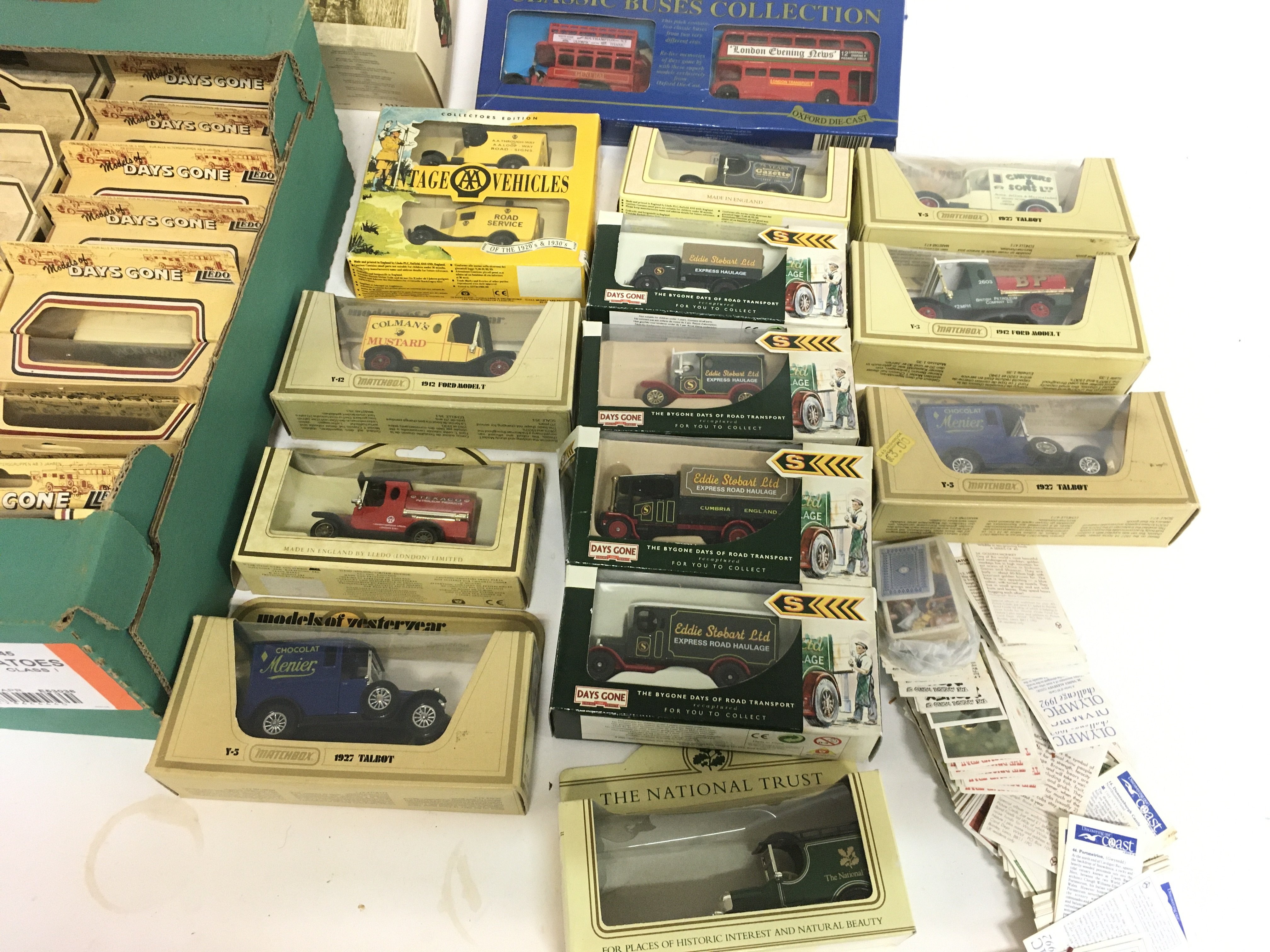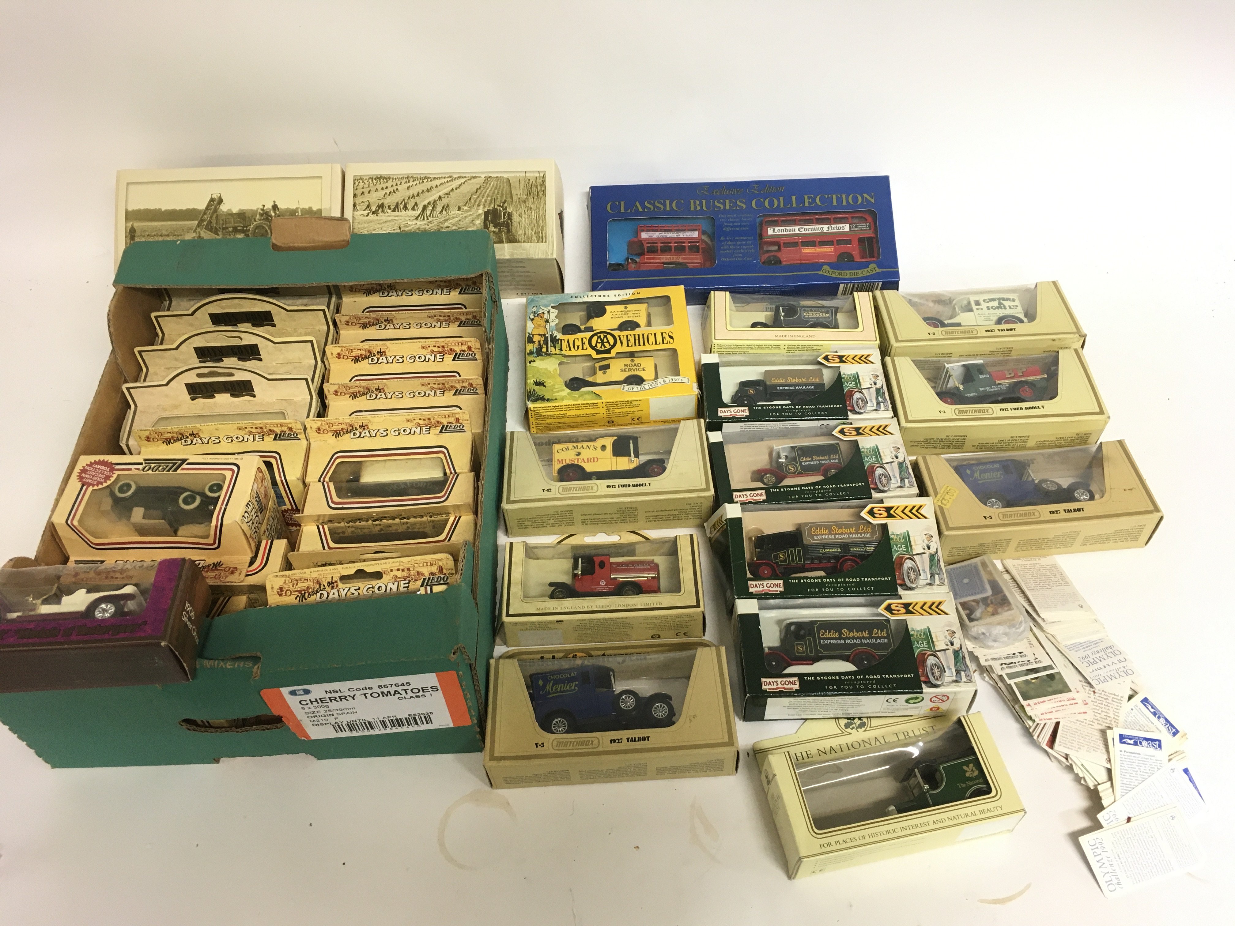 A collection of boxed die cast vehicles including days gone and matchbox. Also including some cigarette cards. NO RESERVE
