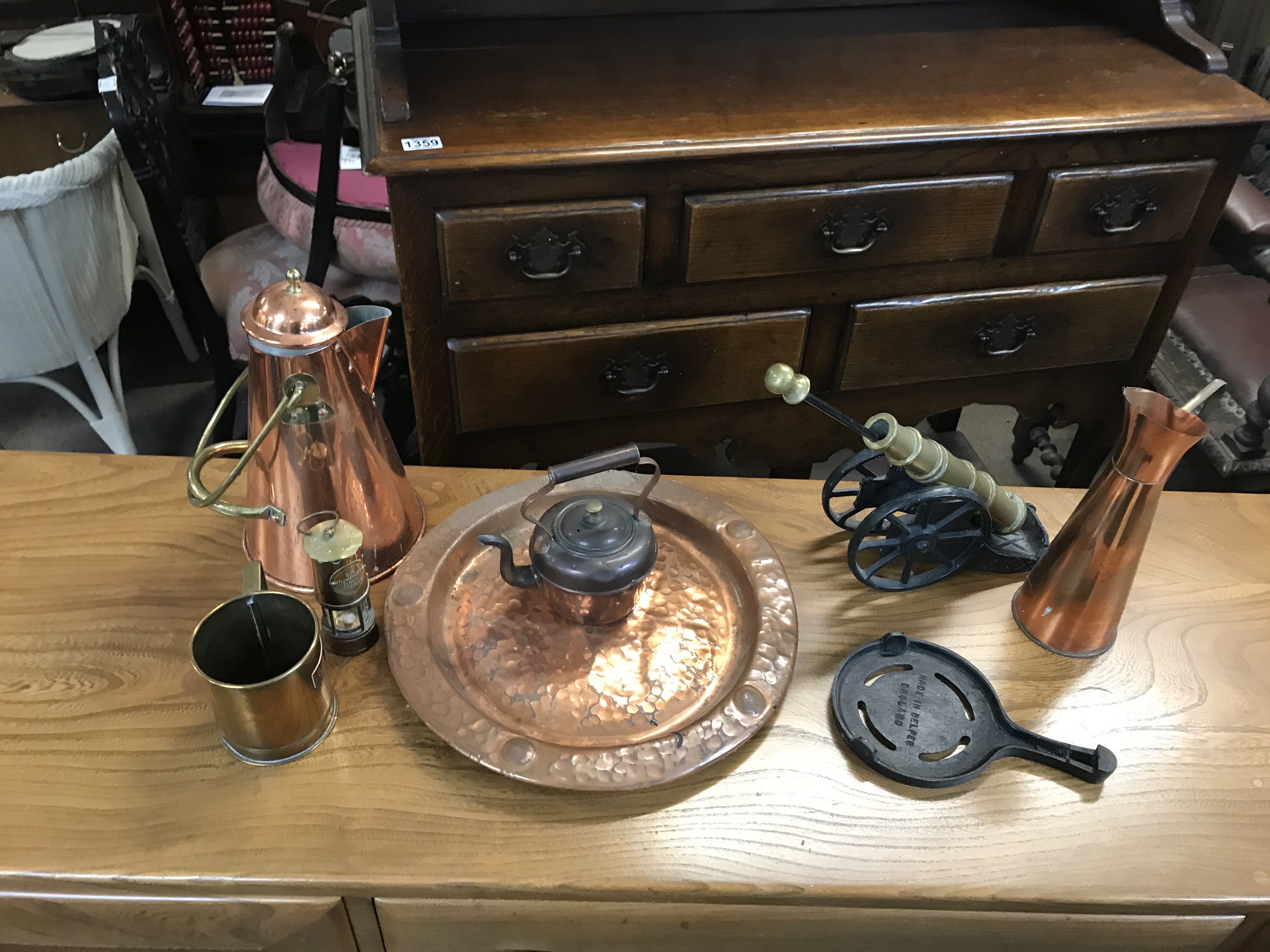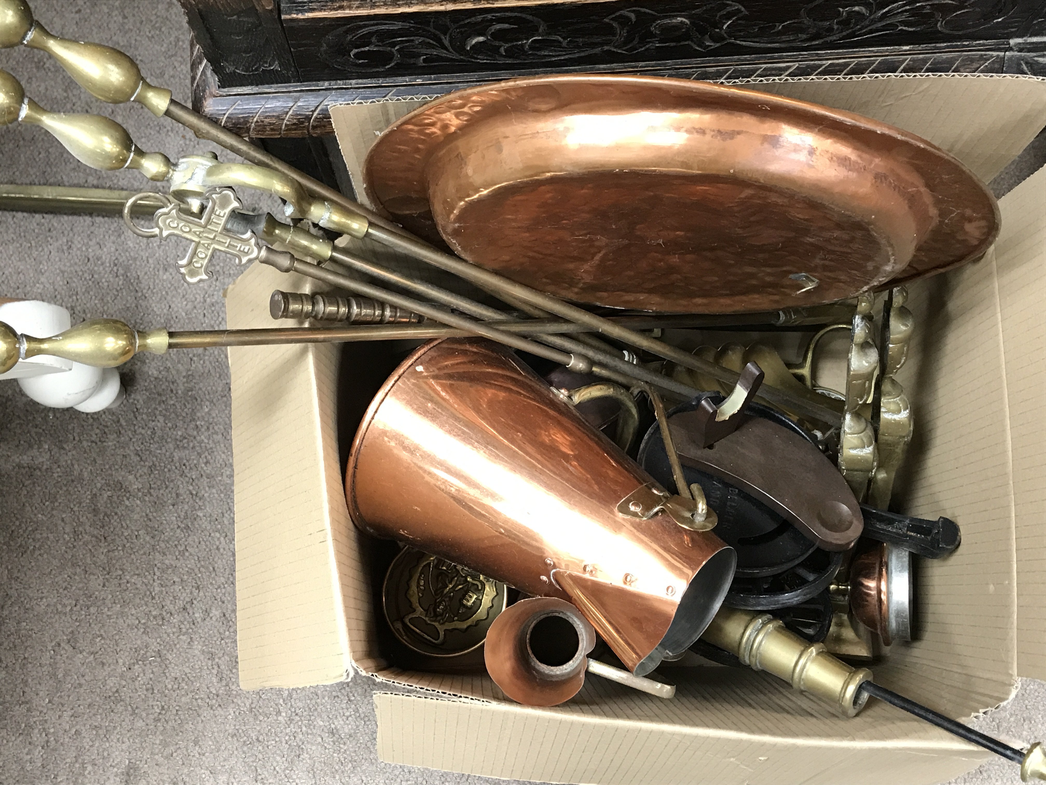 A quantity of brass and copper ware and ornaments including fire irons, coal bucket, brass and cast iron cannon .this lot cannot be posted. NO RESERVE
