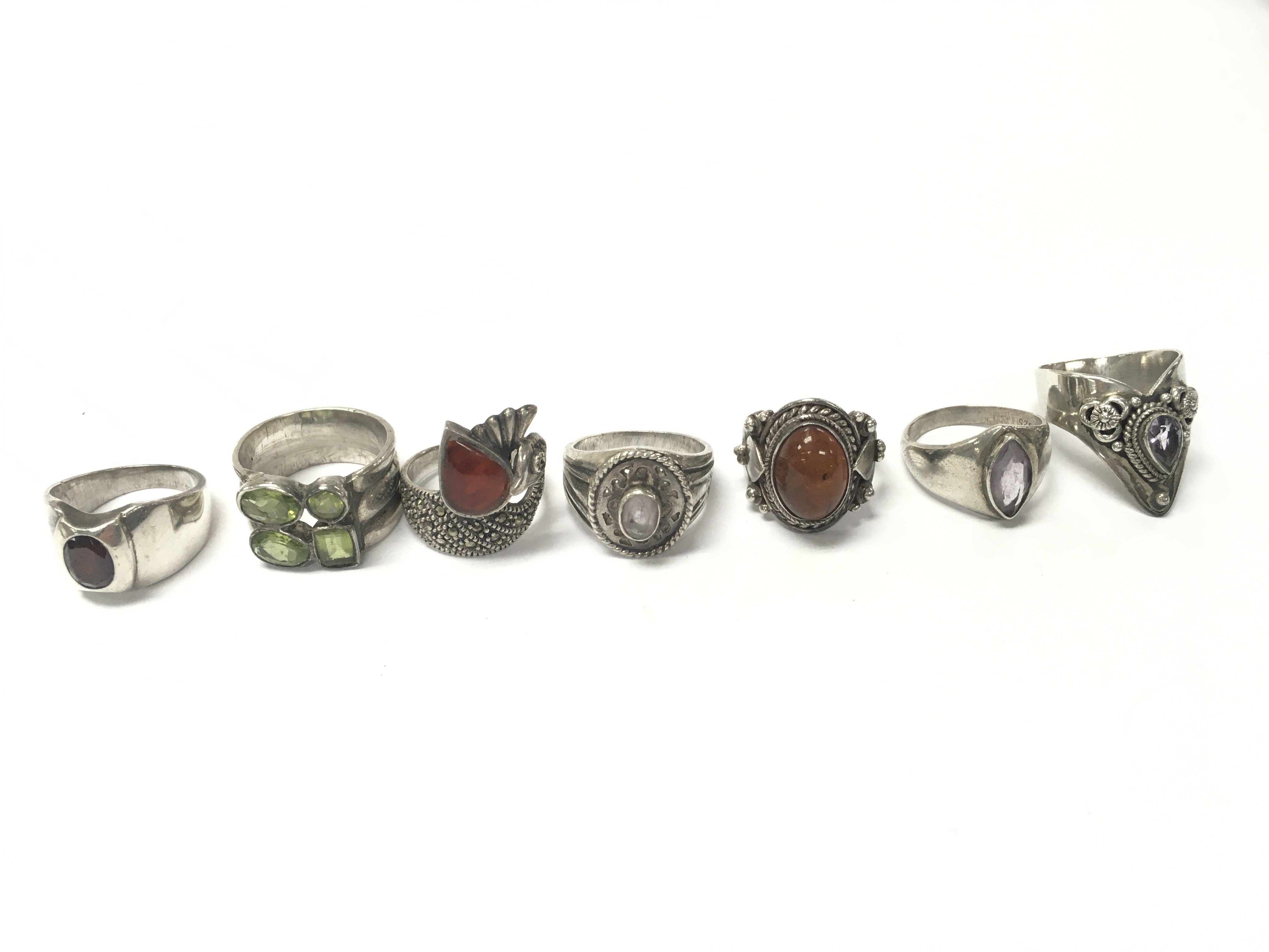 7 silver rings set with asssorted stones. 49.29g total. Postage A