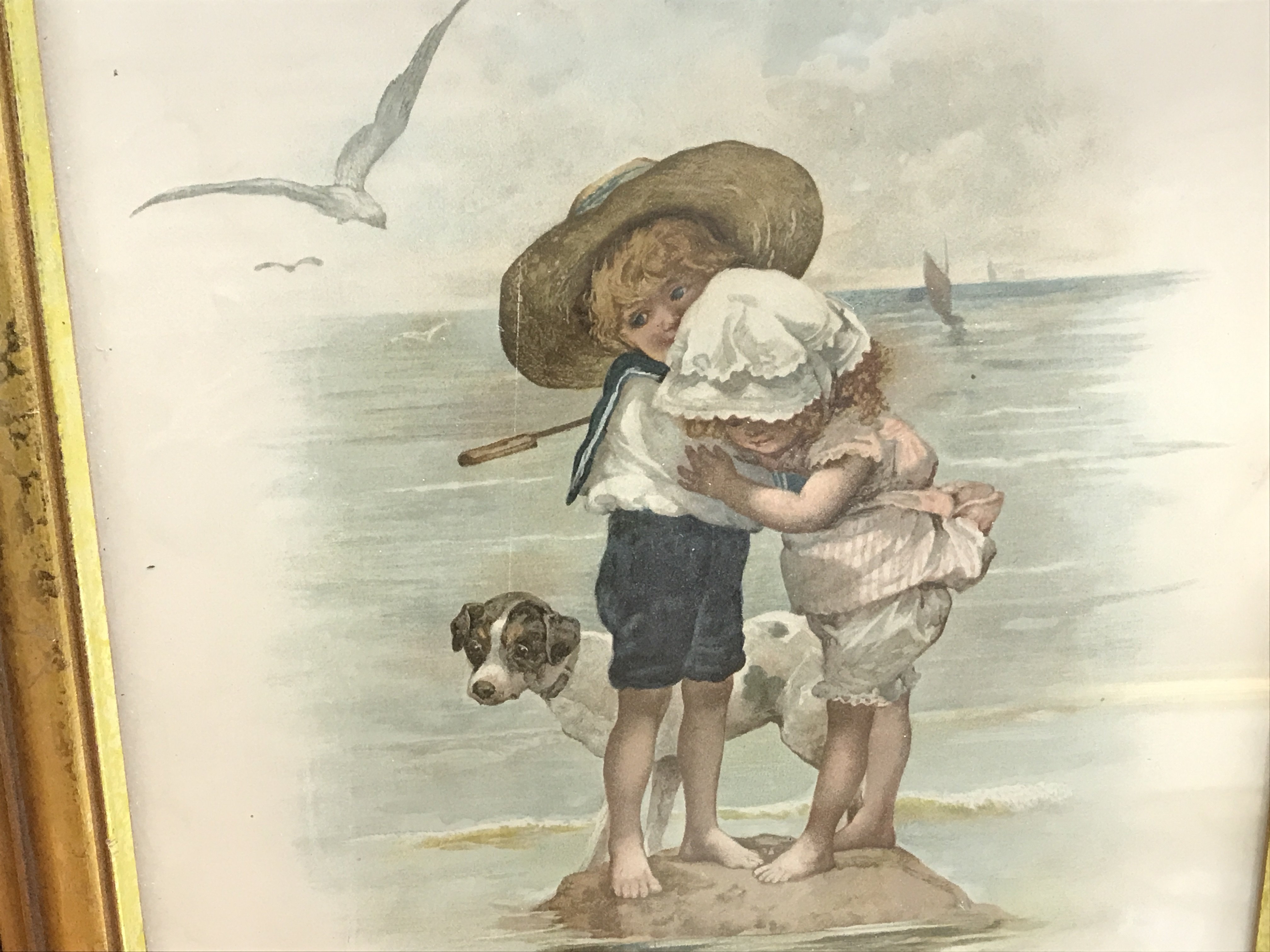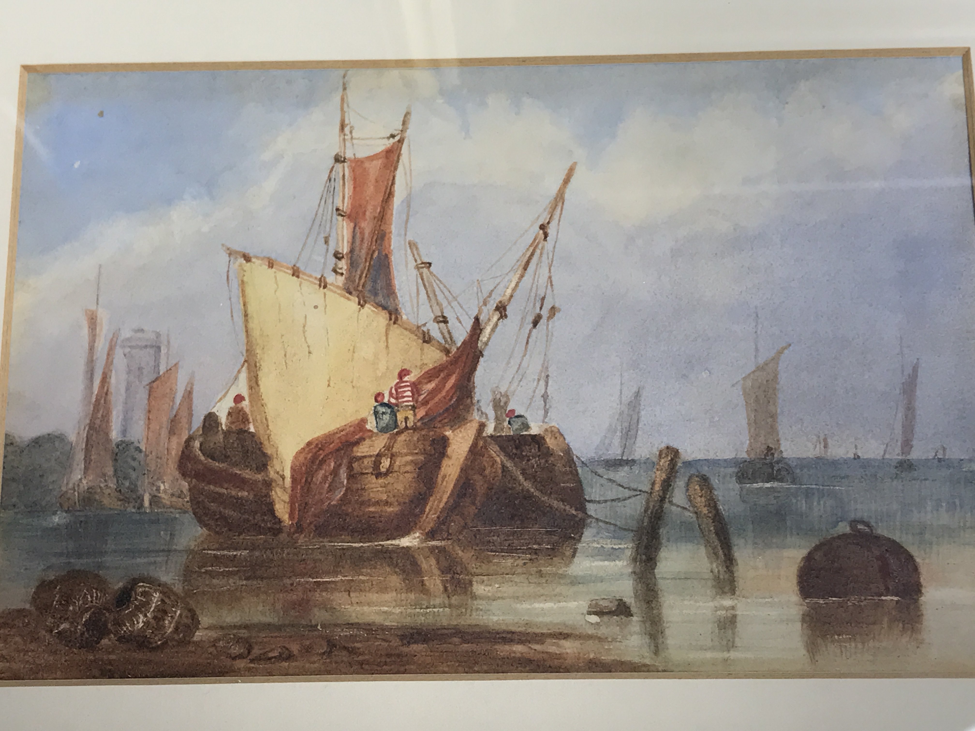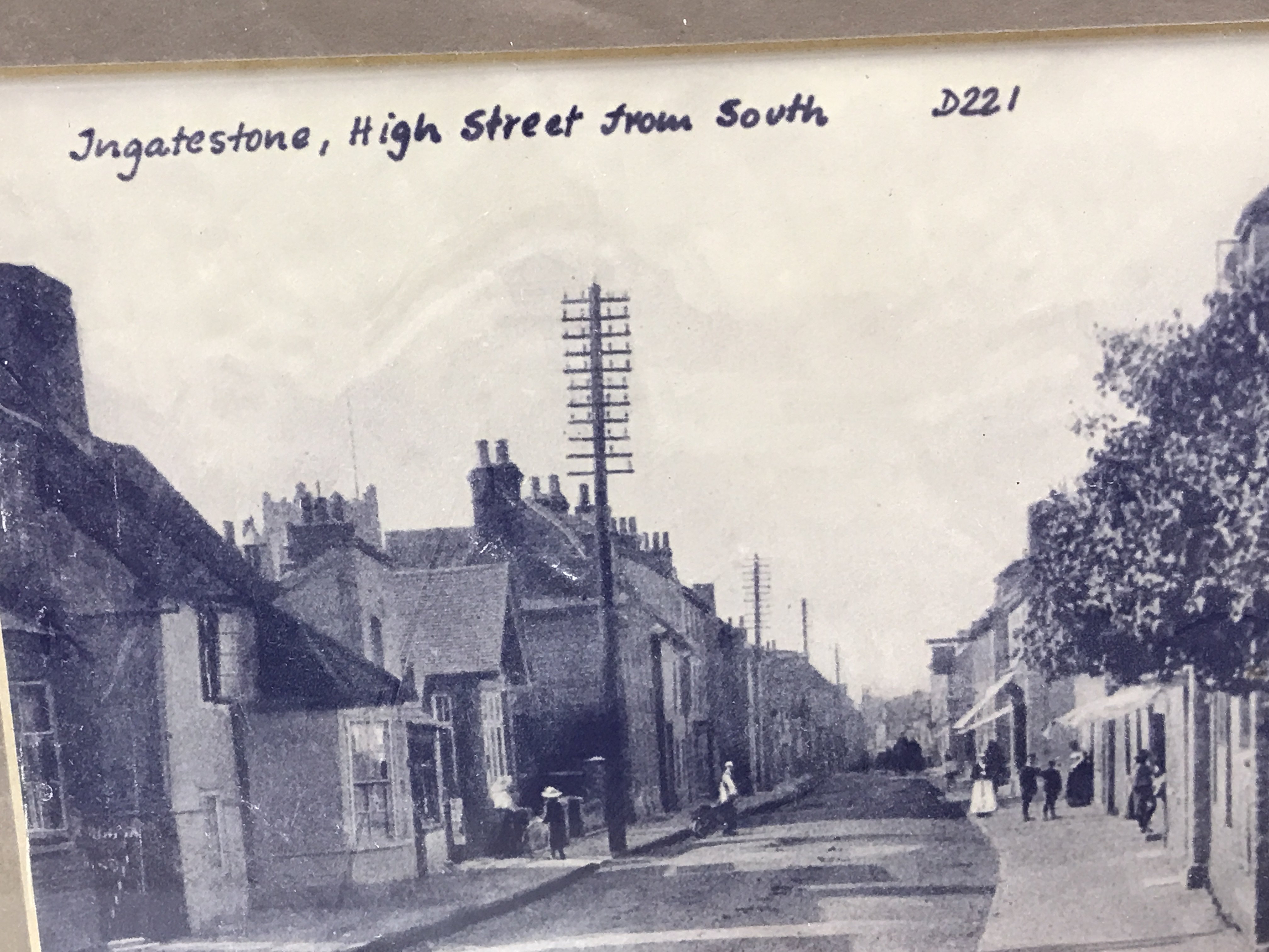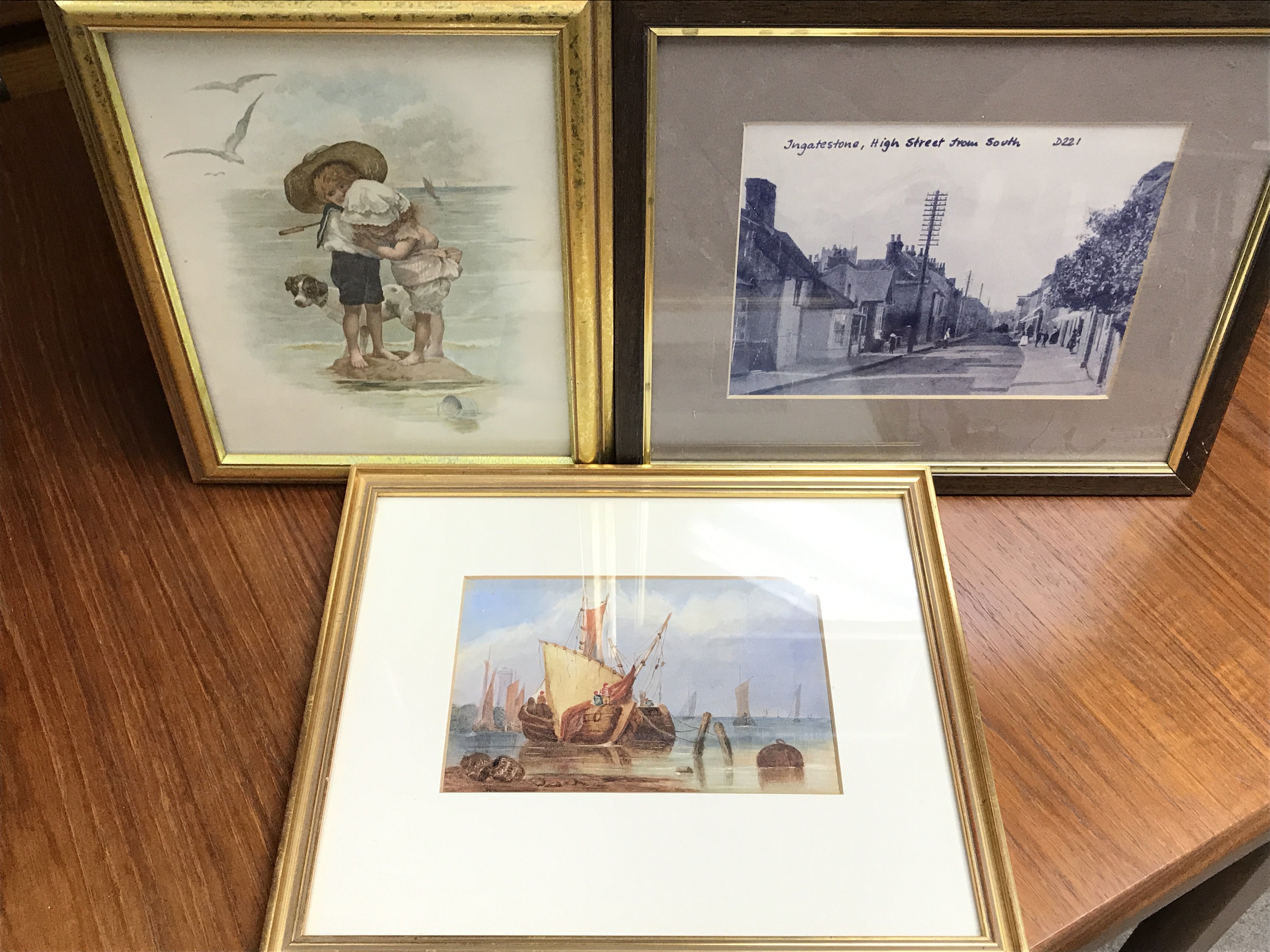 Framed pictures including a vintage photograph of Ingatestone high street, a watercolour of a sail ship, a Lithograph Print of a boy and a girl as the seaside. This lot cannot be posted. NO RESERVE
