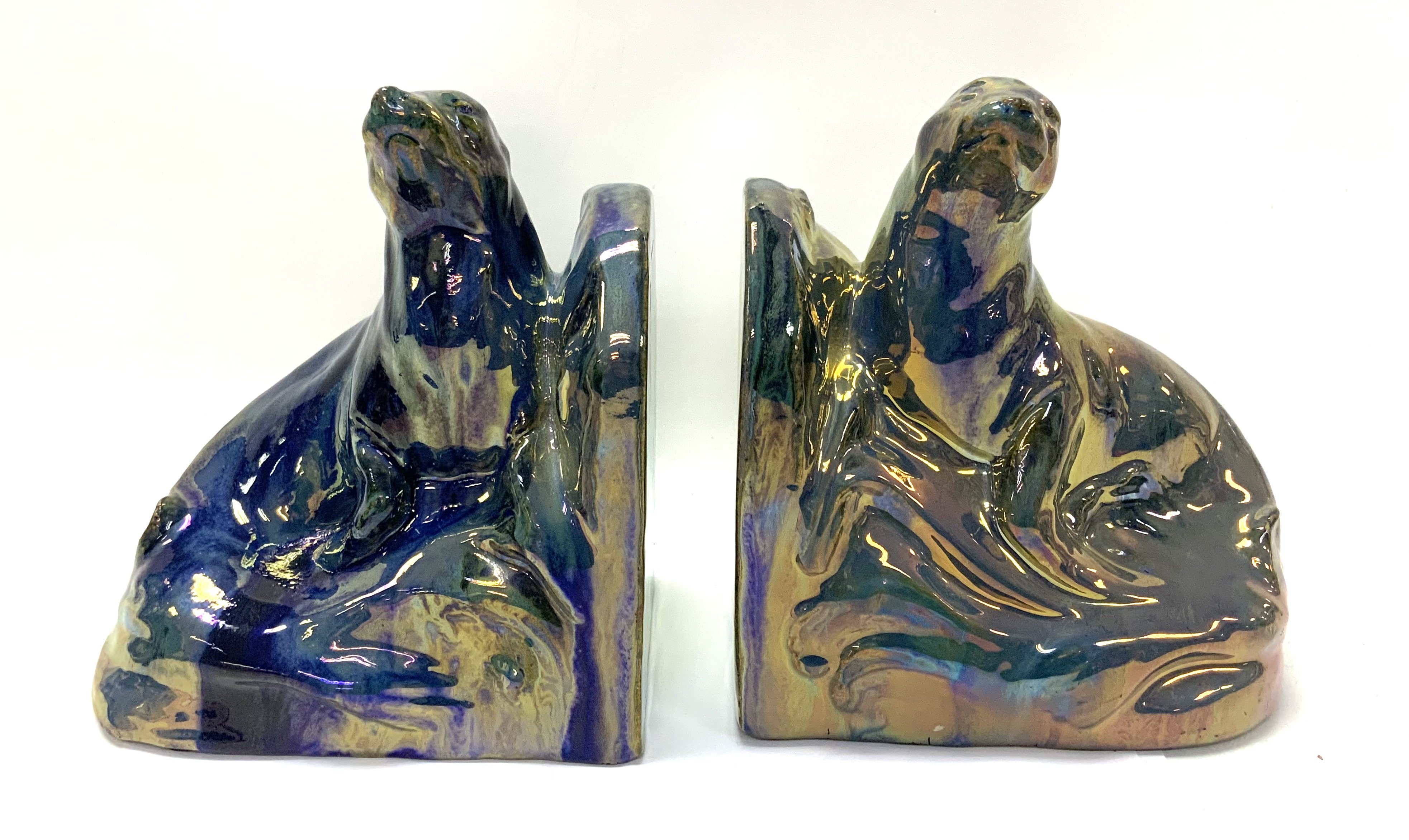 A pair of Art Deco bookends in the form of two ceramic basking seals by Alphonse Cytères (1851-1941) for Rambervillers, Vosges.