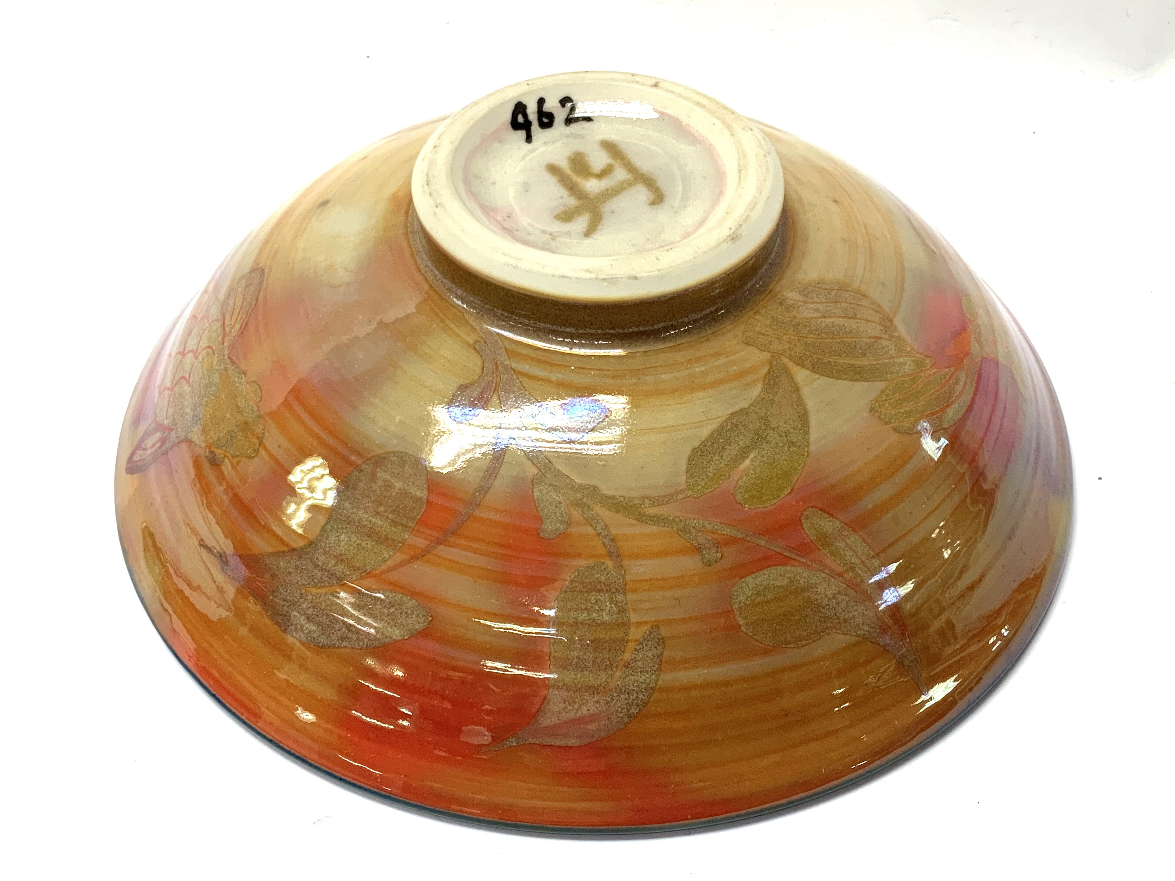 A Jonathan Chiswell-Jones lustre porcelain bowl, decorated in silver lustre with orange ground, dragonfly and foliage, 16cm x 5.5cm. NO RESERVE