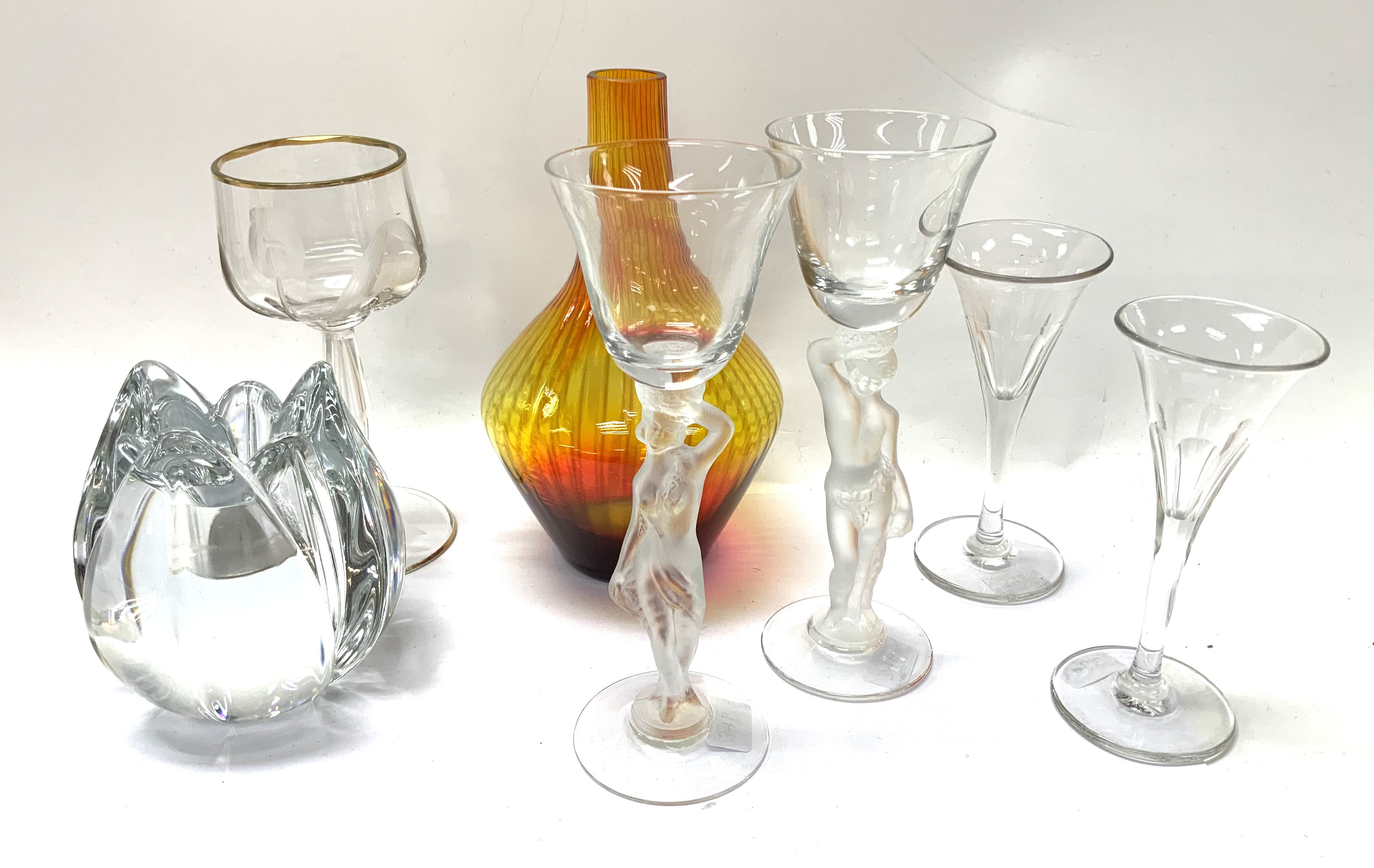 Group lot (7). Daum crystal candle holder, 2 Heinrich Hoffman lady stem glasses, Pair of Victorian port glasses, A Harrach Intaglio cut glass and gilt rimmed glass, c1890, Jan Gabrhel for Chlum u Trebone garnet hand blown vase, 16.5cm. (D In-house postage is not available for this lot).
